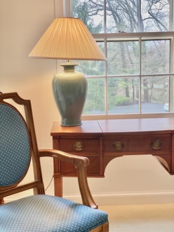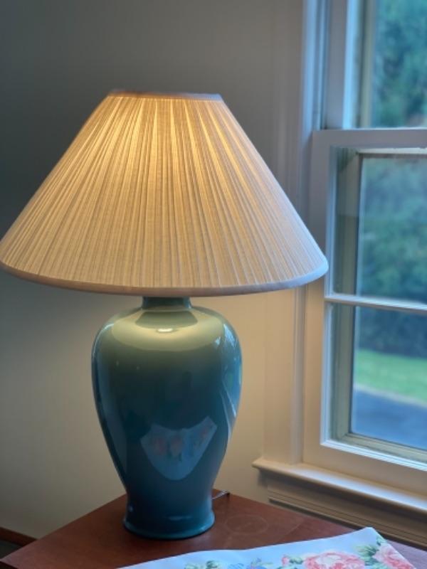 Large simple blue heavy ceramic lamp with crisp pleated shade. Measures 28 x 17 across lamp base, 19” across shade, 29” tall altogether.