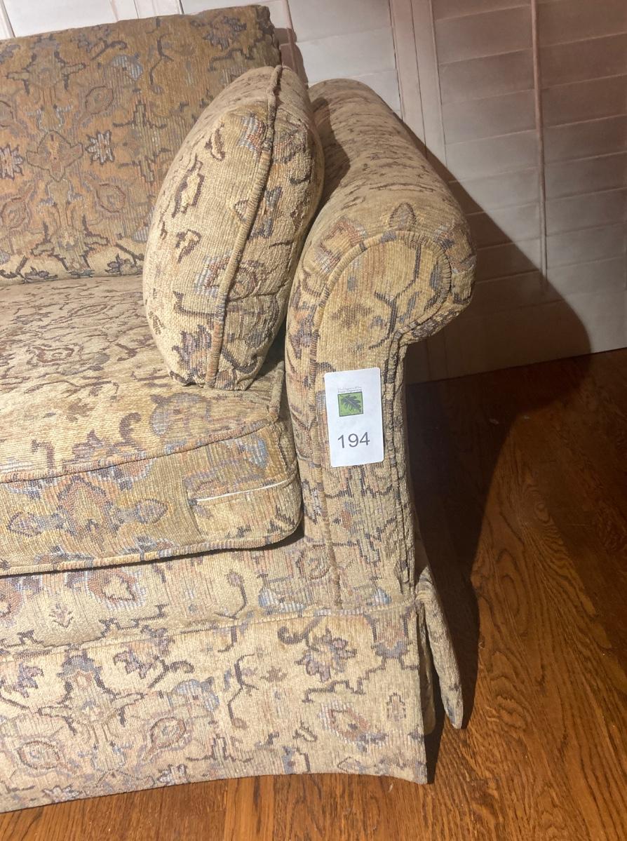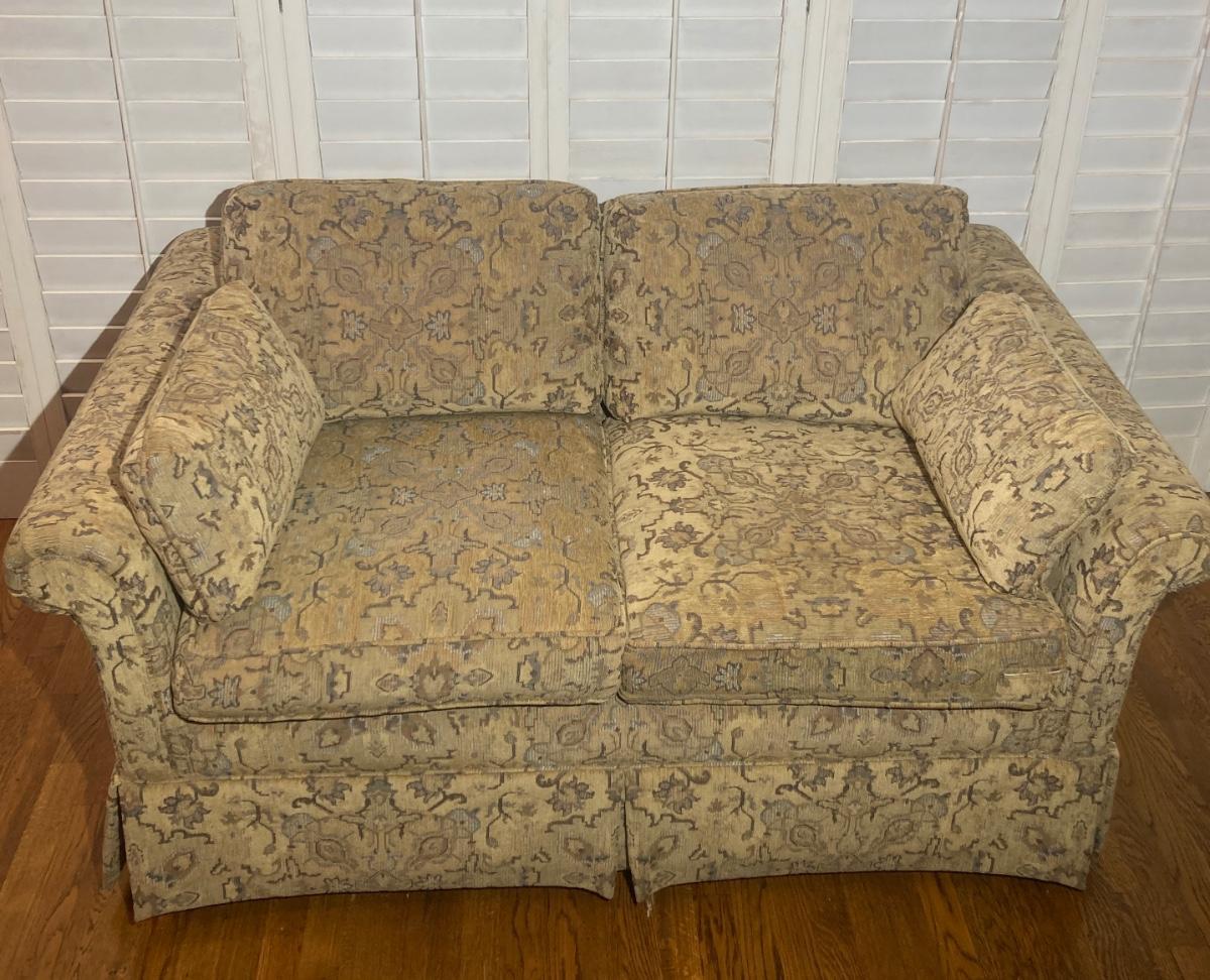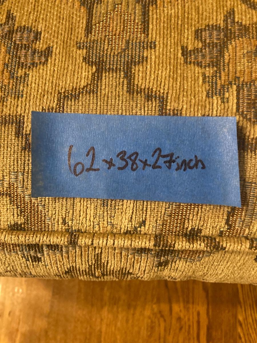 Gold loveseat seats 2 people. 62" x 38" x 27"