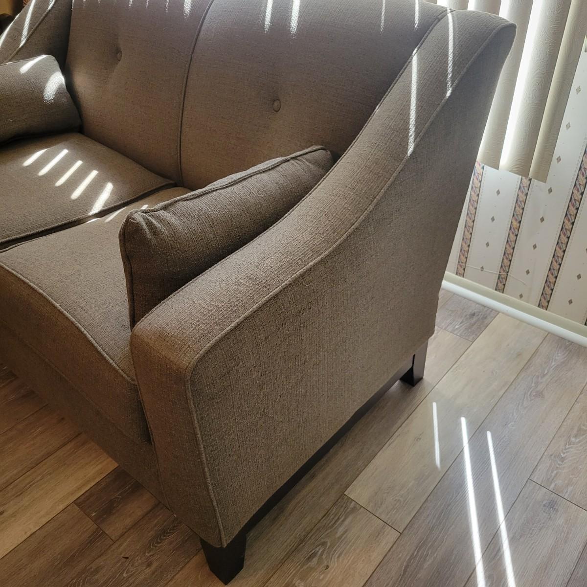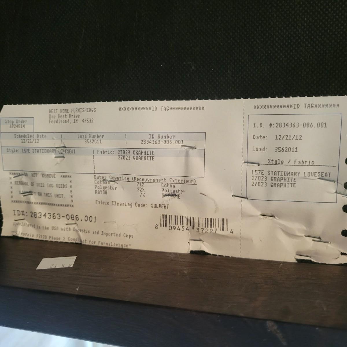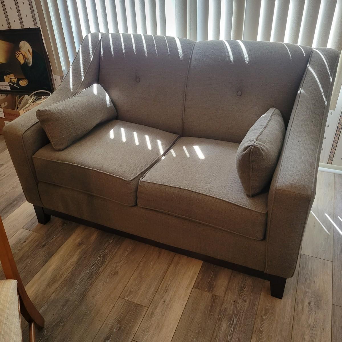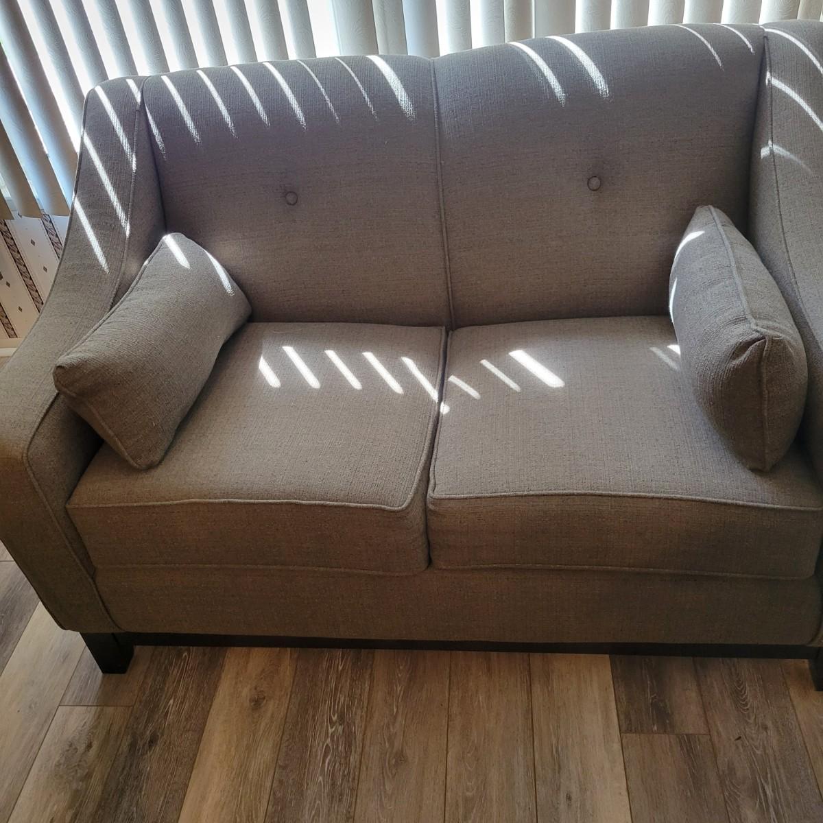 An upholstered loveseat in a graphite grey color that includes two matching pillows. It measures approximately 57" x 35" x 35"H with a seat height of 20". Tag states it is from Best Home Furnishings. Local pickup only. Winning bidder must bring assistance to help move and load this item due to its weight and/or size.