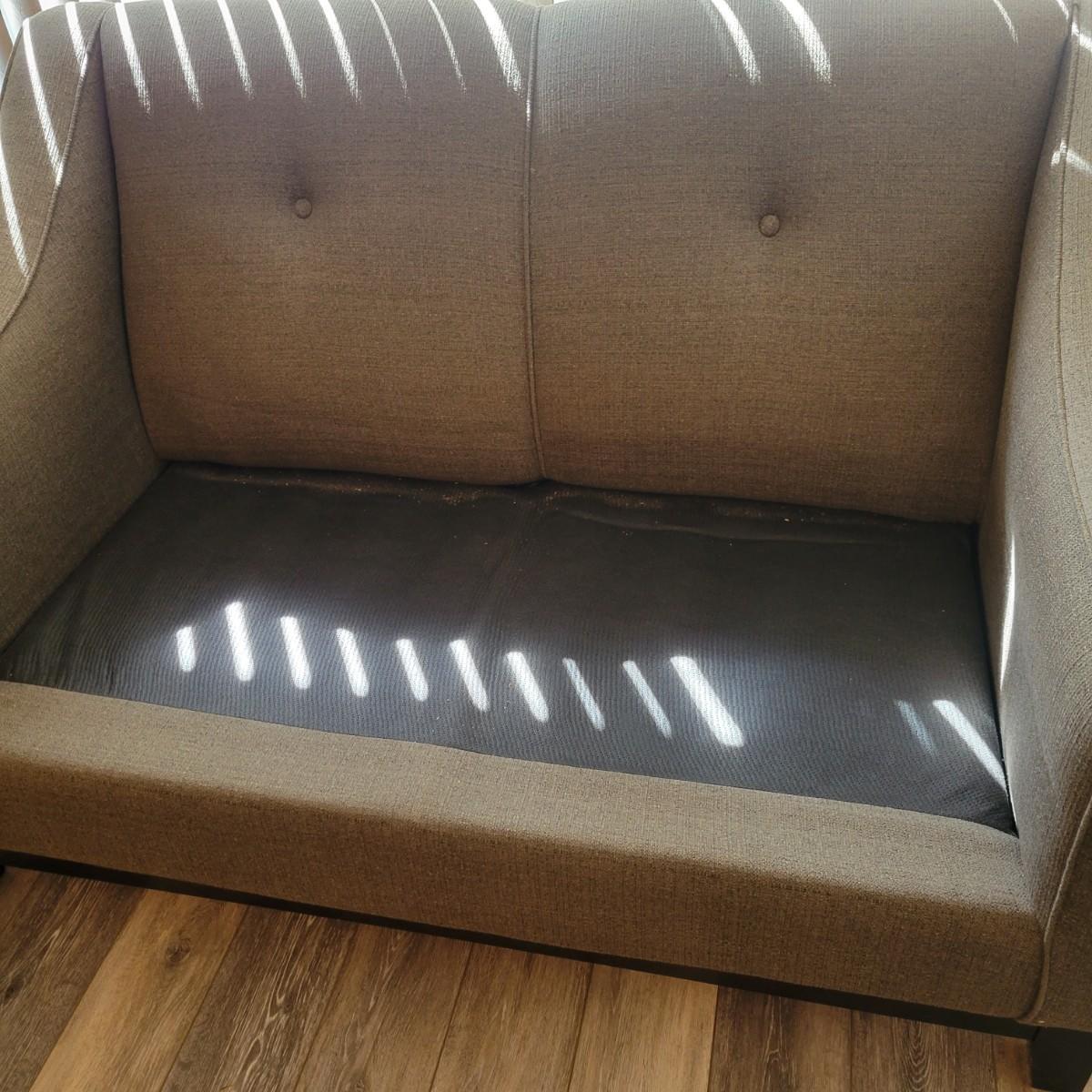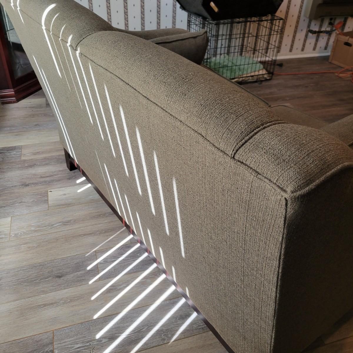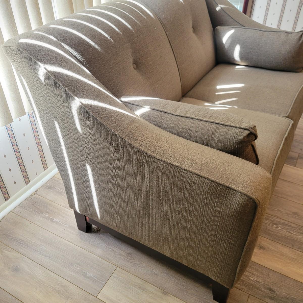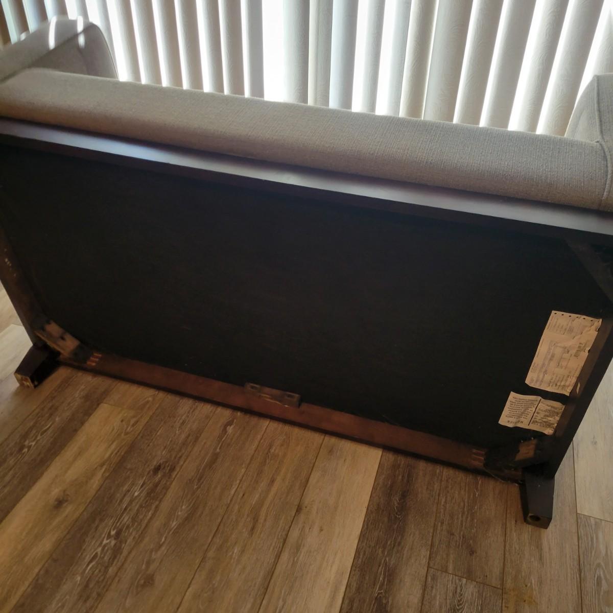 An upholstered loveseat in a graphite grey color that includes two matching pillows. It measures approximately 57" x 35" x 35"H with a seat height of 20". Tag states it is from Best Home Furnishings. Local pickup only. Winning bidder must bring assistance to help move and load this item due to its weight and/or size.