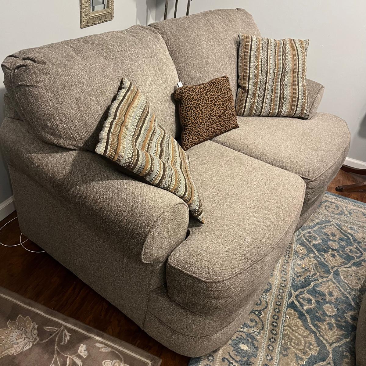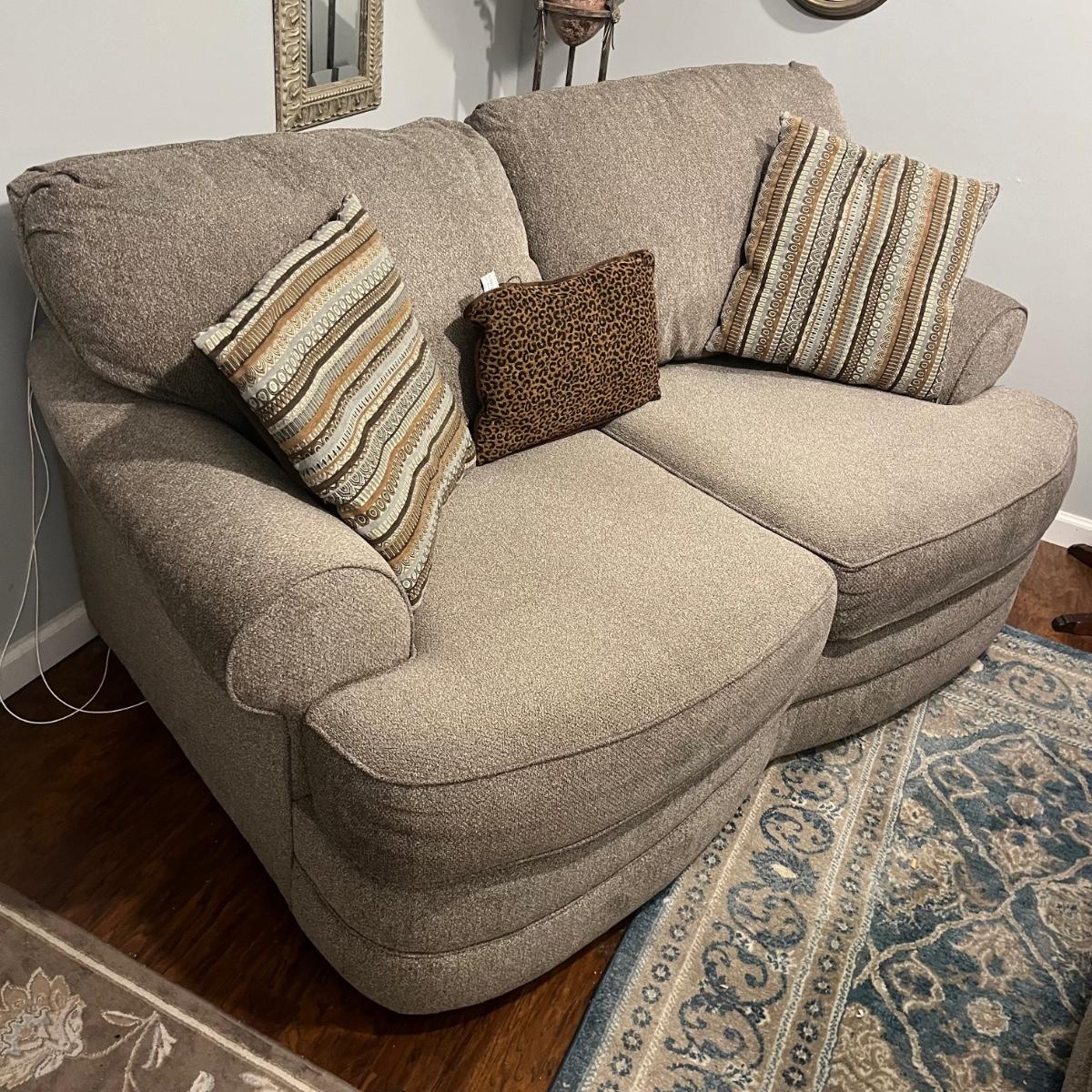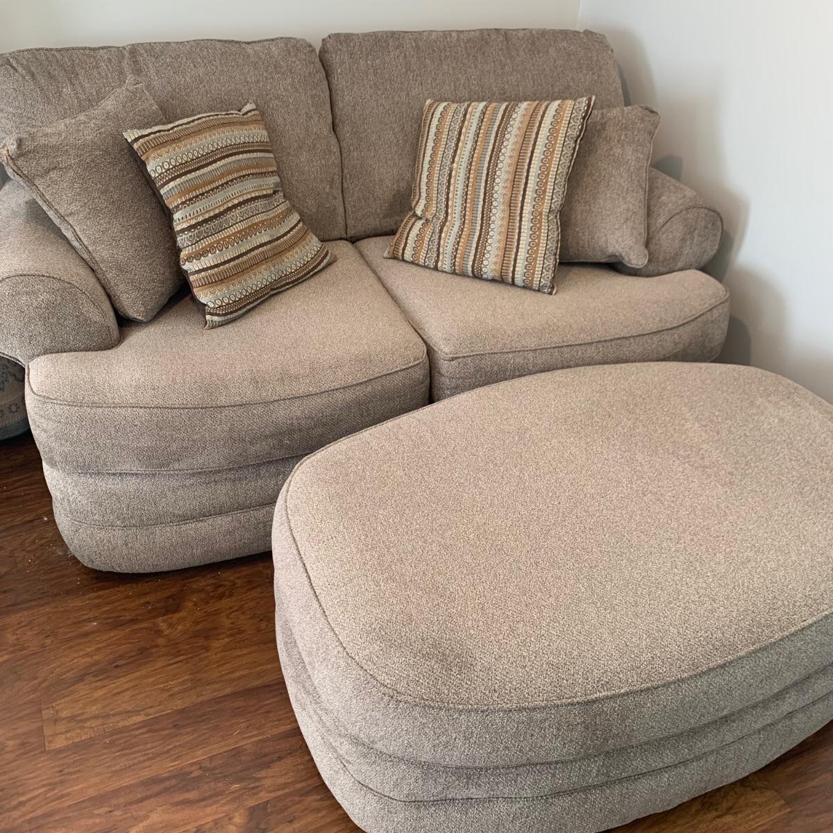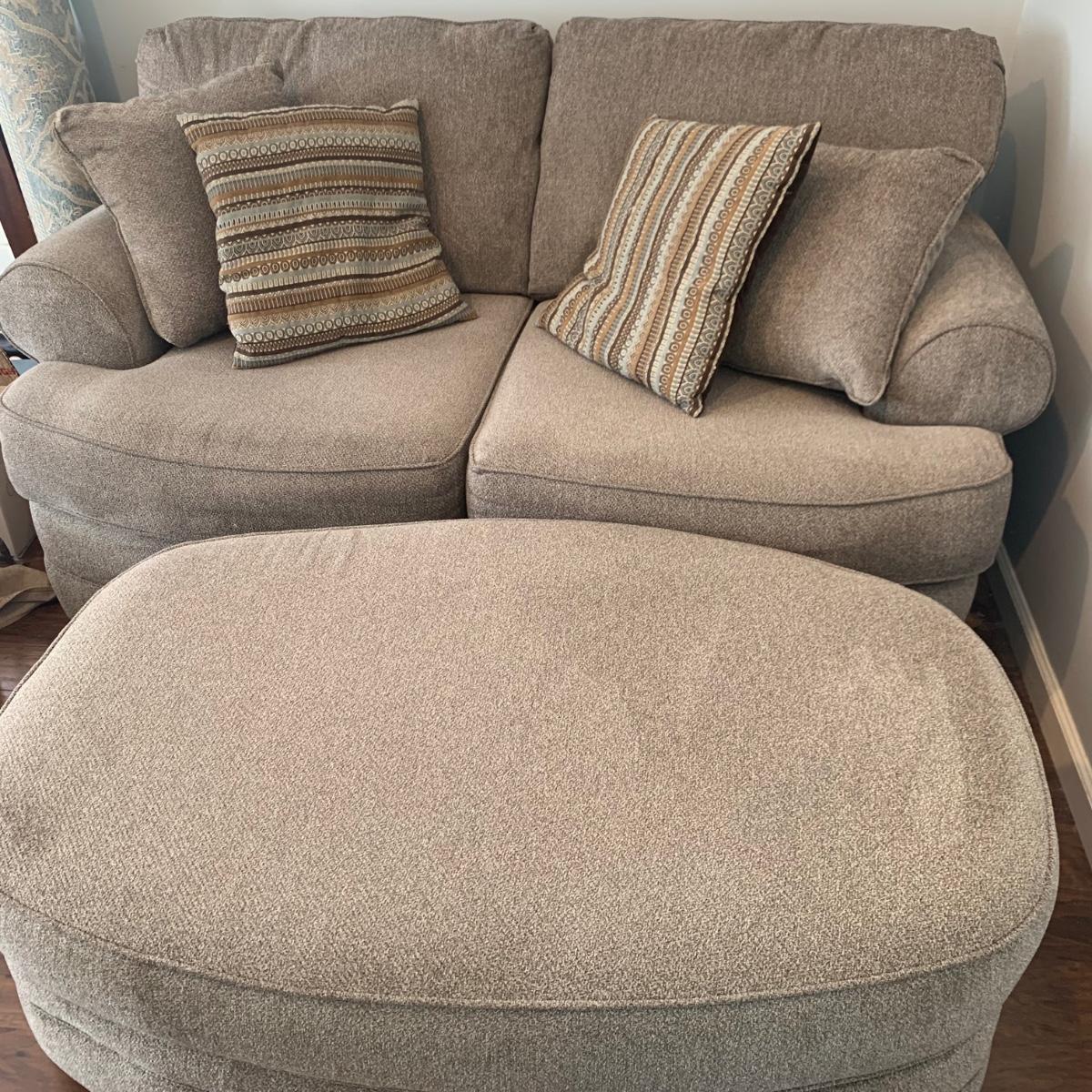 Lot includes a soft grey fabric covered matching loveseat and ottoman with four throw pillows (two grey and two striped; not the leopard print that appears in some of the photos. Loveseat measures 44” x 72” x 37”H with a 20” seat height.