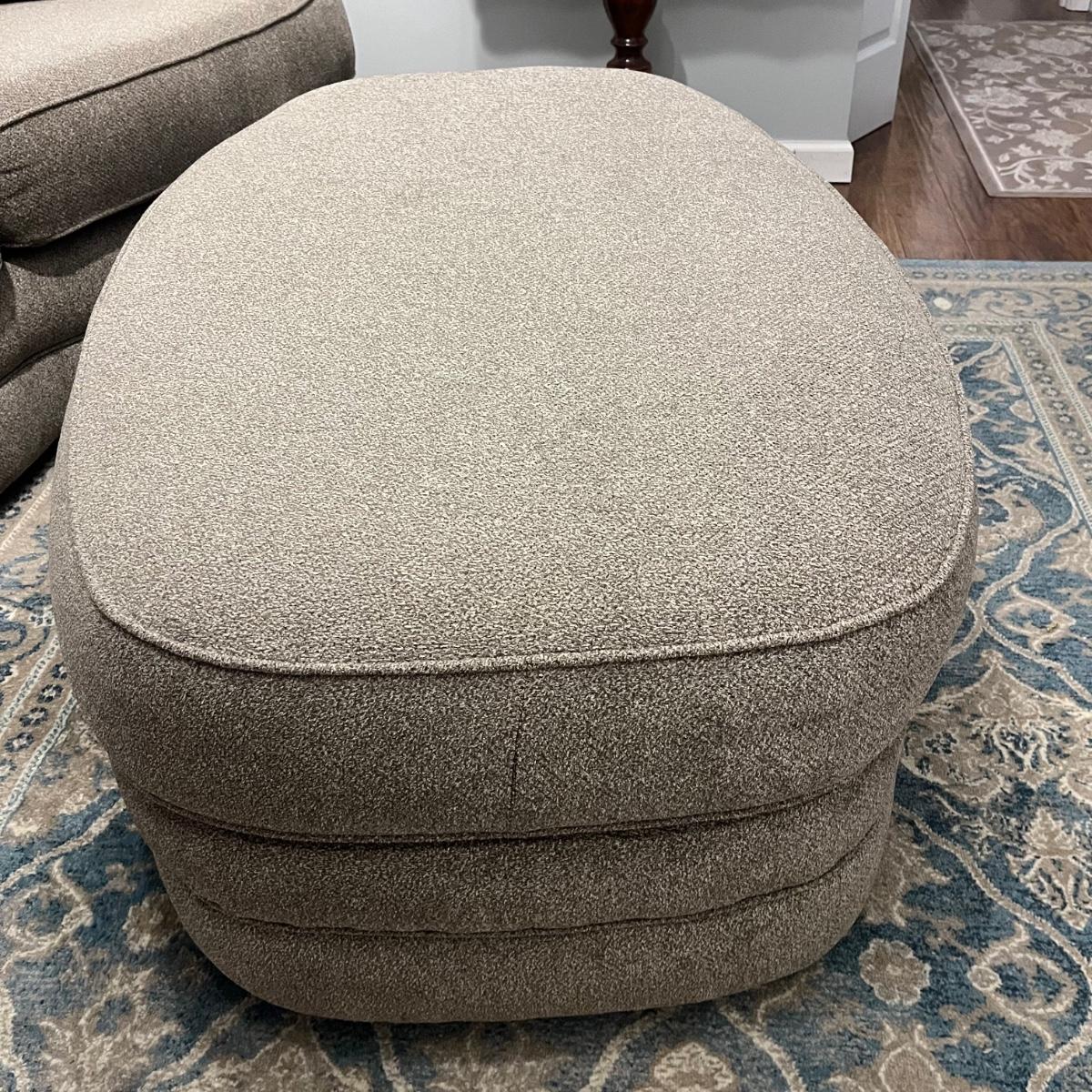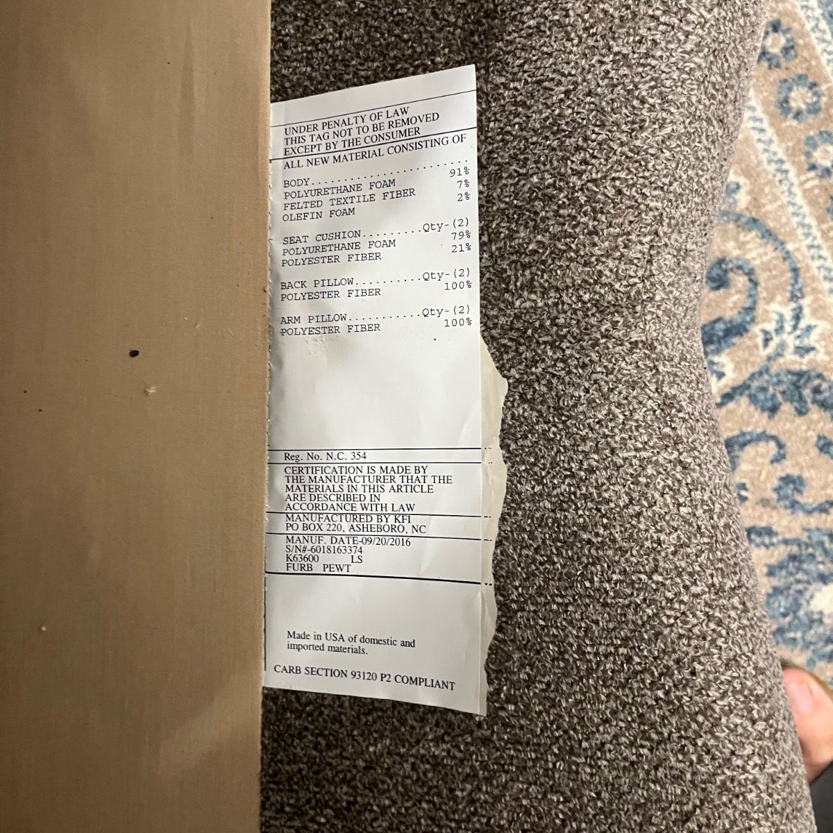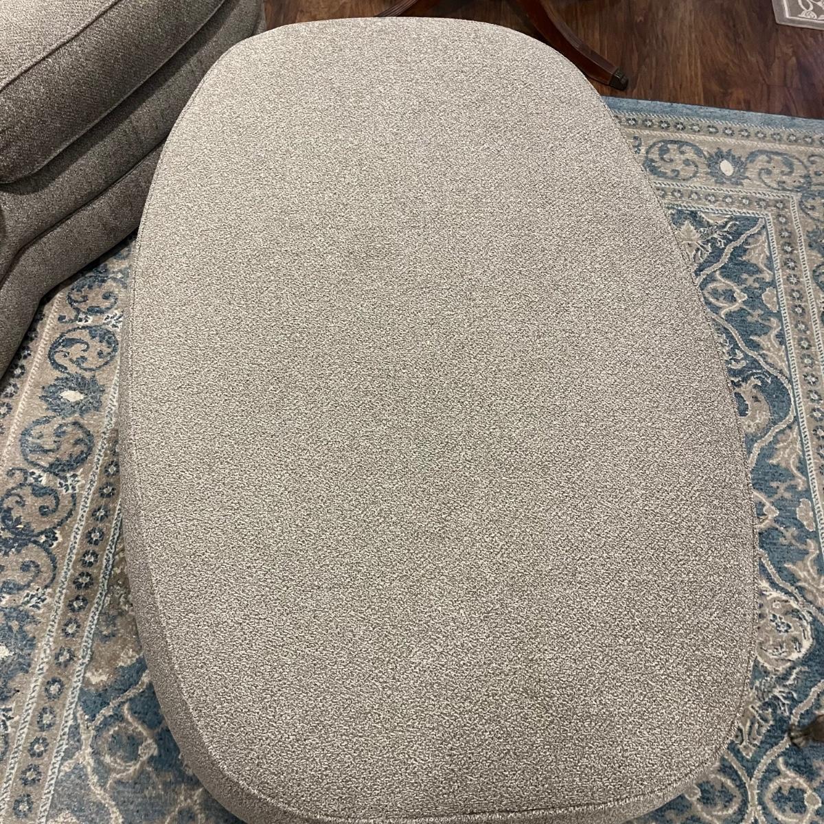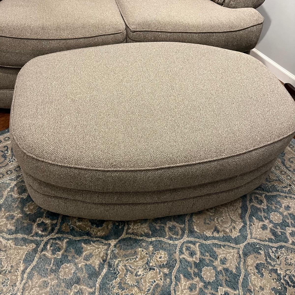 Lot includes a soft grey fabric covered matching loveseat and ottoman with four throw pillows (two grey and two striped; not the leopard print that appears in some of the photos. Loveseat measures 44” x 72” x 37”H with a 20” seat height.