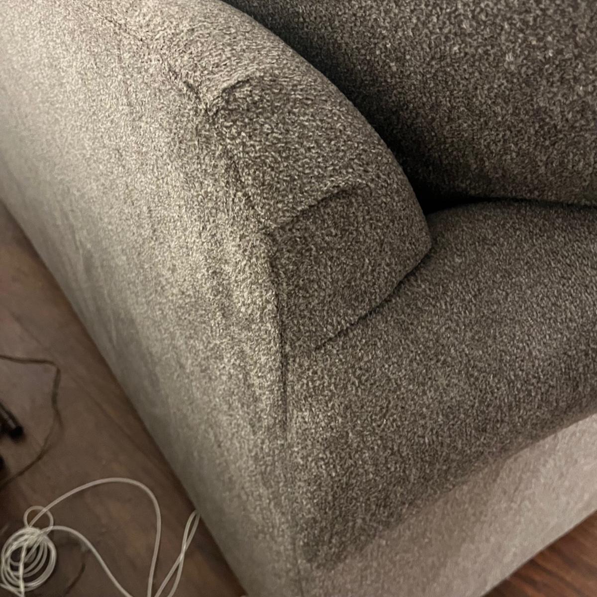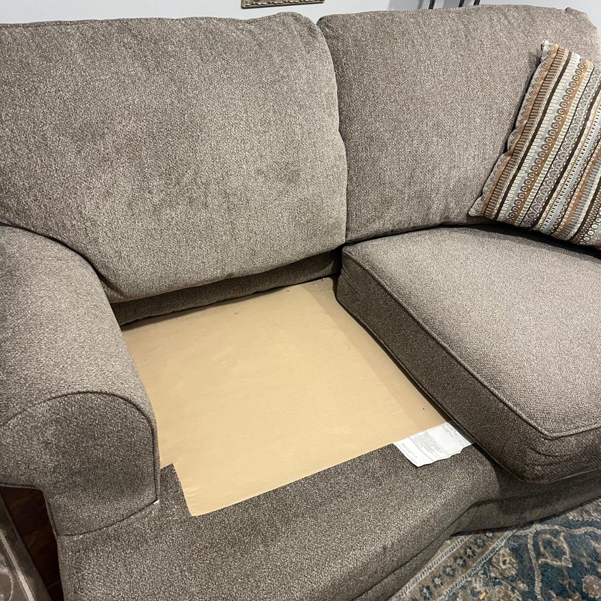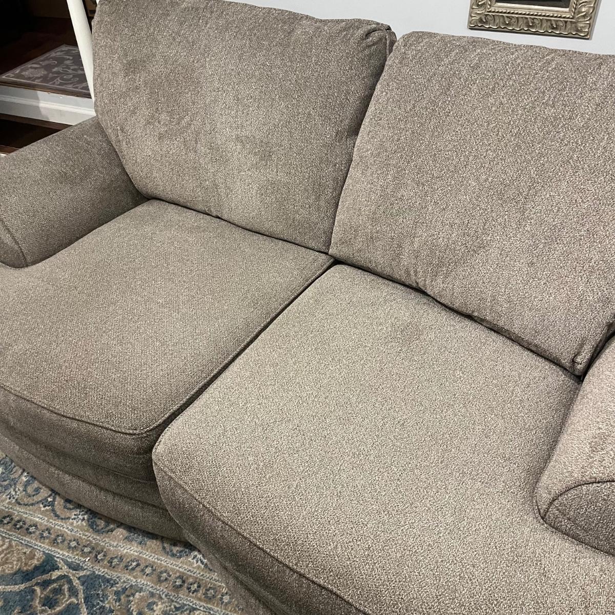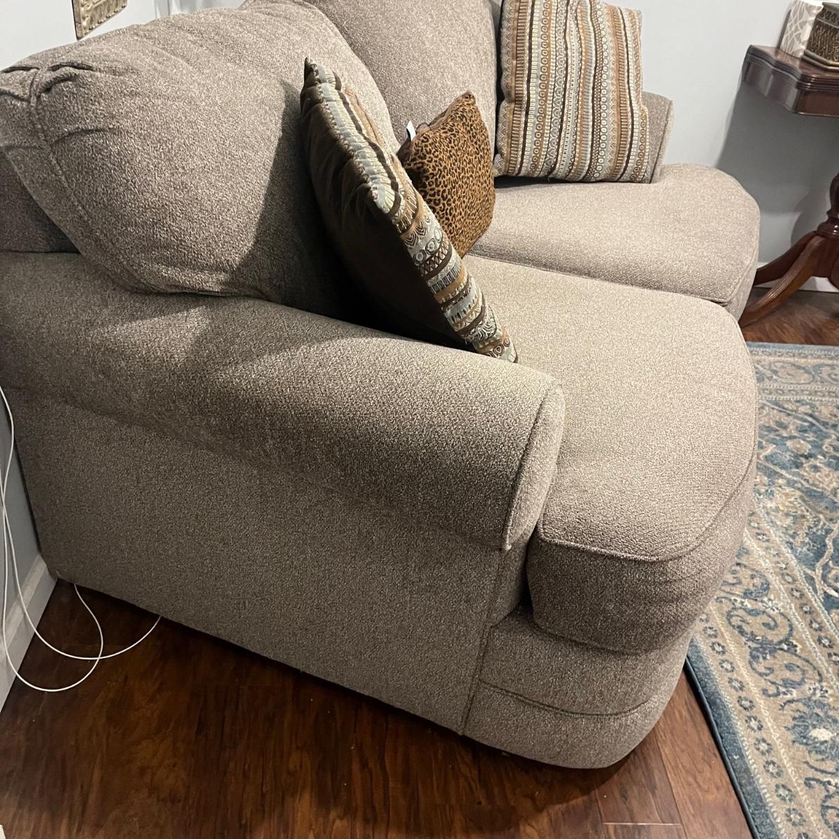 Lot includes a soft grey fabric covered matching loveseat and ottoman with four throw pillows (two grey and two striped; not the leopard print that appears in some of the photos. Loveseat measures 44” x 72” x 37”H with a 20” seat height.