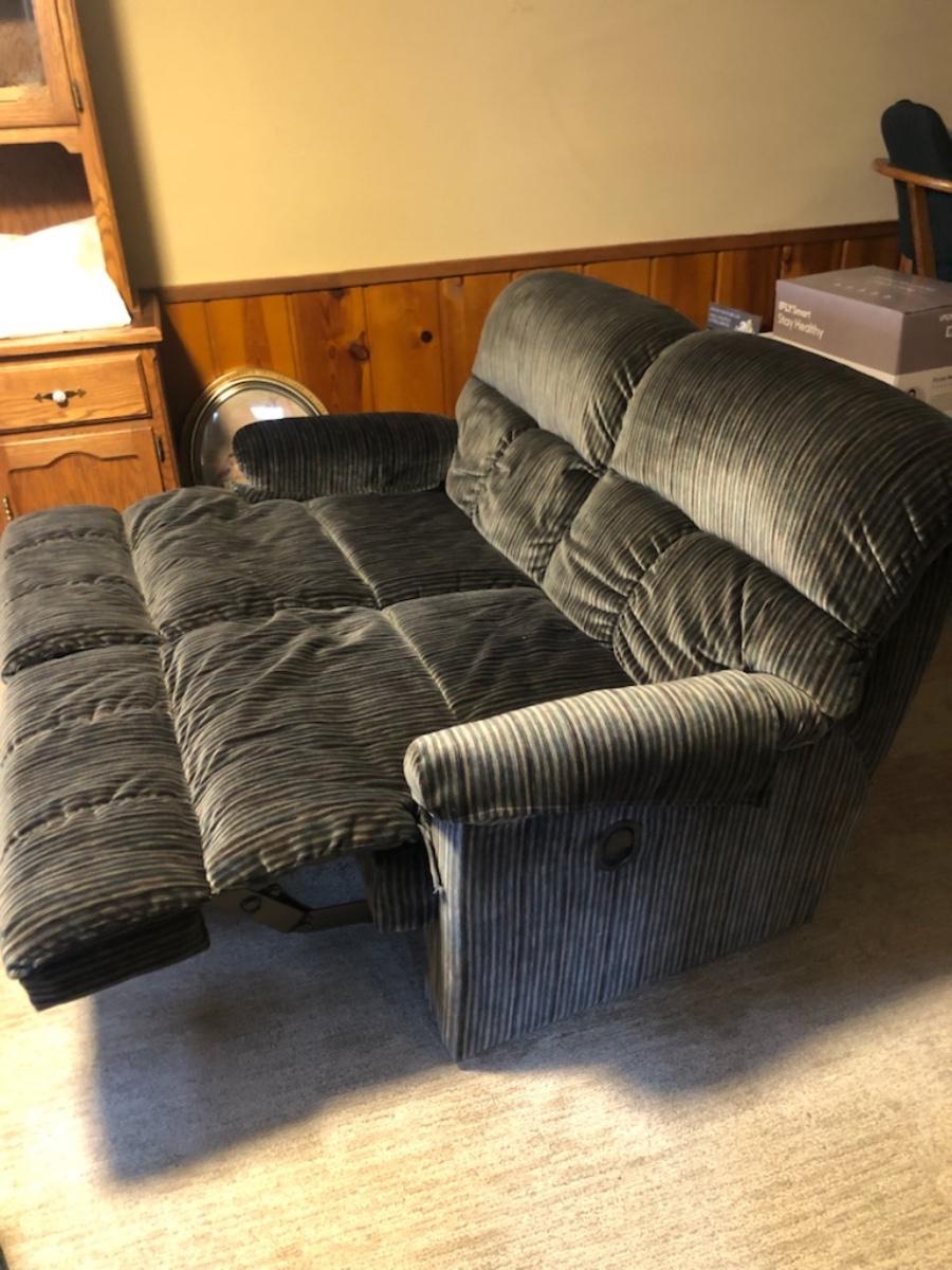 Blue loveseat with 2 reclining seats