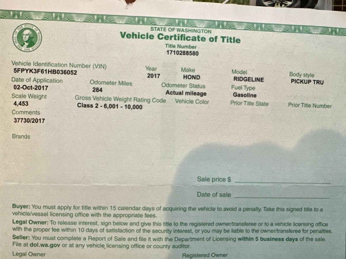 Fantastic 2017 Honda Ridgeline Crew Cab pickup truck from a Redmond estate. - One Owner. Only 13,004 miles! Includes spare tire and roadside kit in rear storage trunk. Owner used this as his 'drive around town' truck. Stored in an enclosed garage when it wasn't in use. When we started the vehicle in December of 2022 it was running great. Includes 2 key fobs. We have all the appropriate paperwork and documentation for the vehicle (image of vehicle title is provided, and buyers are encouraged to search the vehicle history, where they will find no previous accidents or issues). Clean no smoking vehicle.