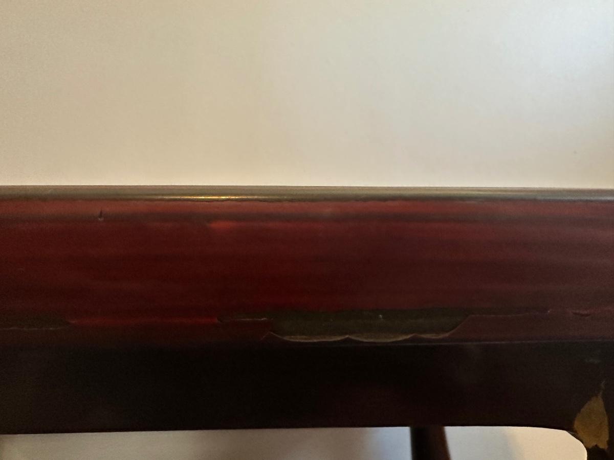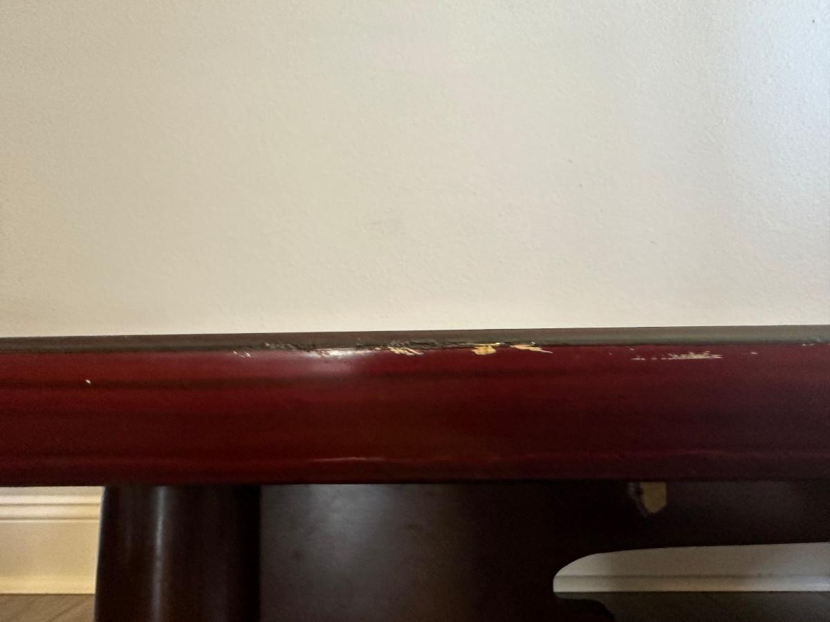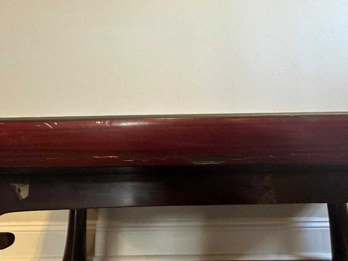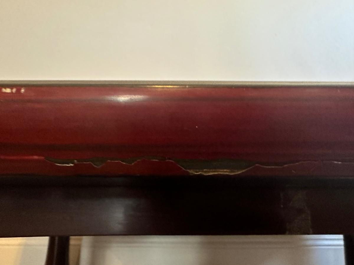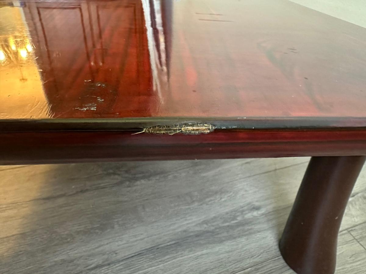 Coffee table has wear. The edges have some chipping and one leg is slightly loose.