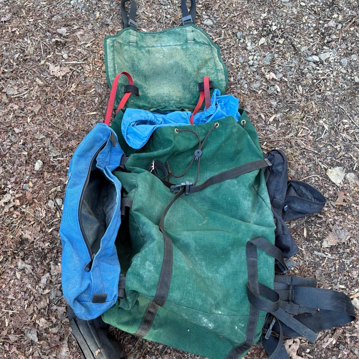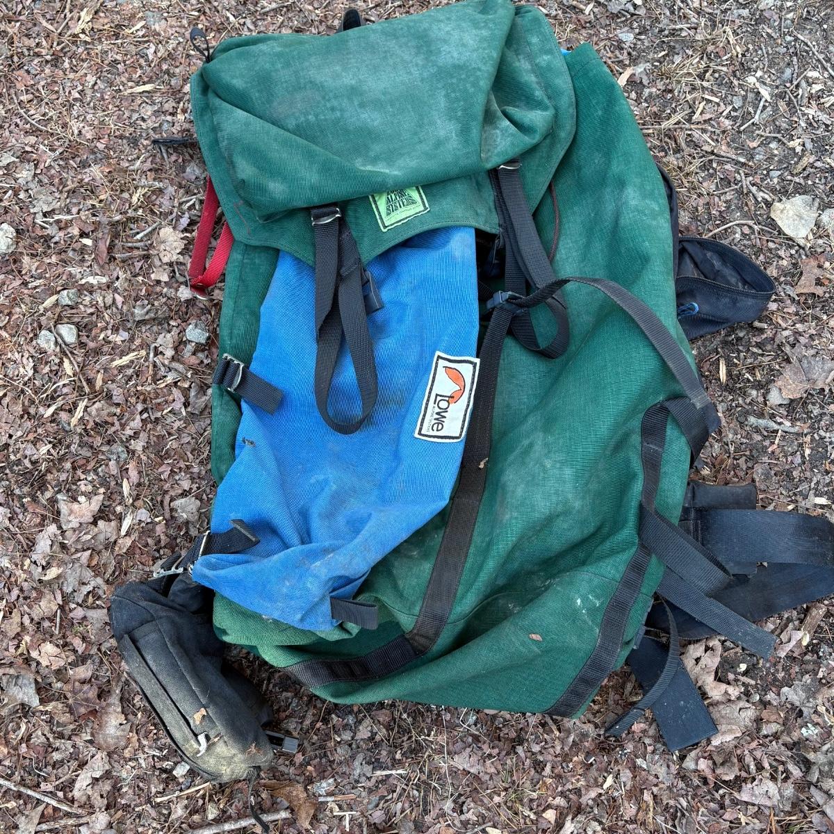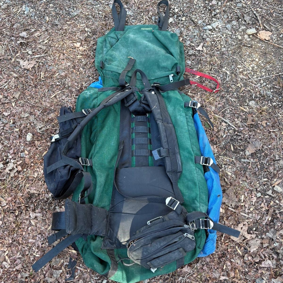 Well-loved pack measures approx. 19” x 29”. Multiple pockets, padded hip rests. Some wear but plenty of life left. Slight mildew smell.