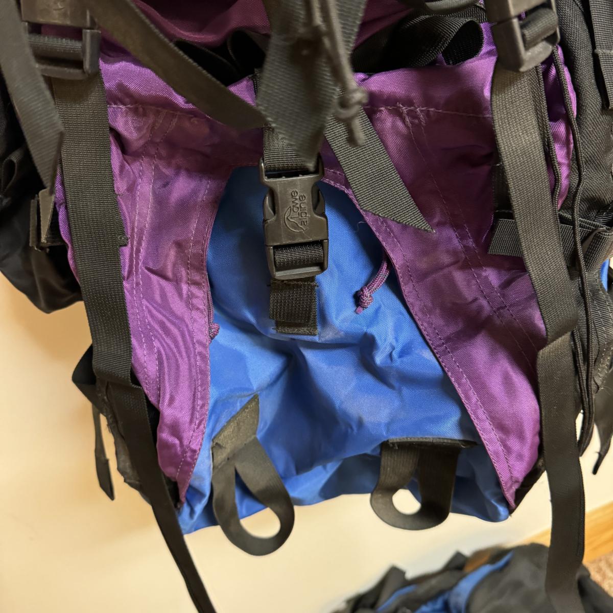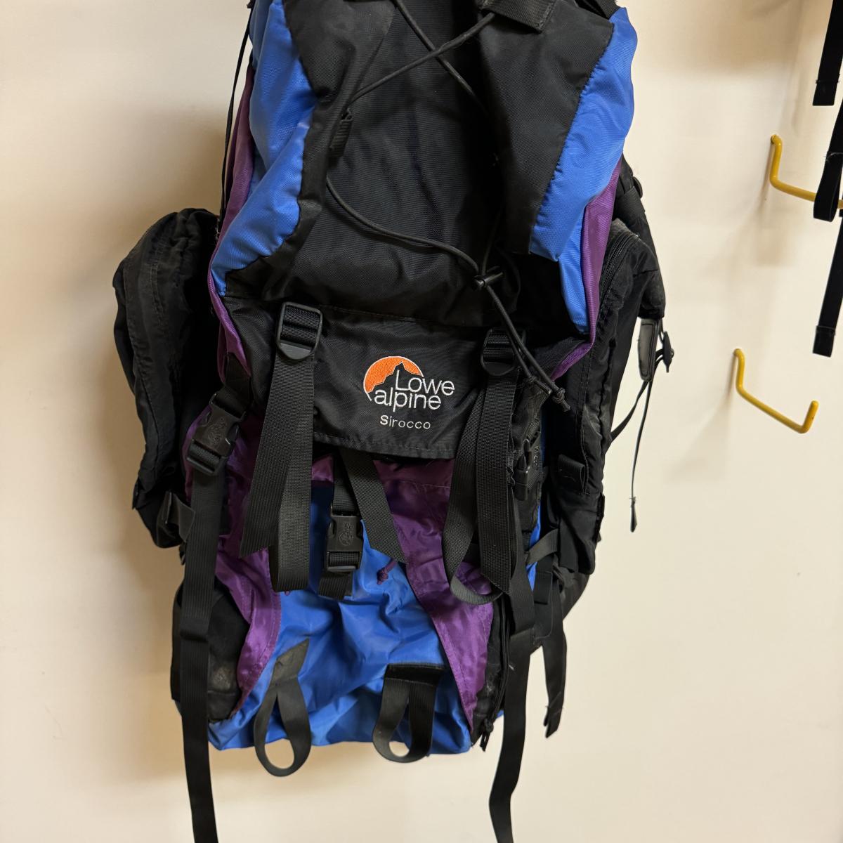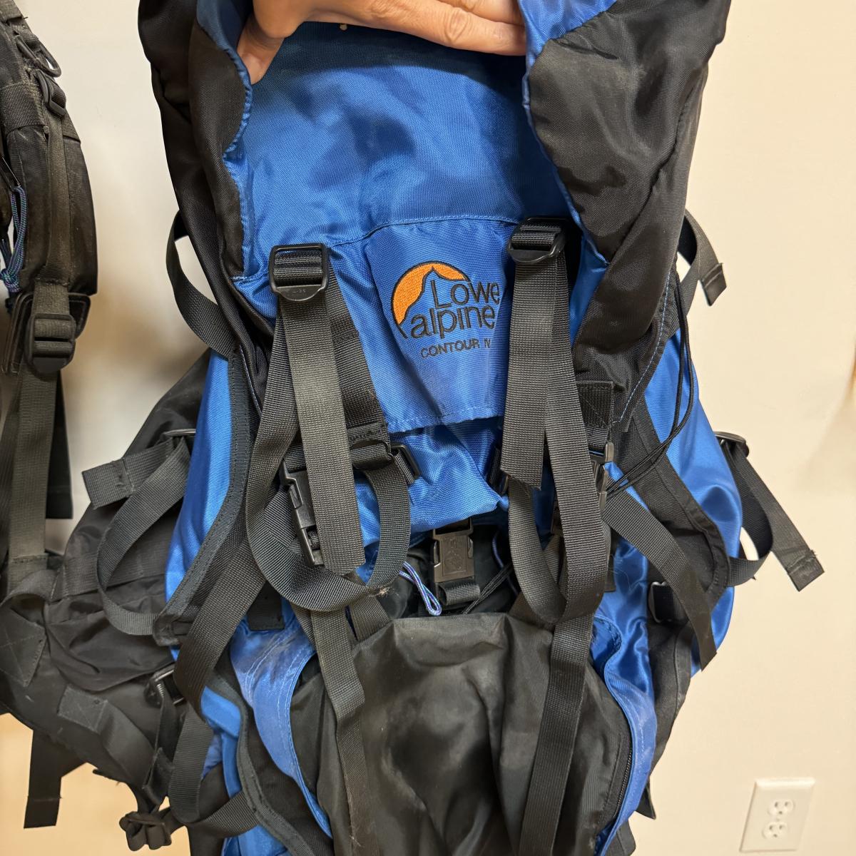 Two large Lowe Alpine brand overnight packs with lots of storage compartments including one for a sleeping bag. One is a “Contour IV” and one is a “Sirocco”. Lot also includes two smaller packs with one large compartment. Both are called “Alpine Attack Summit”. Shipping available.