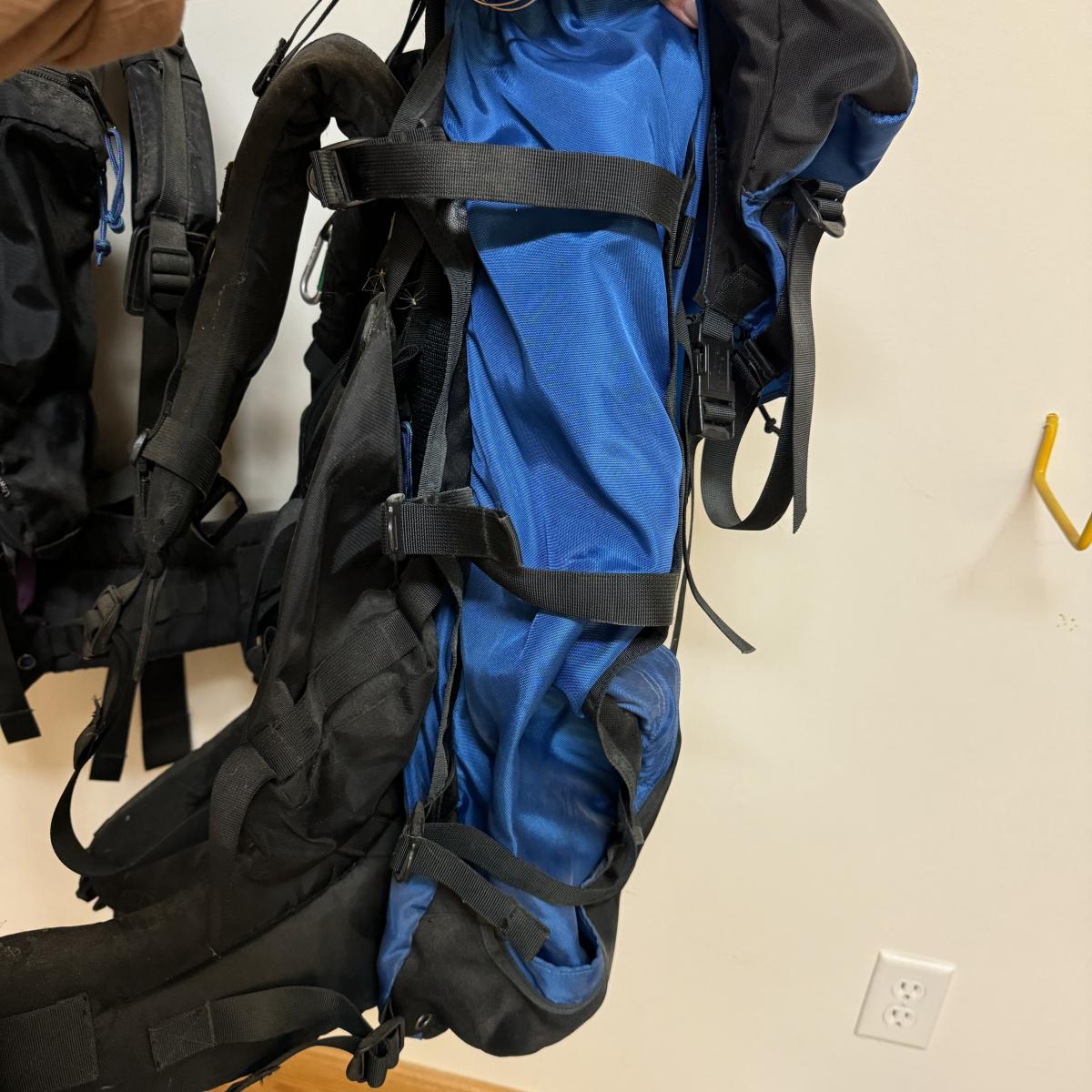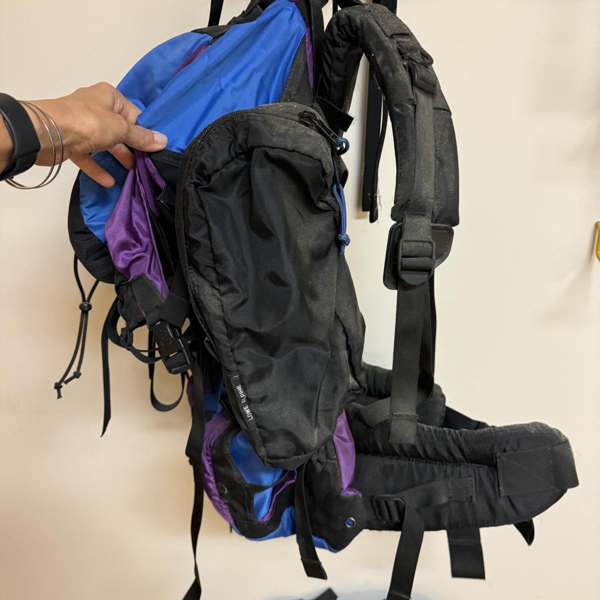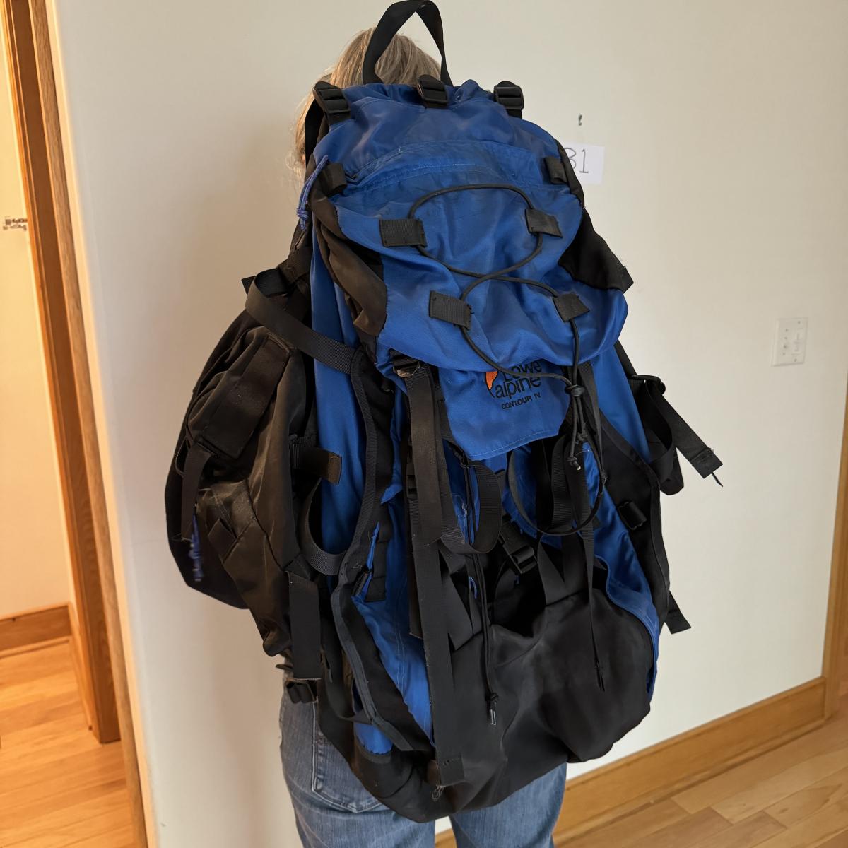 Two large Lowe Alpine brand overnight packs with lots of storage compartments including one for a sleeping bag. One is a “Contour IV” and one is a “Sirocco”. Lot also includes two smaller packs with one large compartment. Both are called “Alpine Attack Summit”. Shipping available.