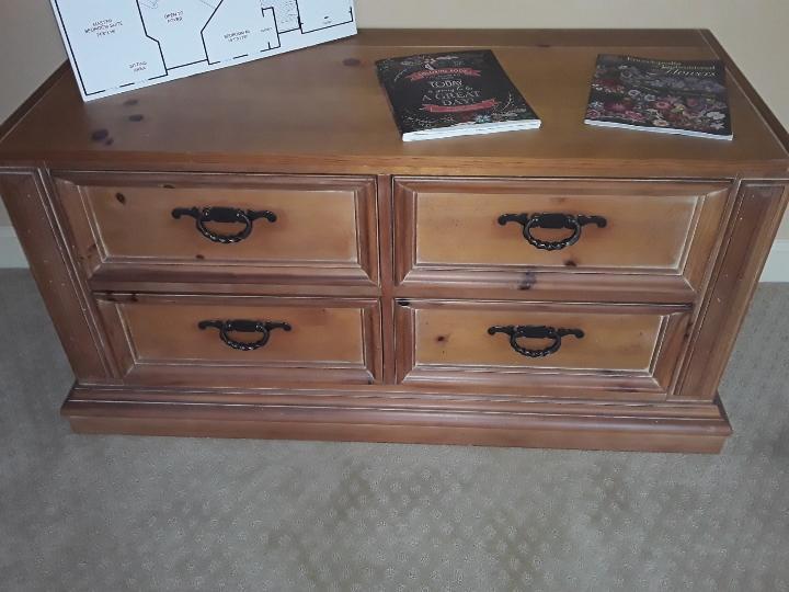This is the lower part of an armoire with a shelf laid on top. Owner used it as TV stand.