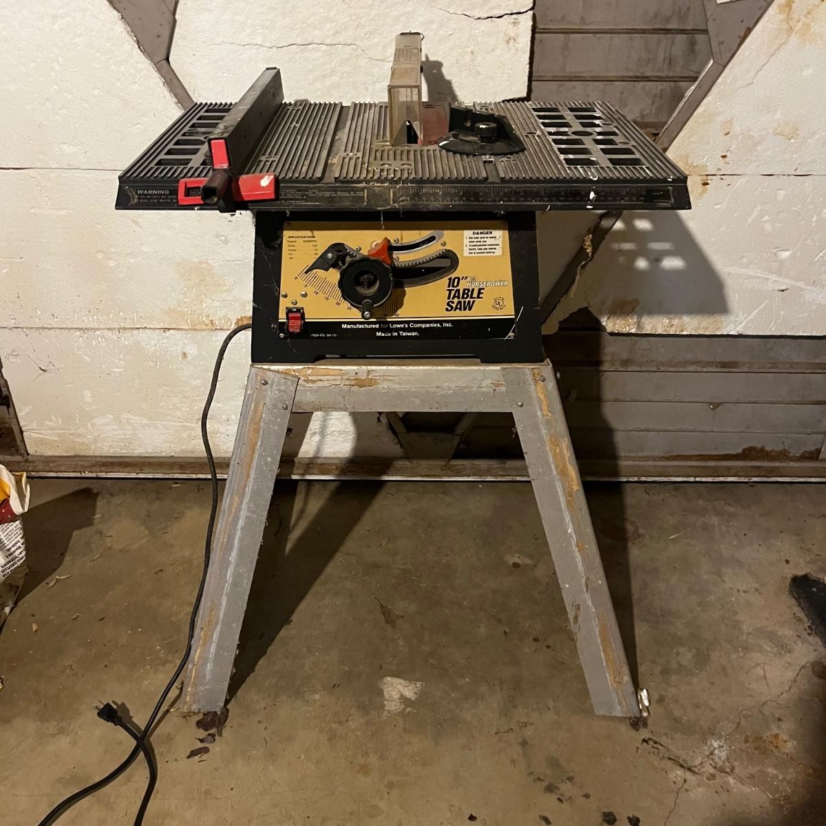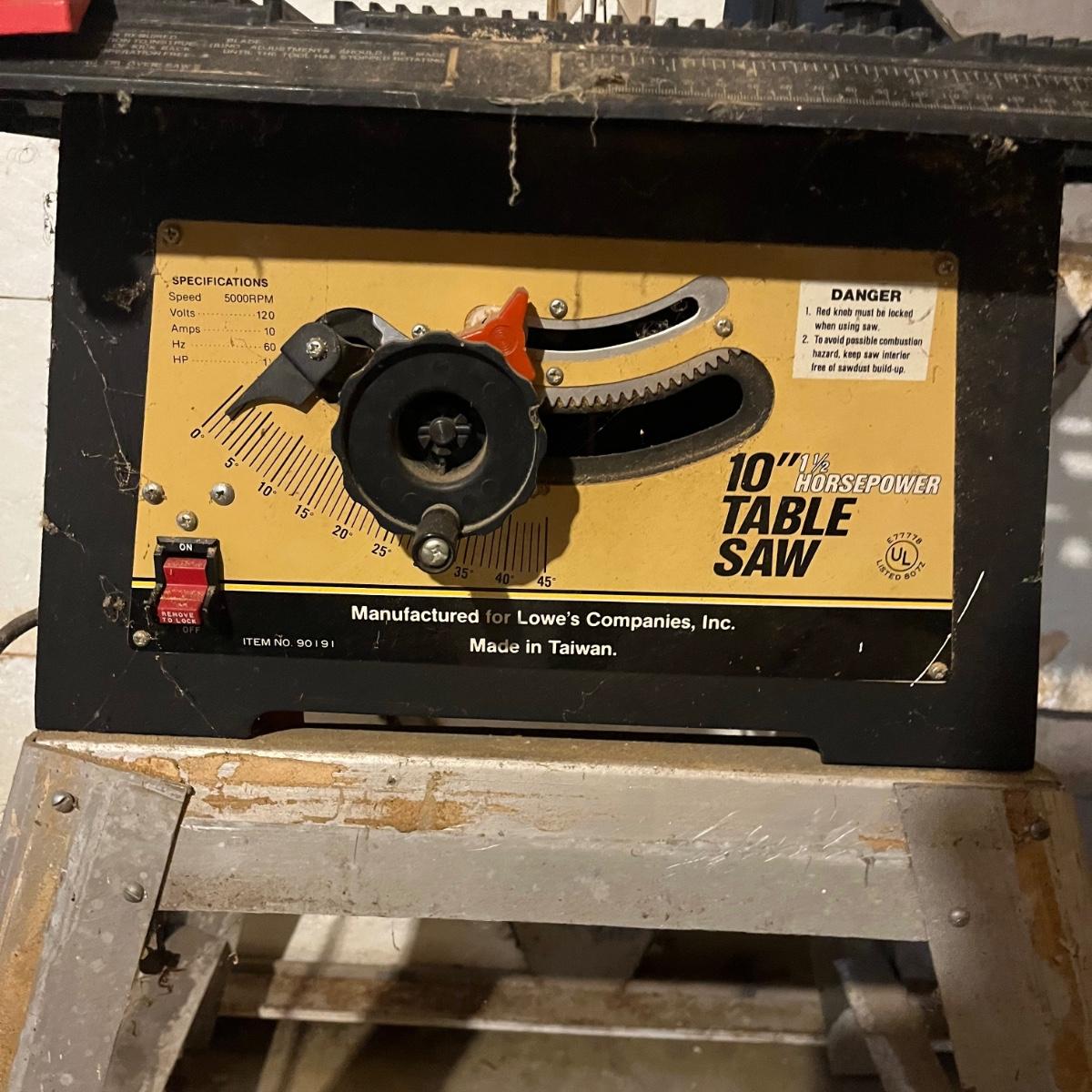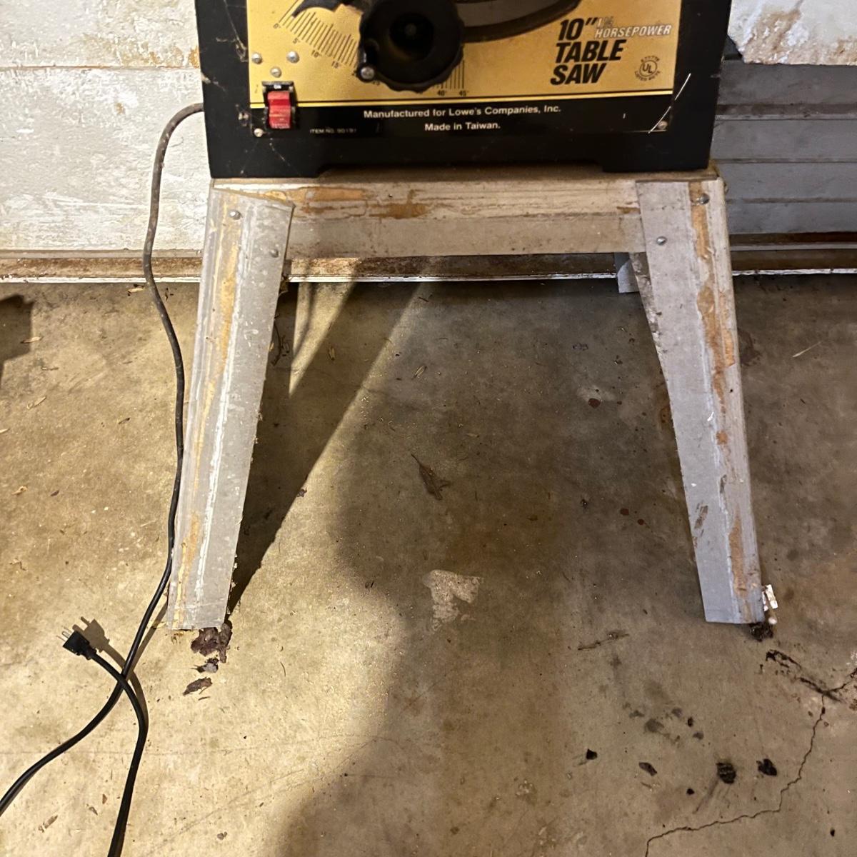 Lot includes a Lowe’s 10” table saw that is attached to a metal stand. Saw worked when tested. Saw with stand measures 25” x 31” x 39”.