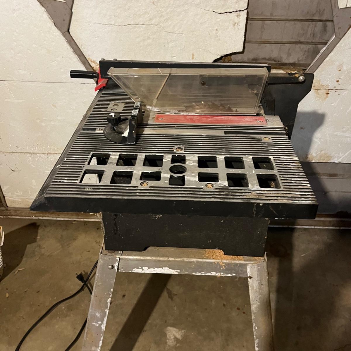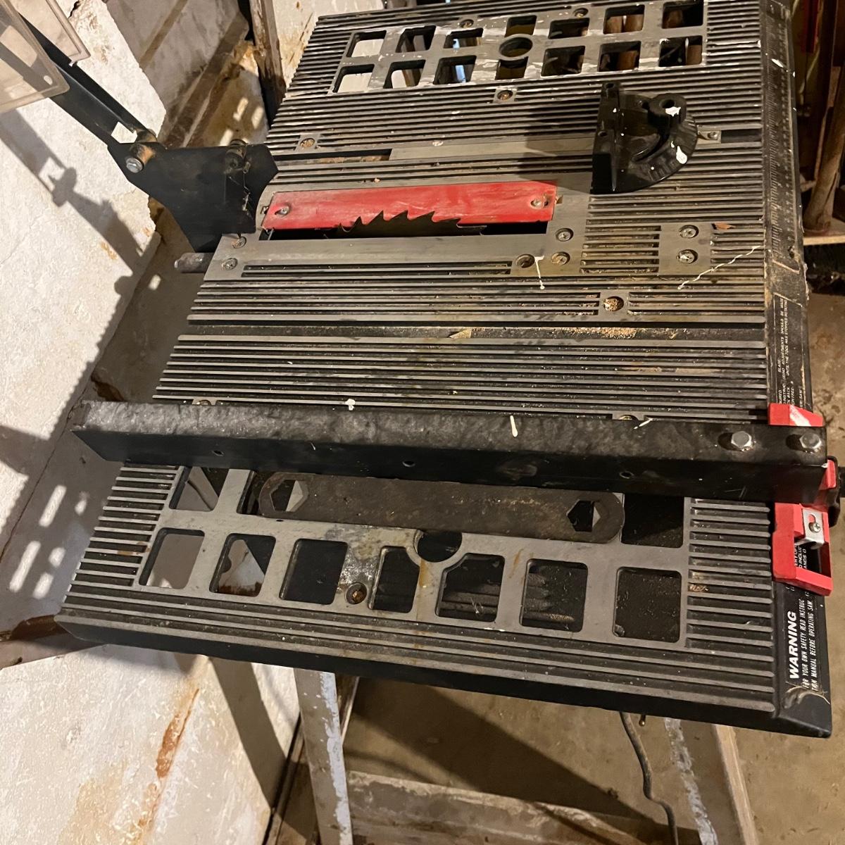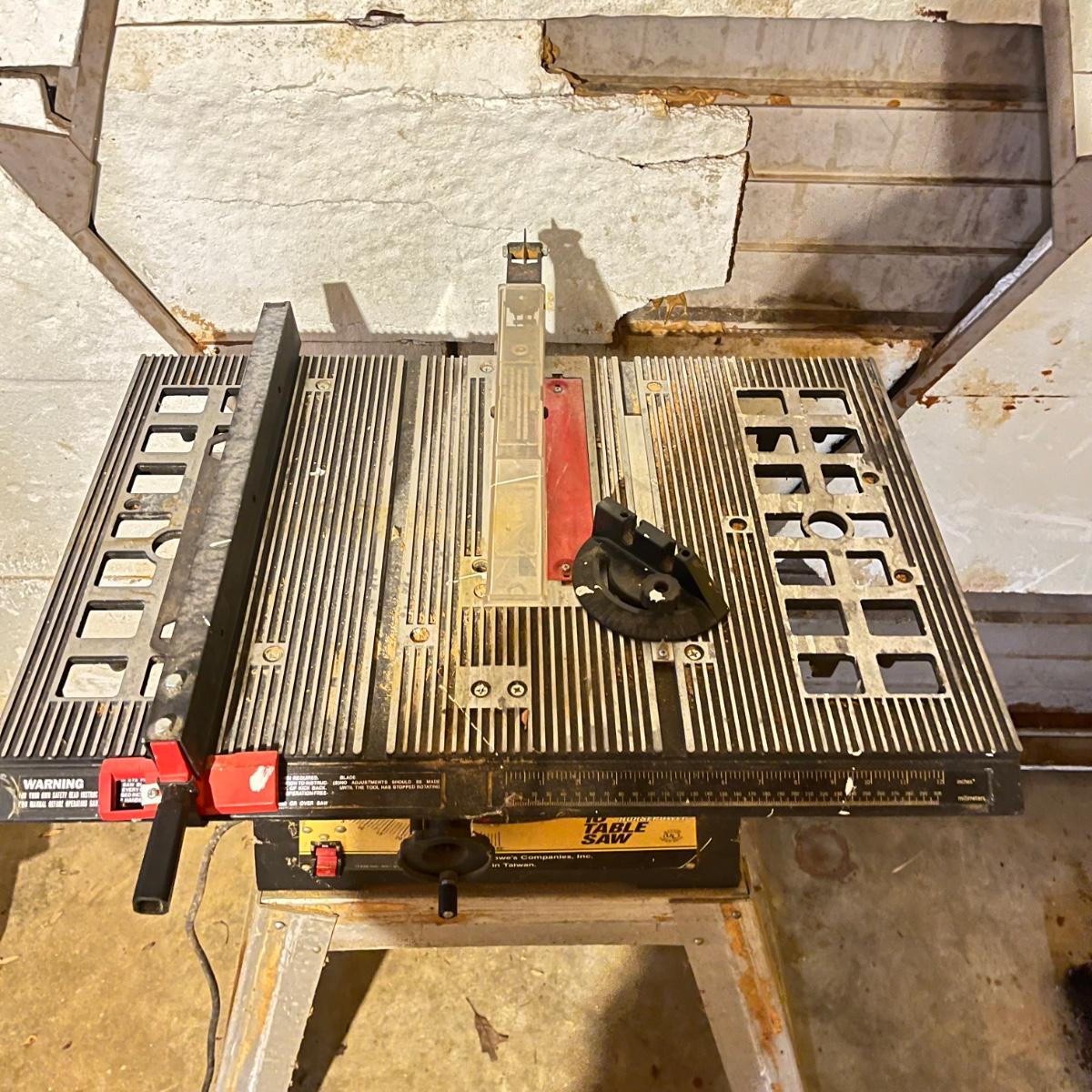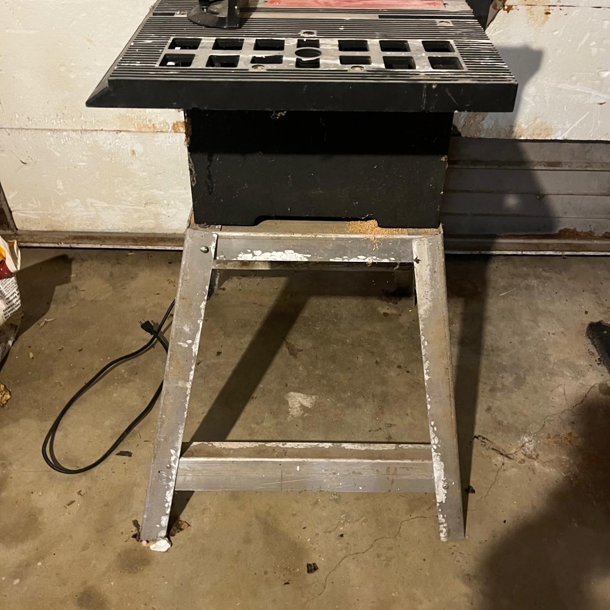 Lot includes a Lowe’s 10” table saw that is attached to a metal stand. Saw worked when tested. Saw with stand measures 25” x 31” x 39”.