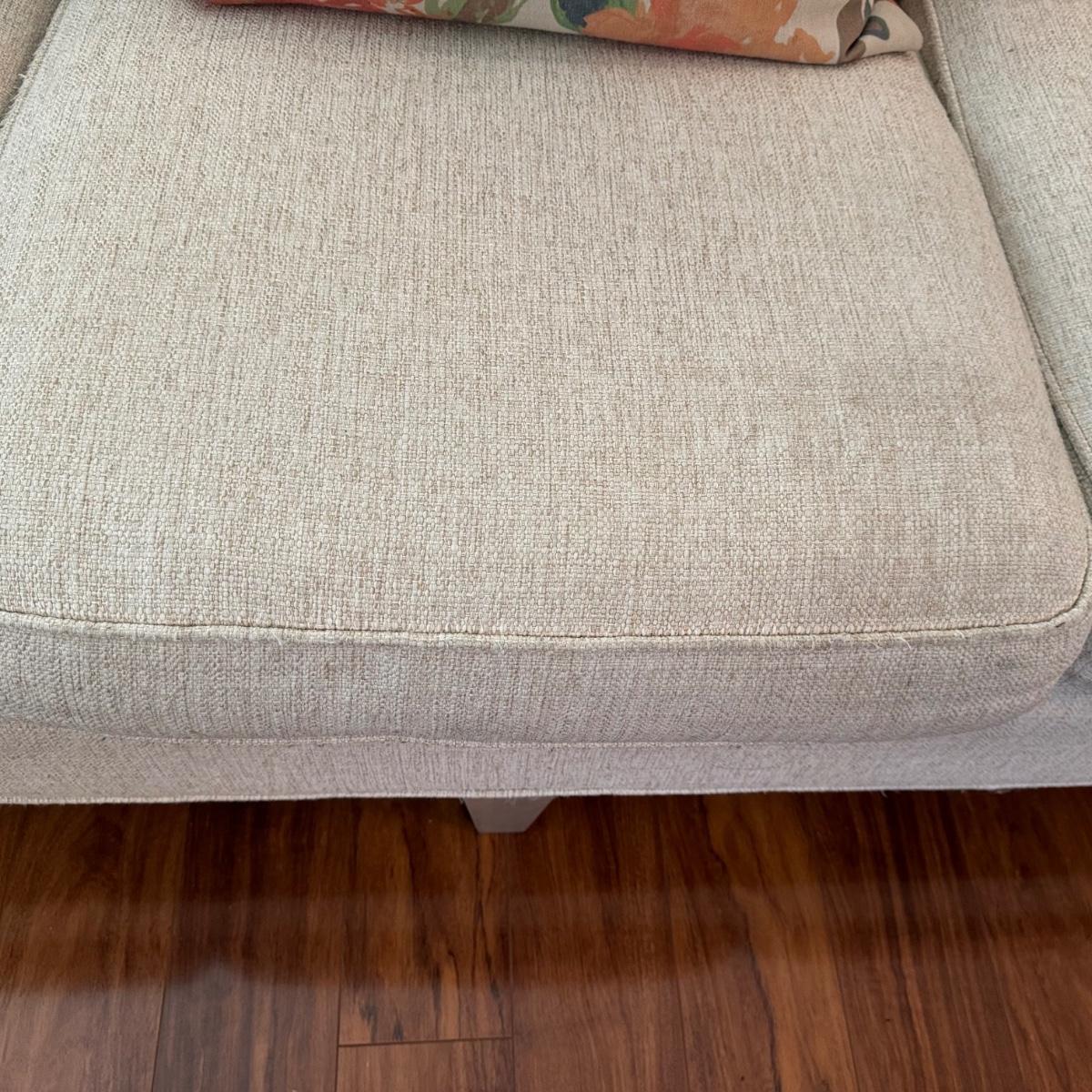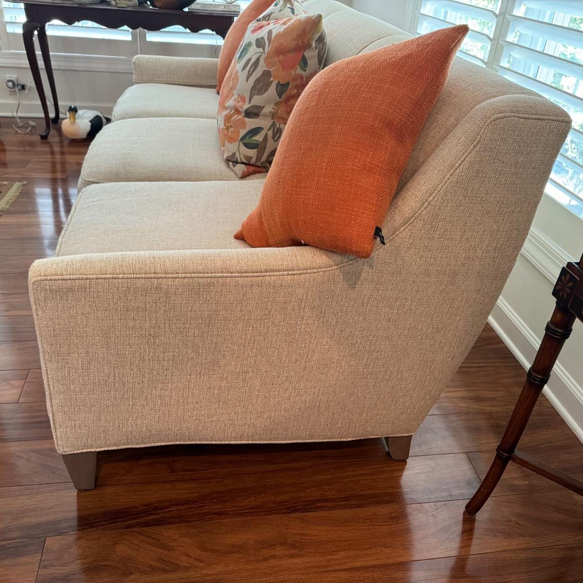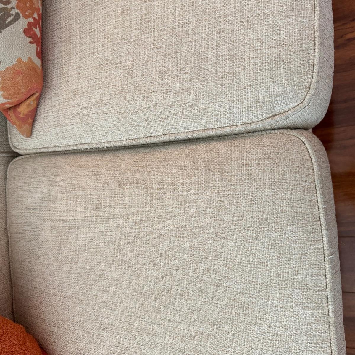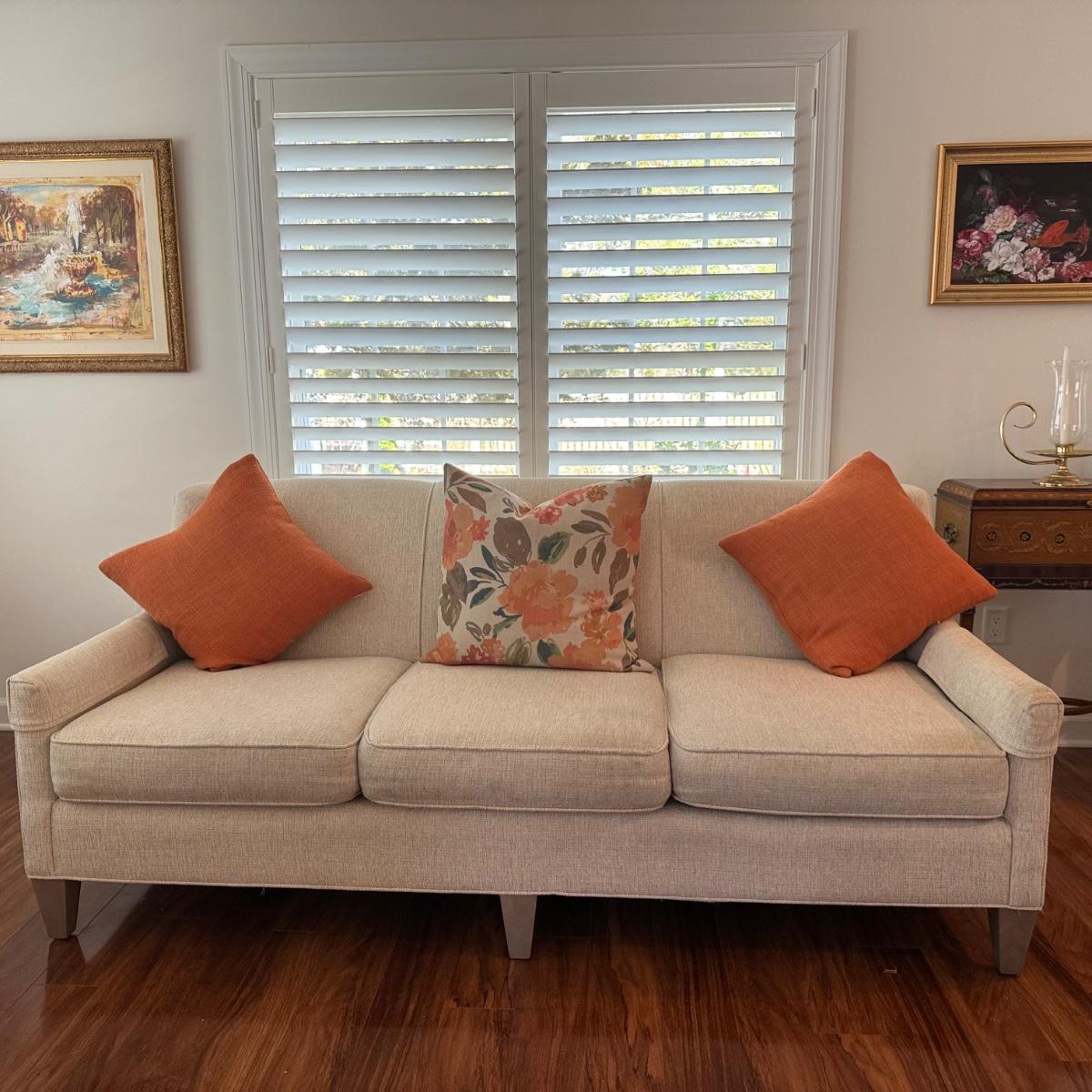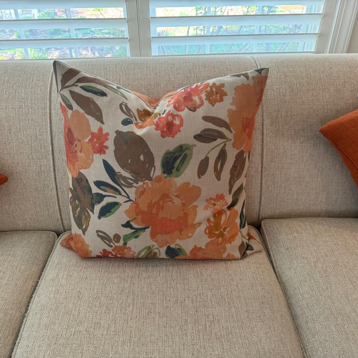 This Three cushion sofa is a mixed woven White tweed color with three orange and floral accent pillows