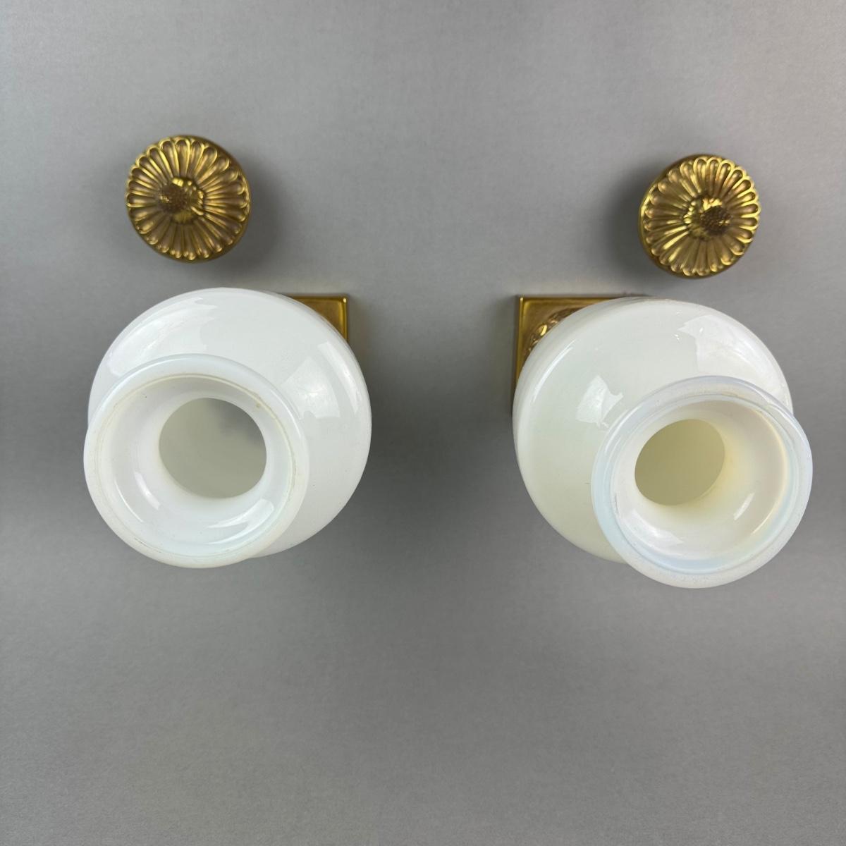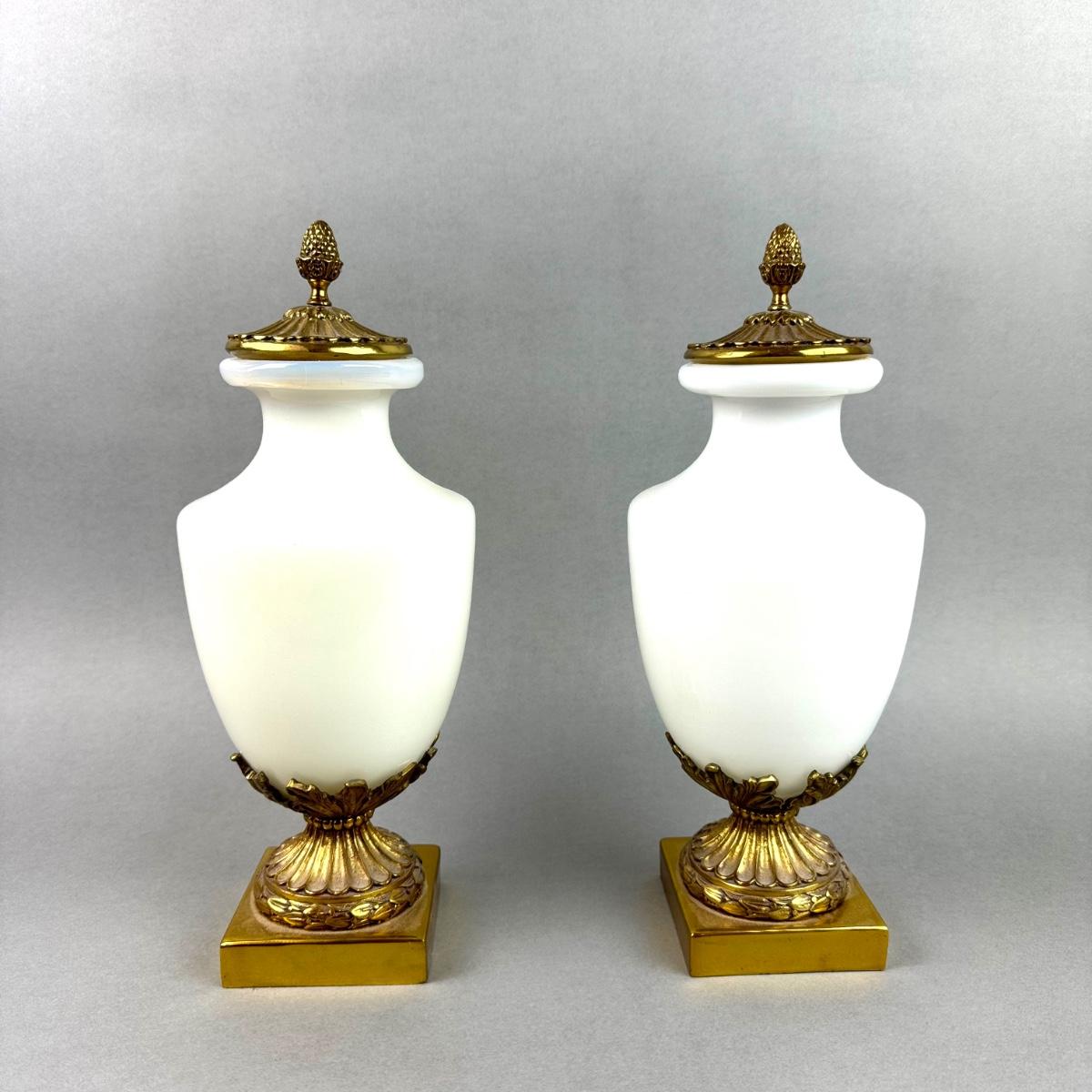 LR017 Pair of Maitland Smith Ormolu Mounted Opaline Urns