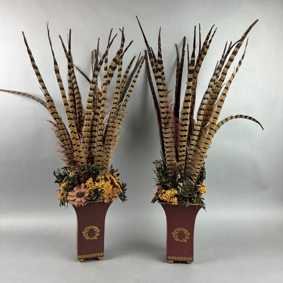LR104 Pair of Pheasant Feather Floral Dried Arrangements