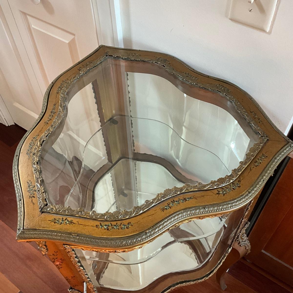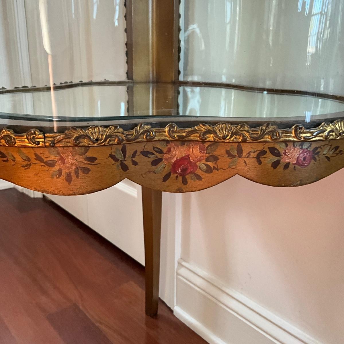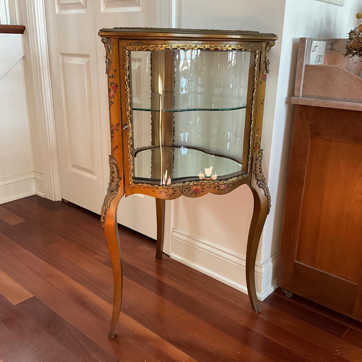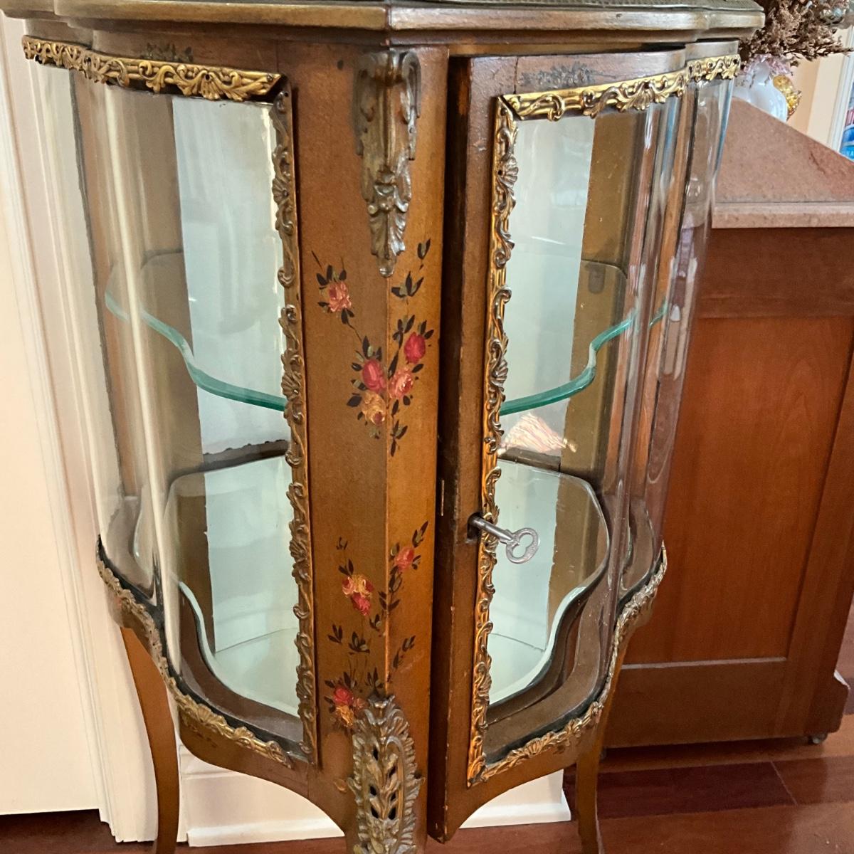 Handpainted with beveled glass and mirror bottom, One shelf , brass trim and single door with key