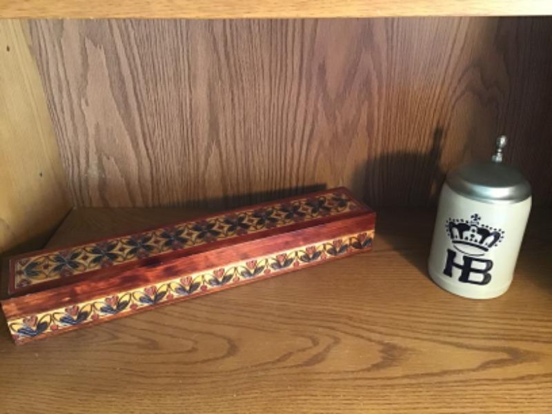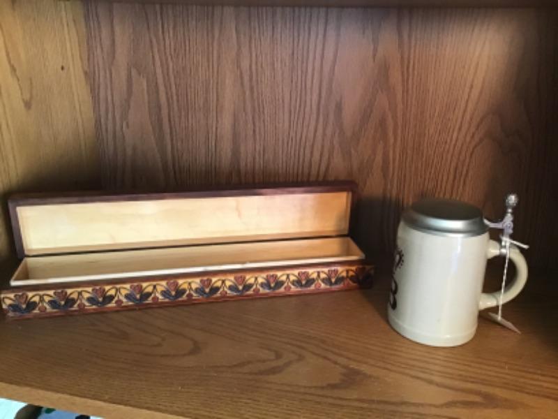 #lr17. Poland wood box, vintage Hofbrauhaus Stein from west Germany
