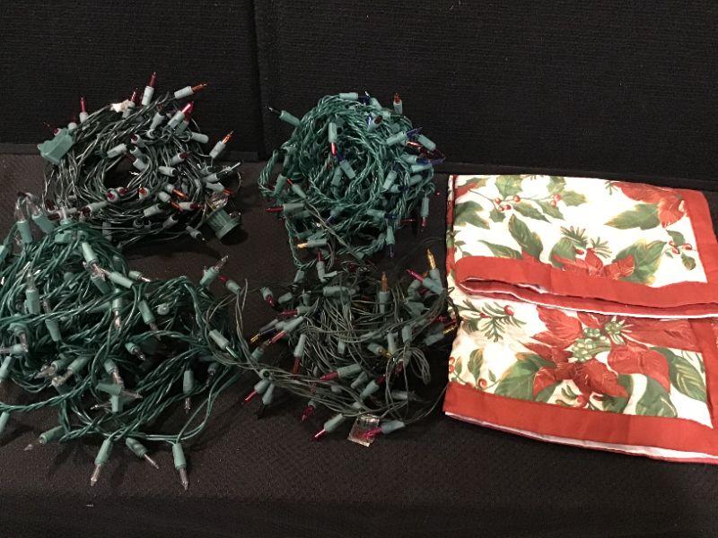 3 sets of multi-colored lights; 1 set of white lights and two shams. Lights tested and work.