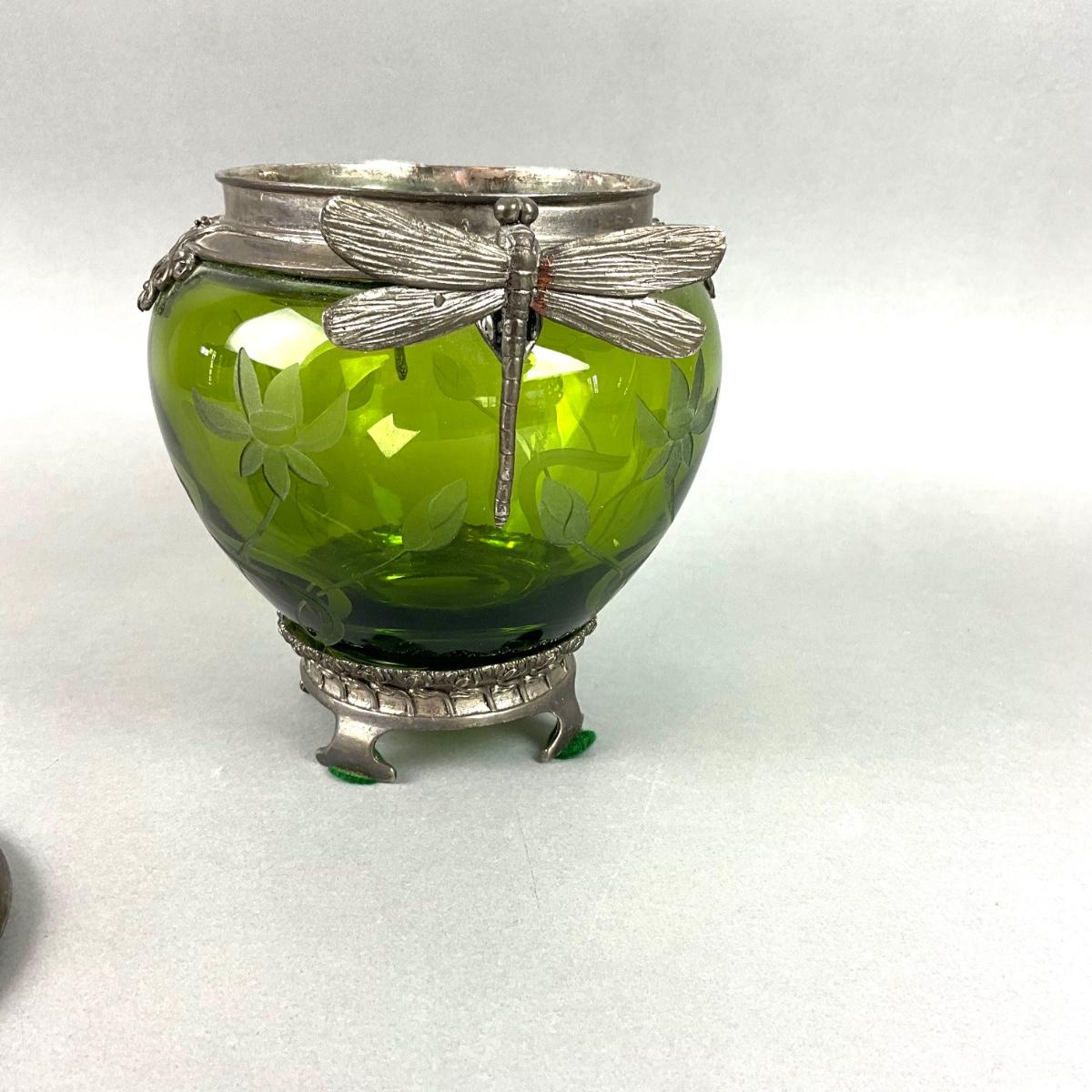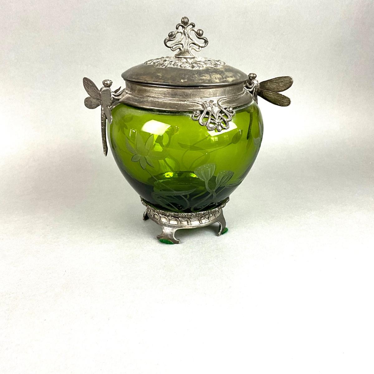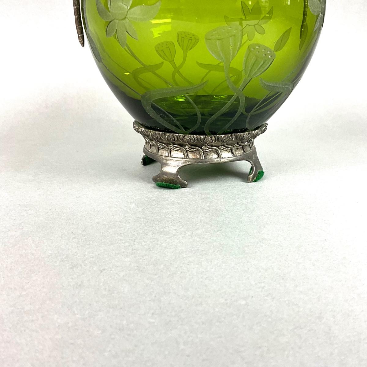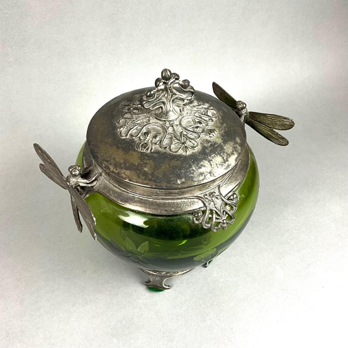 LR235 WMF Art Nouveau Silver Plated Dragonfly Motif Engraved Green Glass Lotus Jar