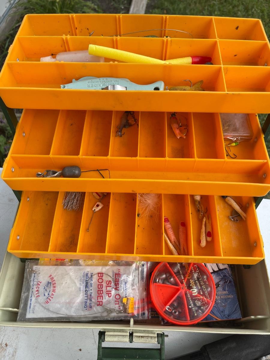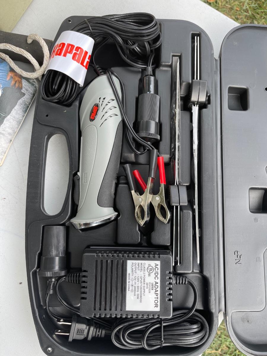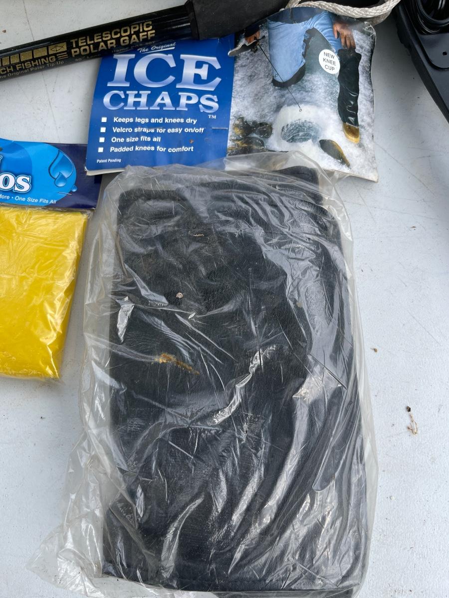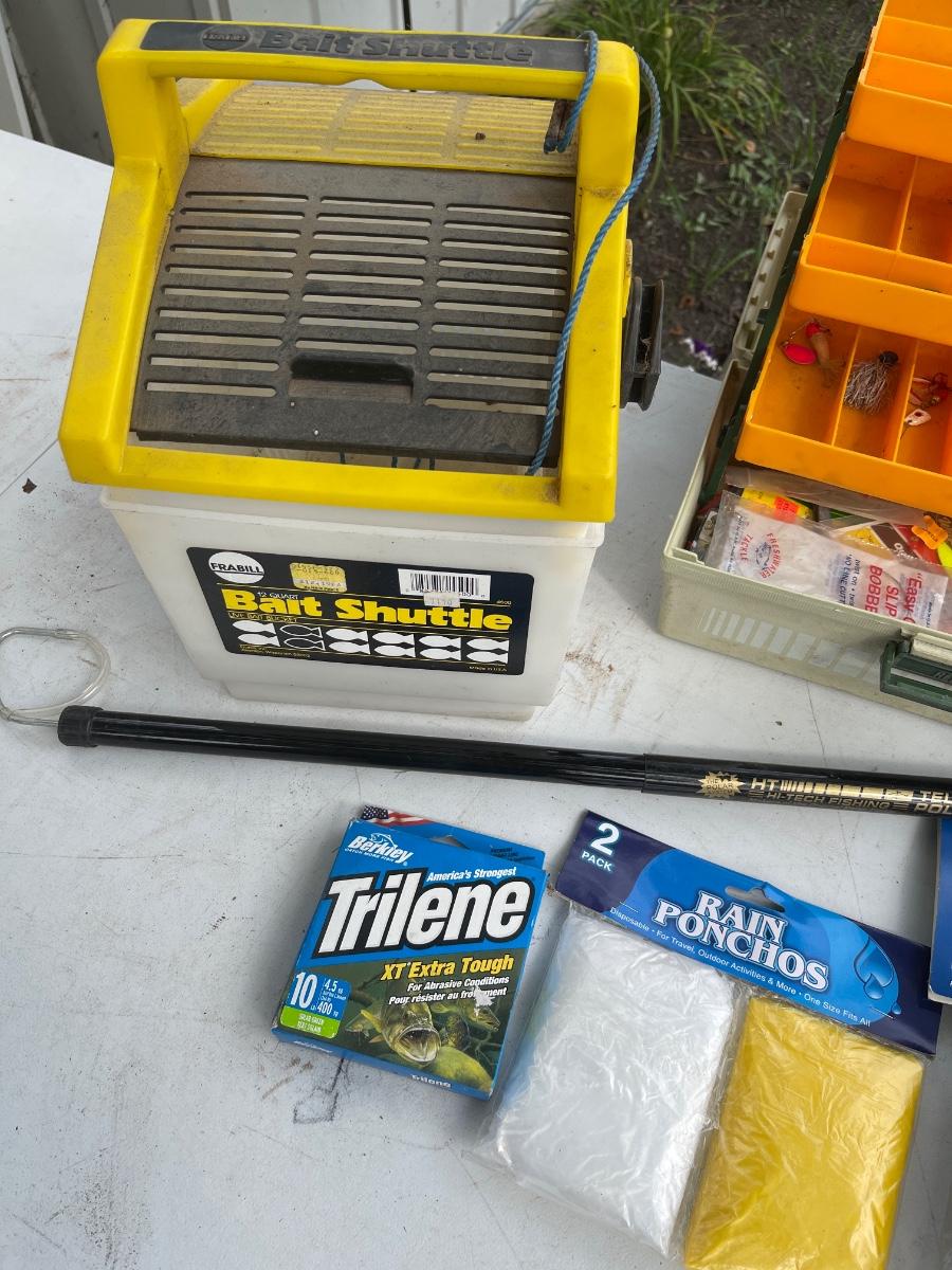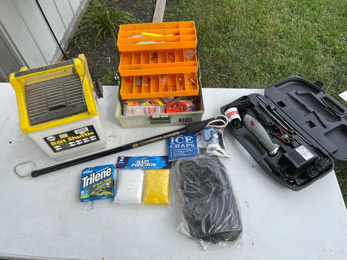 New Rapala fillet knife, ice chaps, ponchos, fishing line, fraybill minnow bucket and partially full tacklebox
