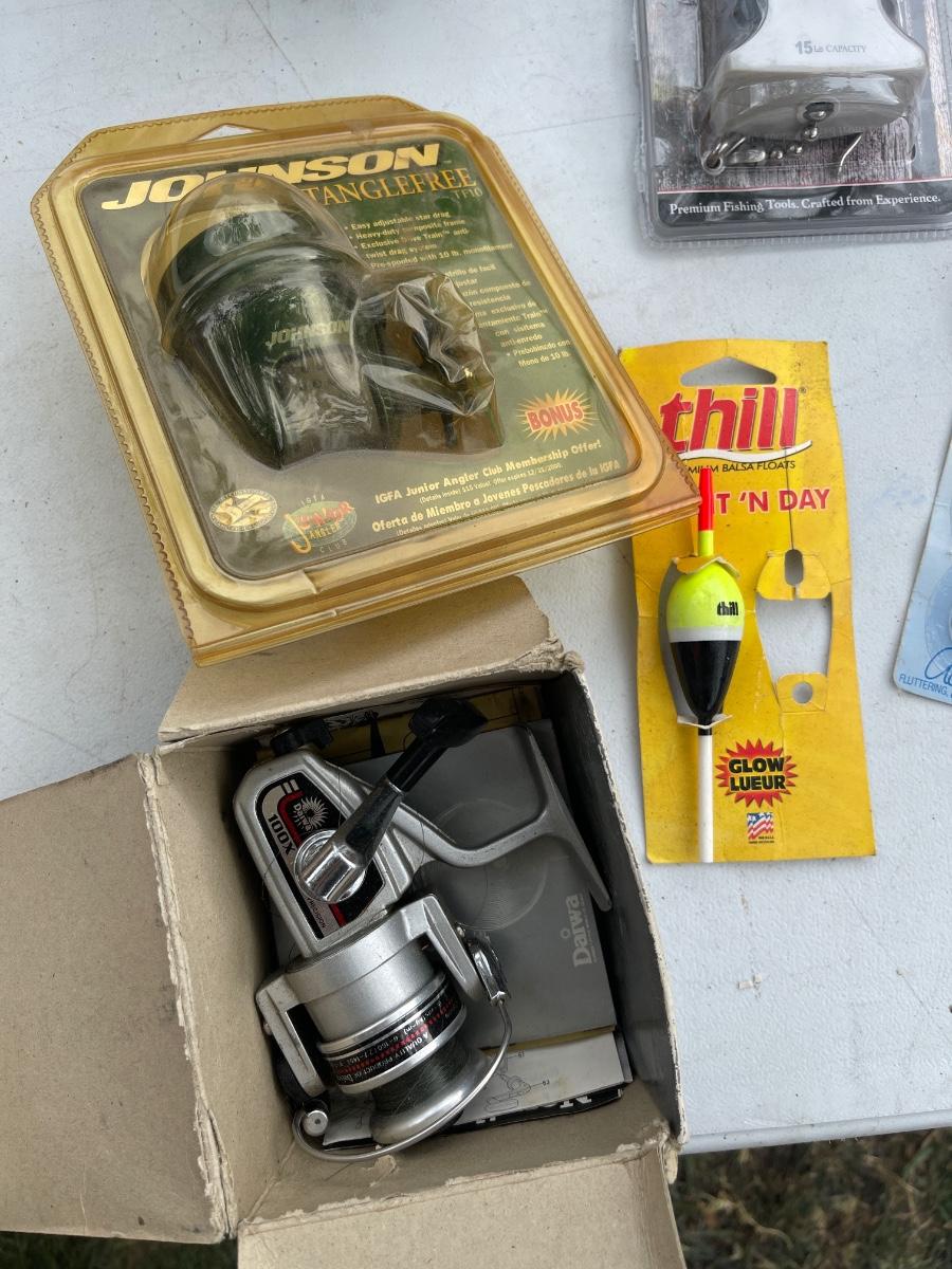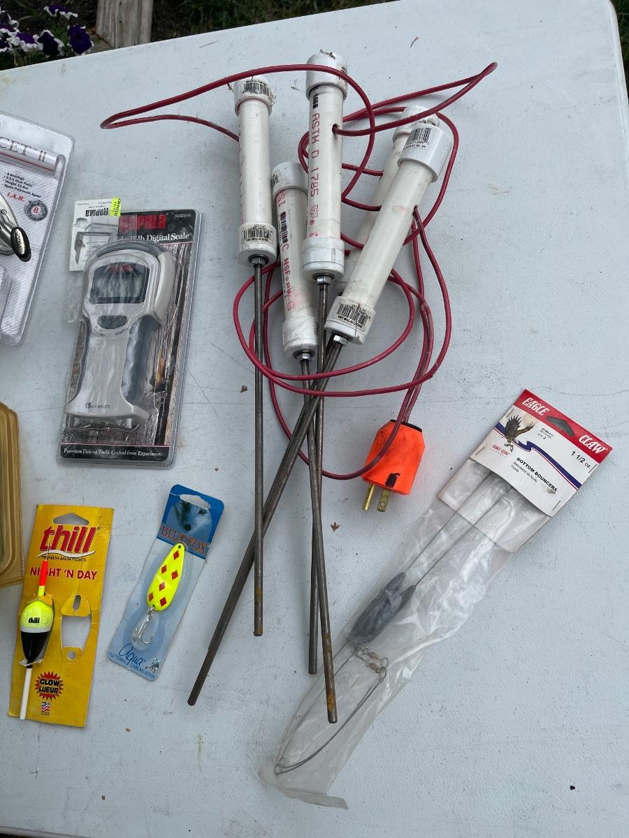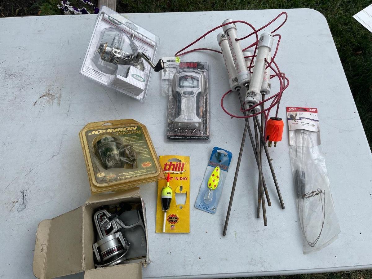 Fishing reels, 15 pound digital scale, tackle, device for driving nightcrawlers out of the ground