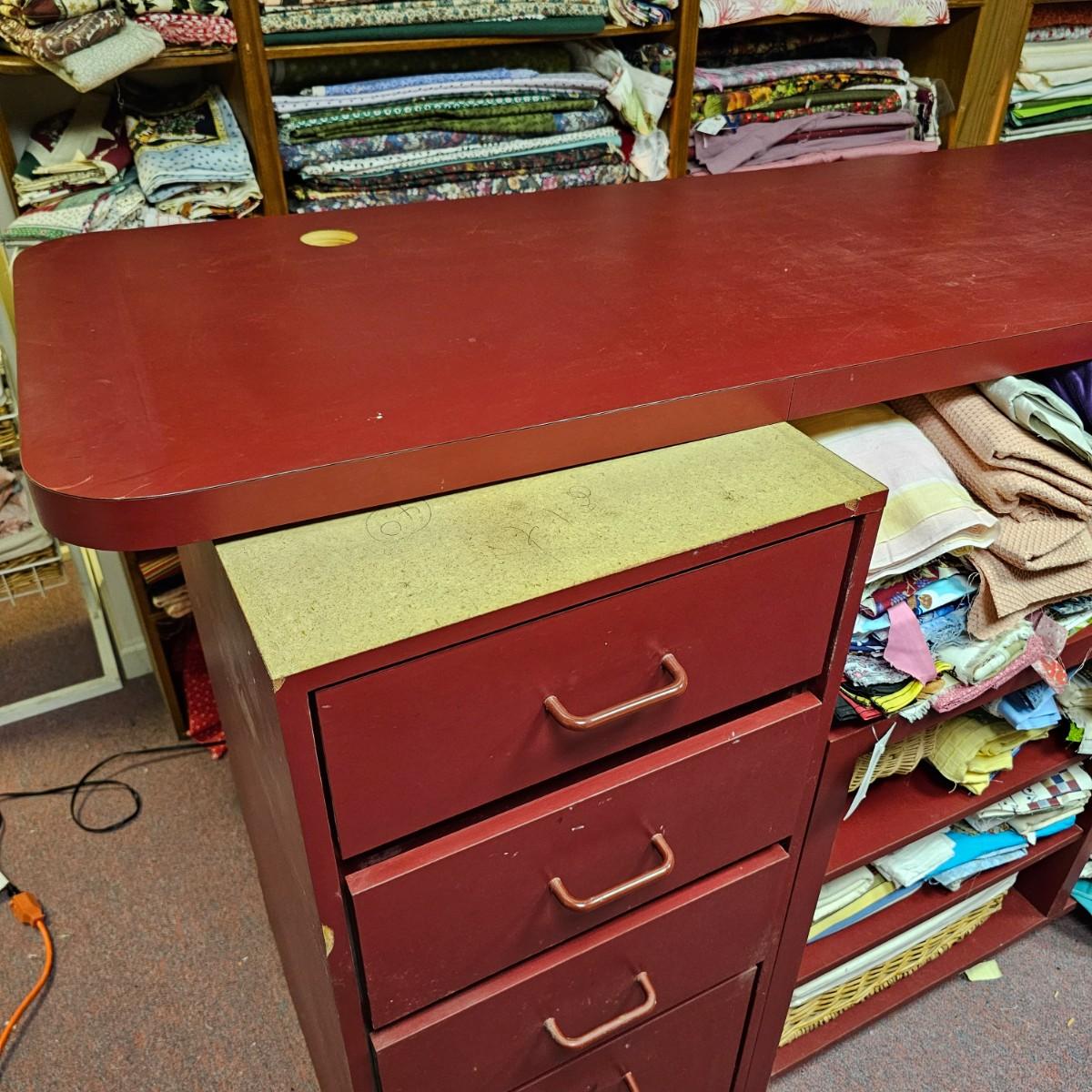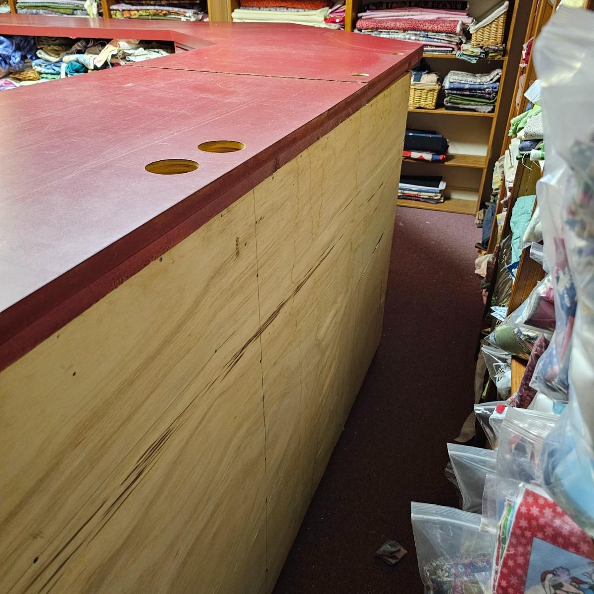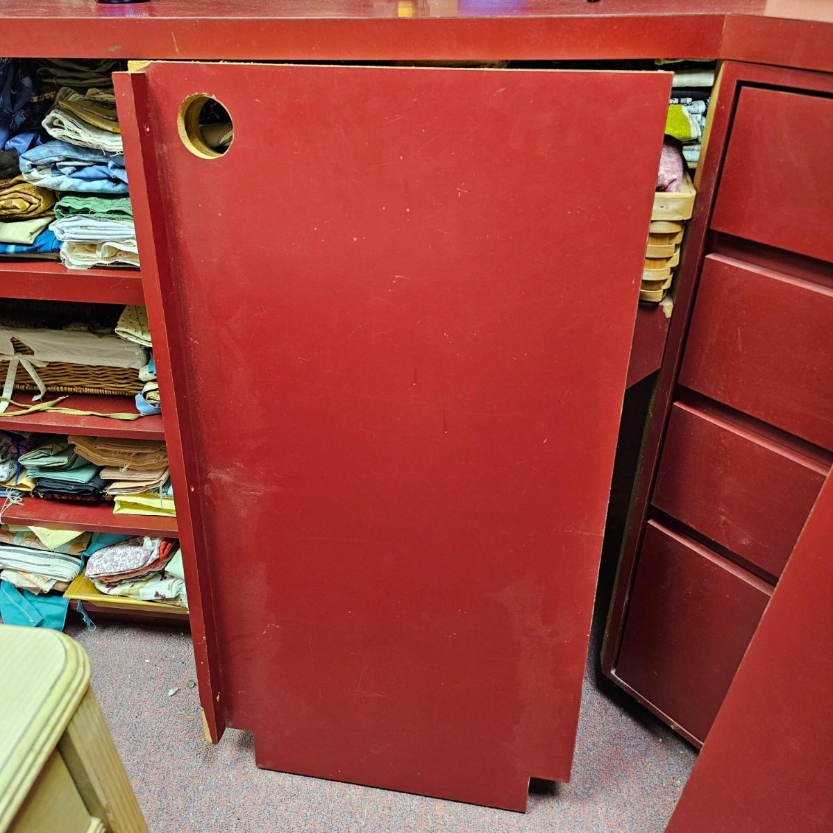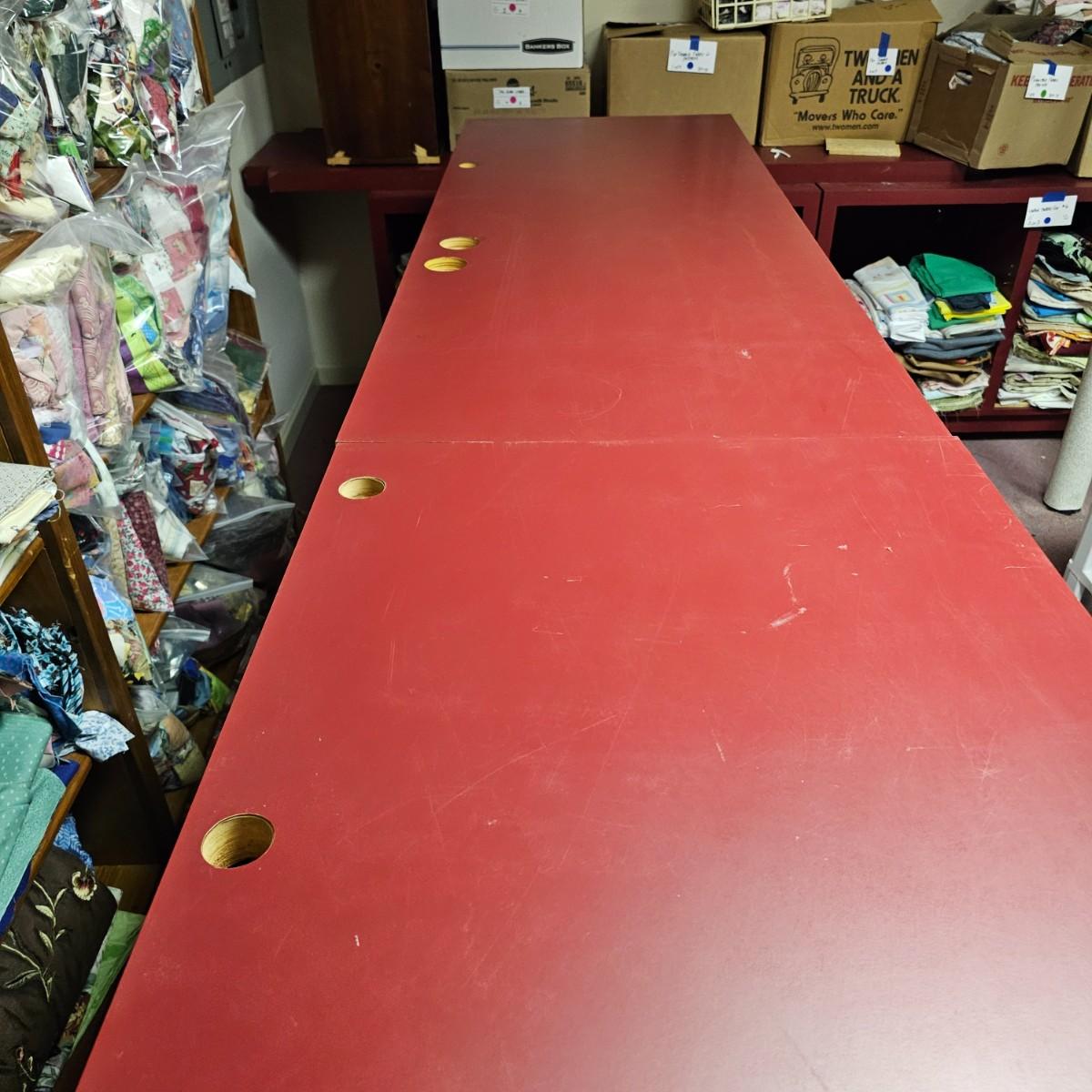 Dark maroon red table top and storage shelves with two drawers units, great for work space or crafting. Table top pieces have some round holes cut in them, probably for cable passage. Entire piece measures 132" x 123" x 42"H, breaks down into six pieces. Two top pieces, two bottom shelf units and two drawer units. Also includes two separate side pieces. Please note, fabric on shelves is NOT included in this lot, but can be found elsewhere in this sale. See photos for details. This item is located in the basement with a flight of stairs or alternatively a garden path with approximately 15 steps that can be used to go around the side of the house. Please bring assistance to remove.