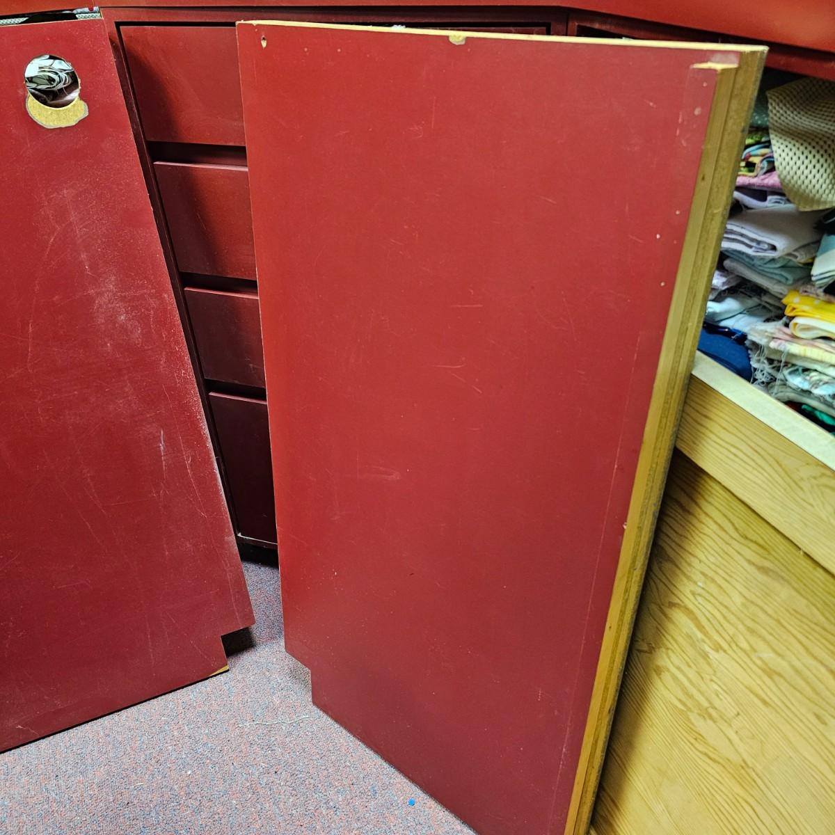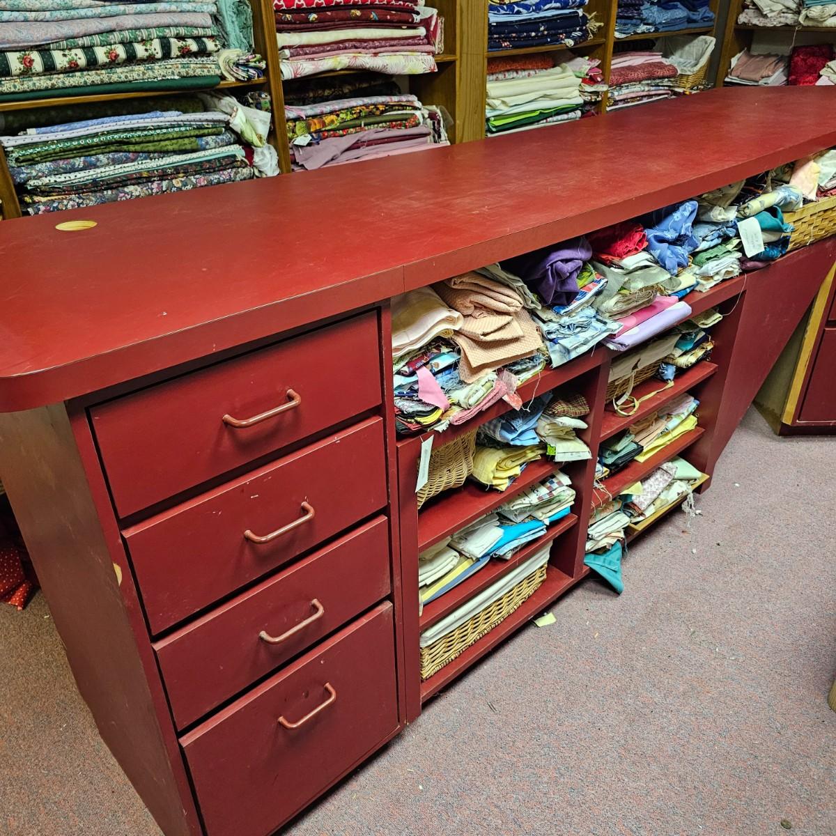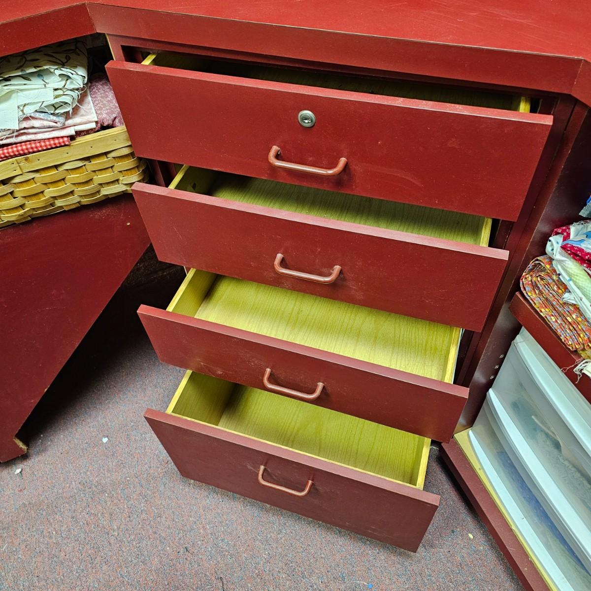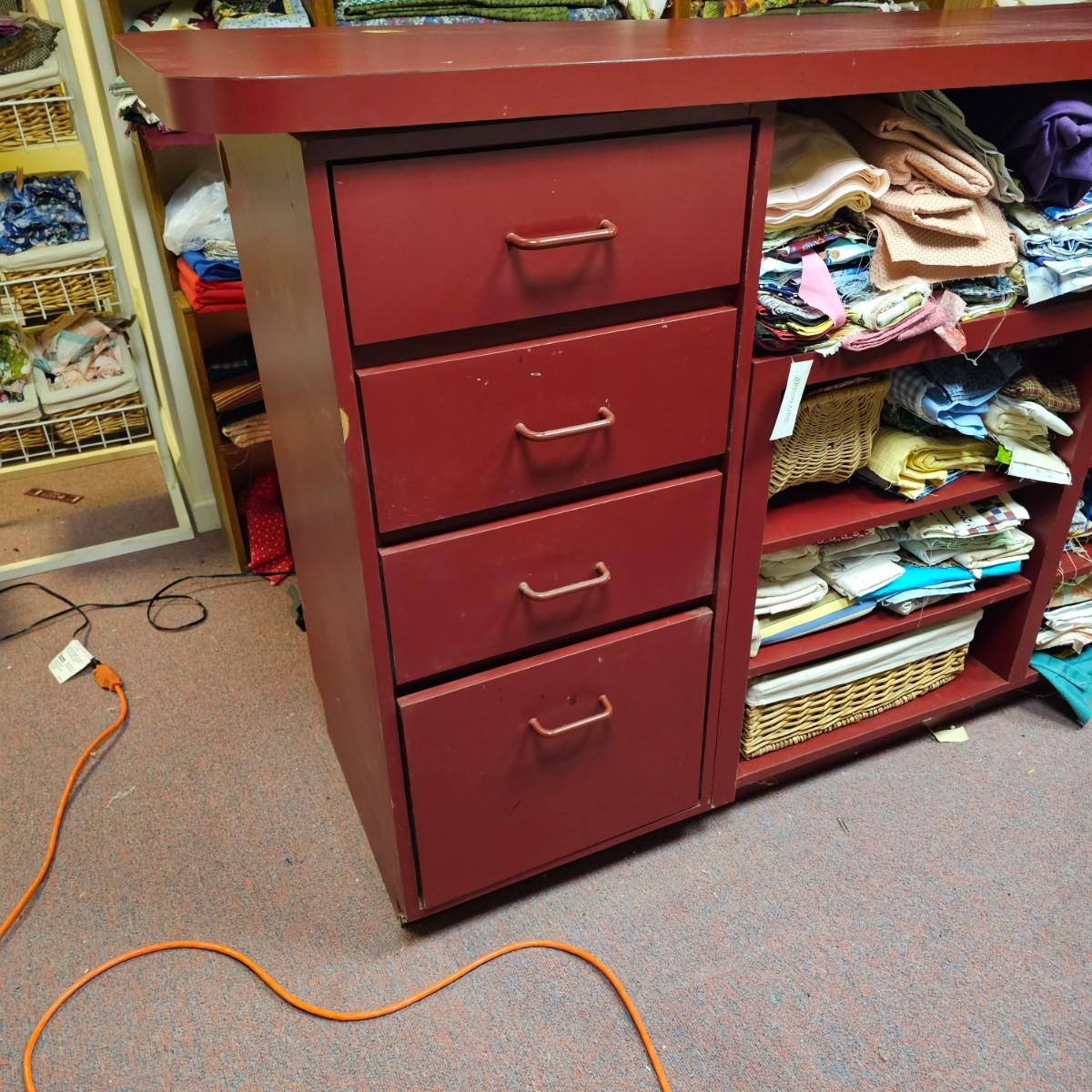 Dark maroon red table top and storage shelves with two drawers units, great for work space or crafting. Table top pieces have some round holes cut in them, probably for cable passage. Entire piece measures 132" x 123" x 42"H, breaks down into six pieces. Two top pieces, two bottom shelf units and two drawer units. Also includes two separate side pieces. Please note, fabric on shelves is NOT included in this lot, but can be found elsewhere in this sale. See photos for details. This item is located in the basement with a flight of stairs or alternatively a garden path with approximately 15 steps that can be used to go around the side of the house. Please bring assistance to remove.