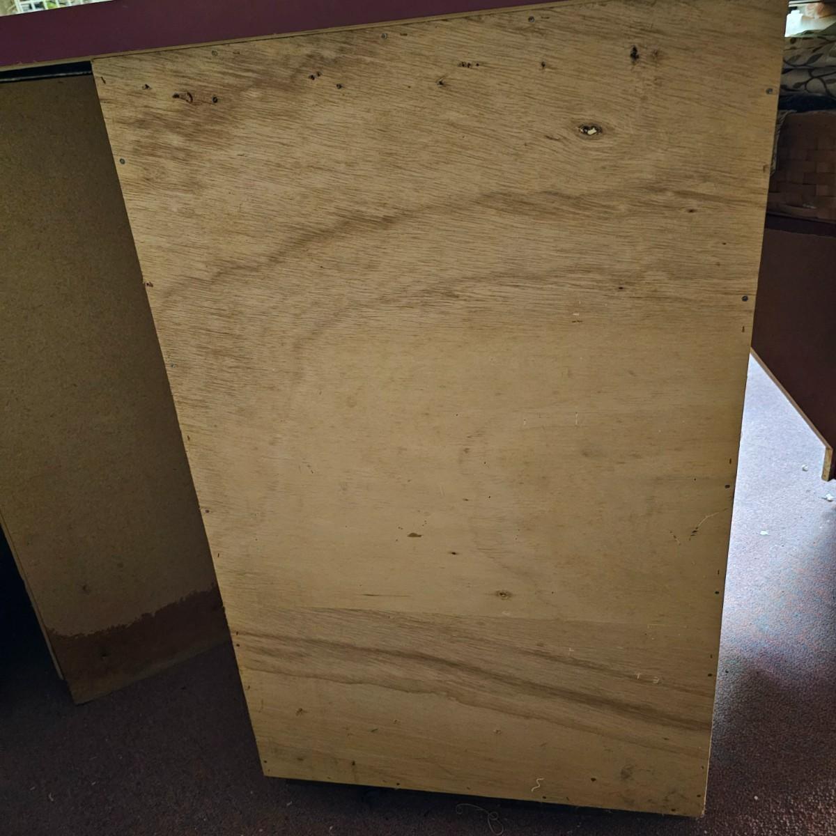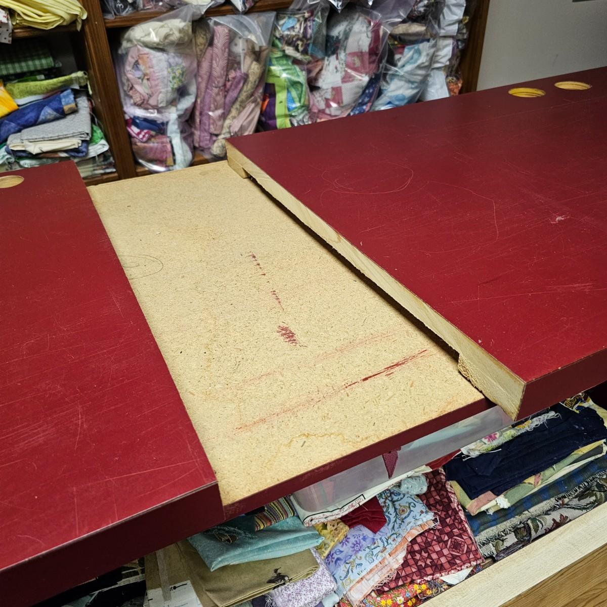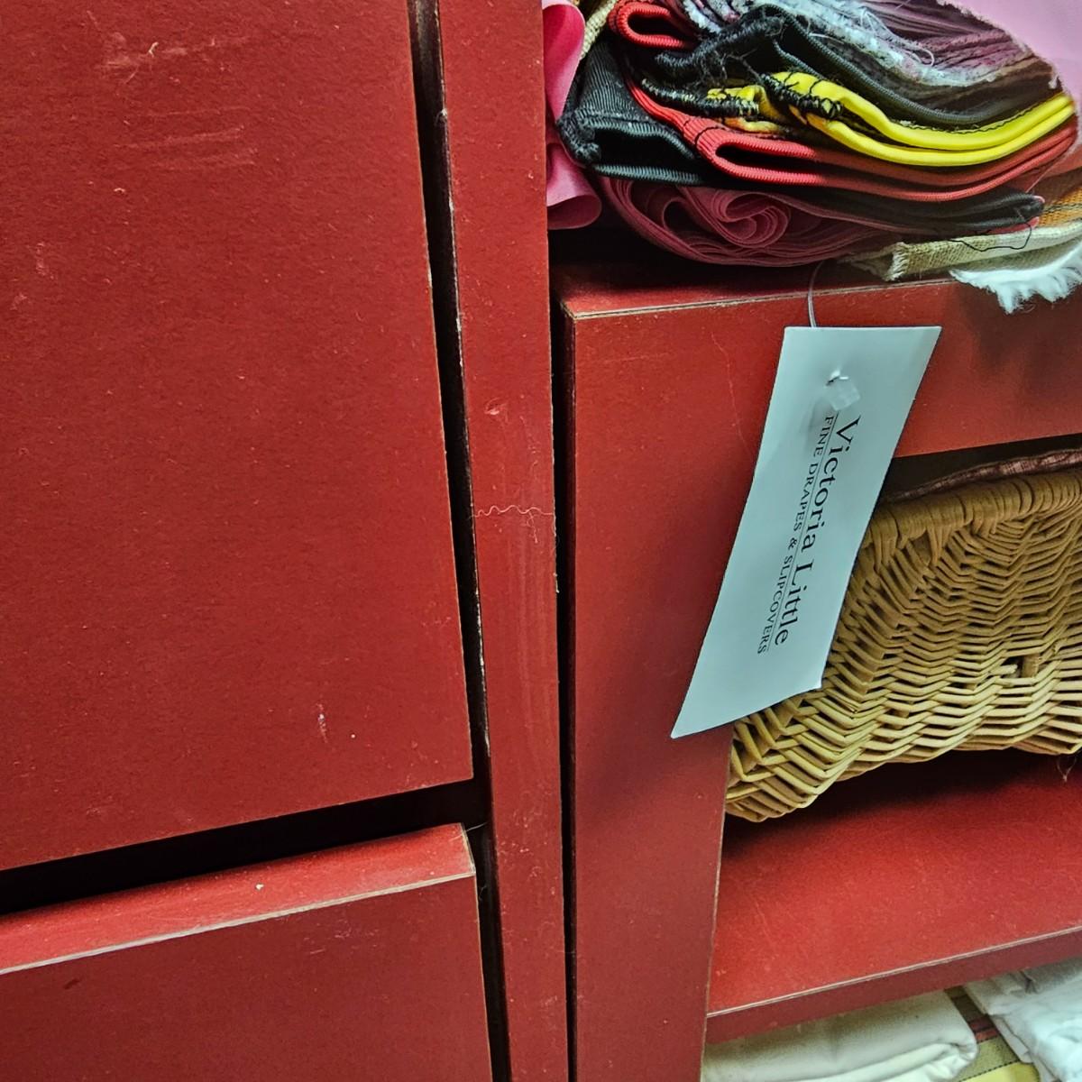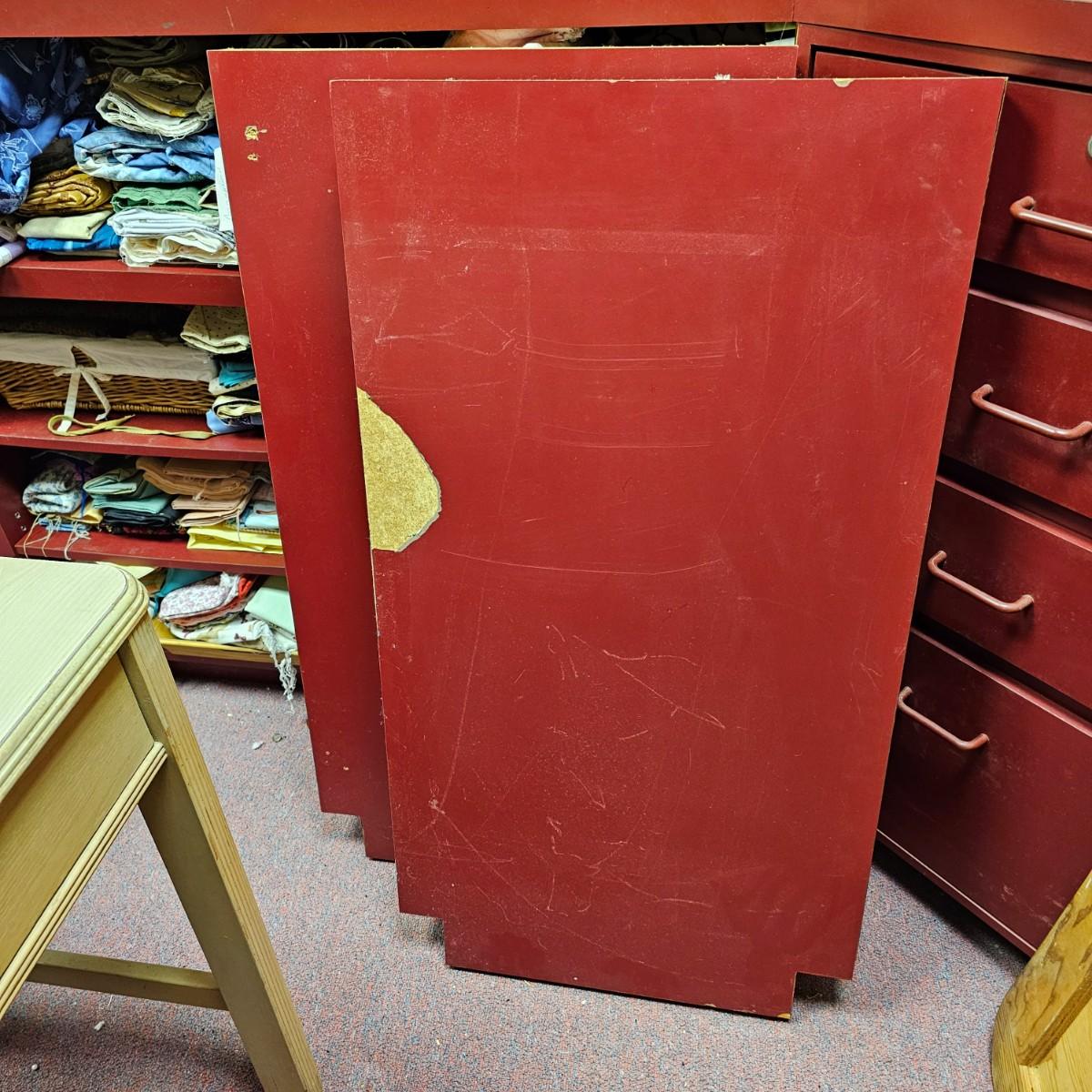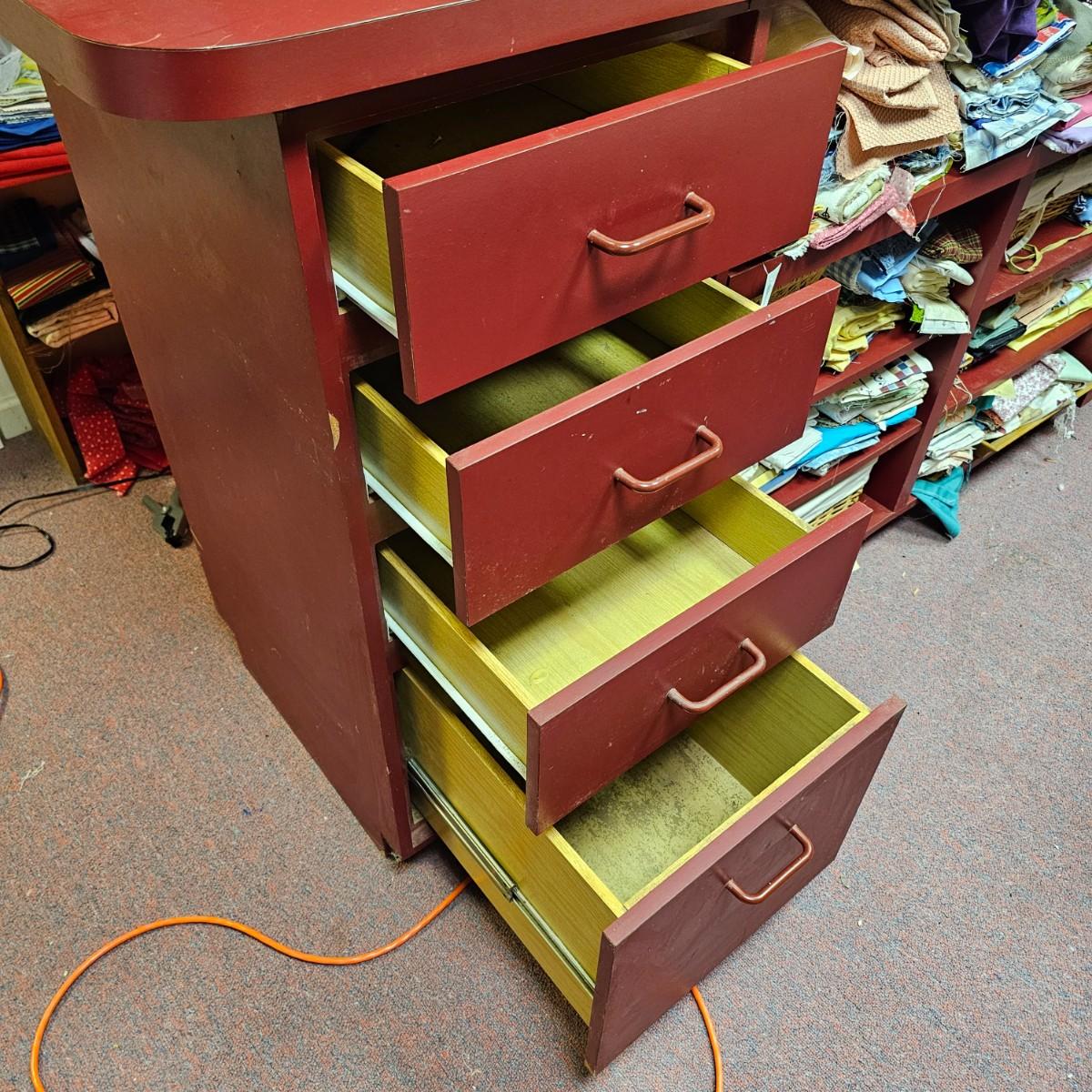 Dark maroon red table top and storage shelves with two drawers units, great for work space or crafting. Table top pieces have some round holes cut in them, probably for cable passage. Entire piece measures 132" x 123" x 42"H, breaks down into six pieces. Two top pieces, two bottom shelf units and two drawer units. Also includes two separate side pieces. Please note, fabric on shelves is NOT included in this lot, but can be found elsewhere in this sale. See photos for details. This item is located in the basement with a flight of stairs or alternatively a garden path with approximately 15 steps that can be used to go around the side of the house. Please bring assistance to remove.
