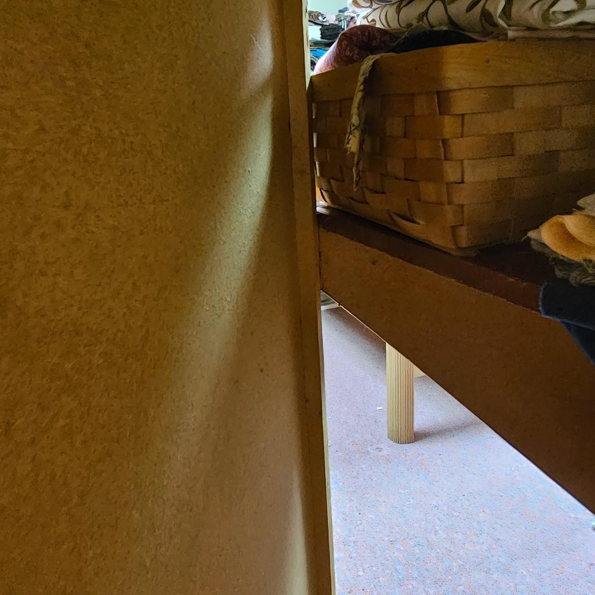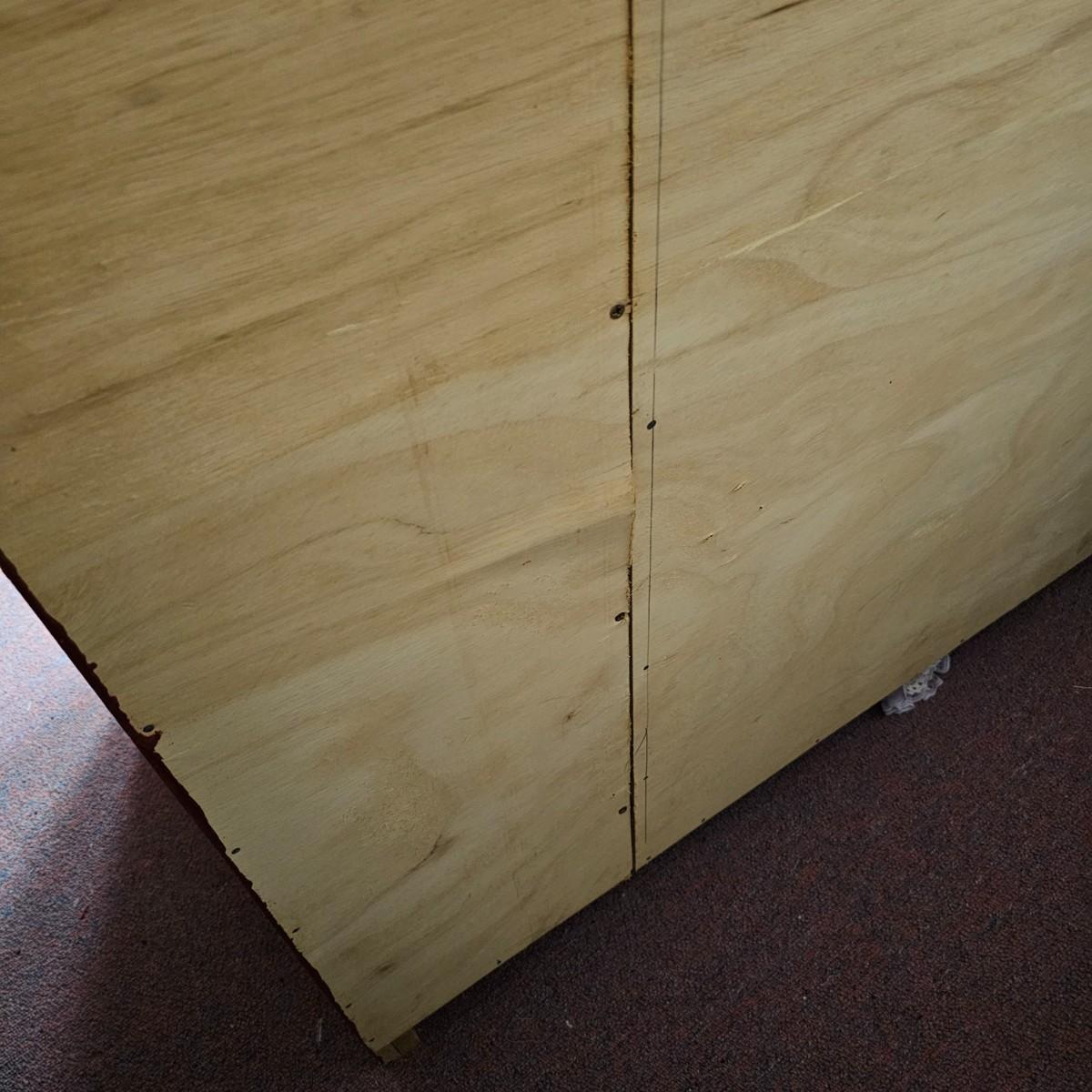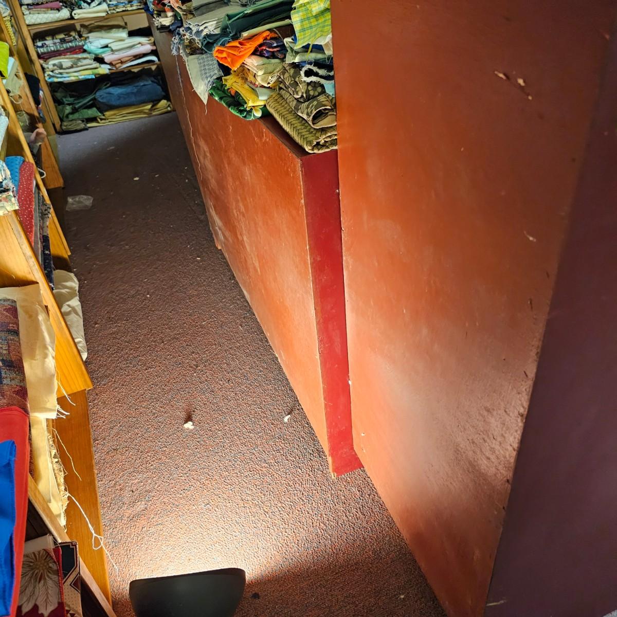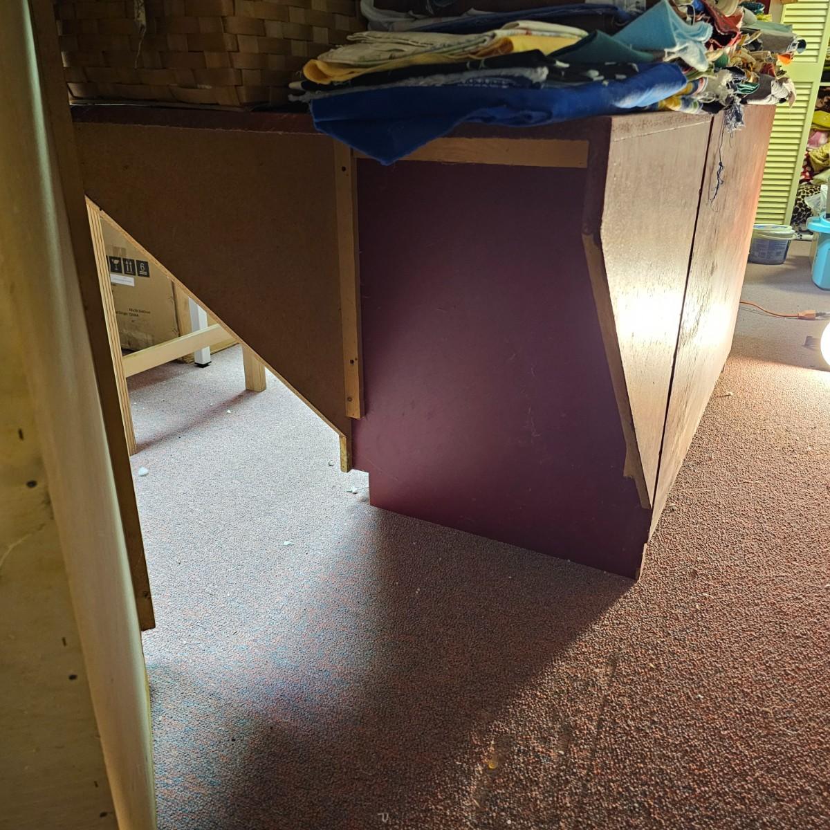 Dark maroon red table top and storage shelves with two drawers units, great for work space or crafting. Table top pieces have some round holes cut in them, probably for cable passage. Entire piece measures 132" x 123" x 42"H, breaks down into six pieces. Two top pieces, two bottom shelf units and two drawer units. Also includes two separate side pieces. Please note, fabric on shelves is NOT included in this lot, but can be found elsewhere in this sale. See photos for details. This item is located in the basement with a flight of stairs or alternatively a garden path with approximately 15 steps that can be used to go around the side of the house. Please bring assistance to remove.