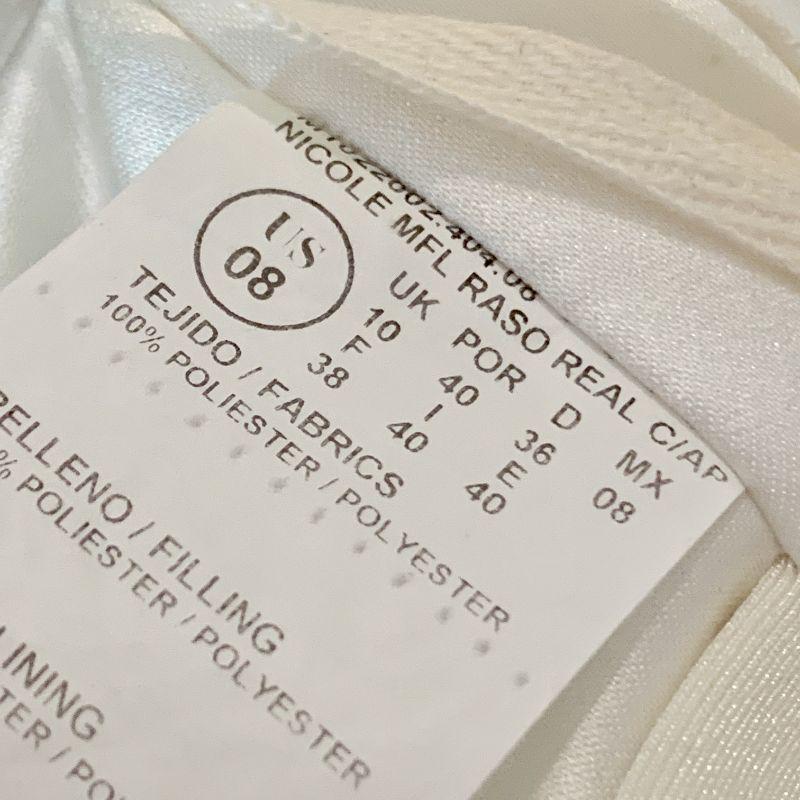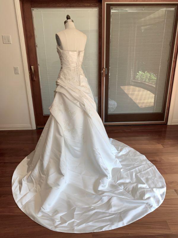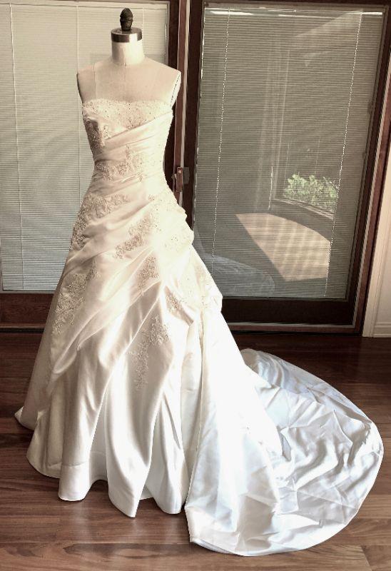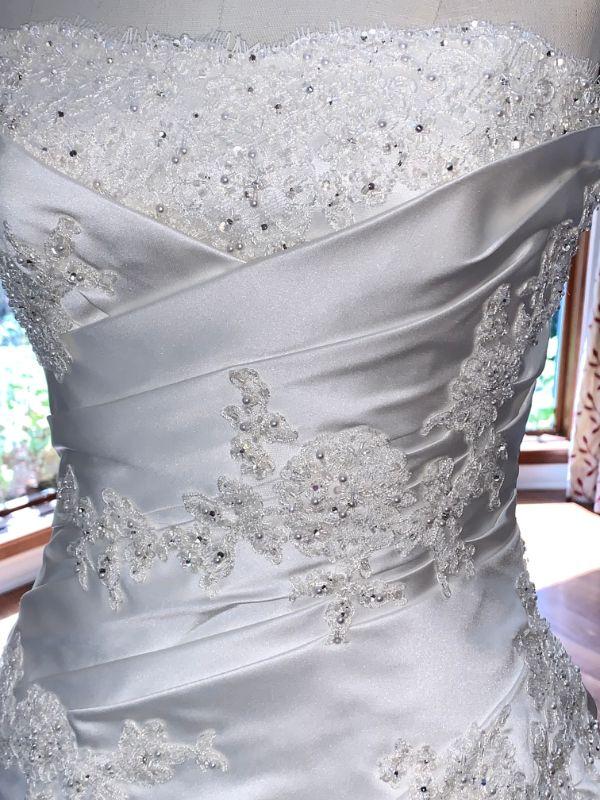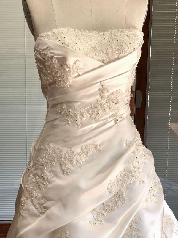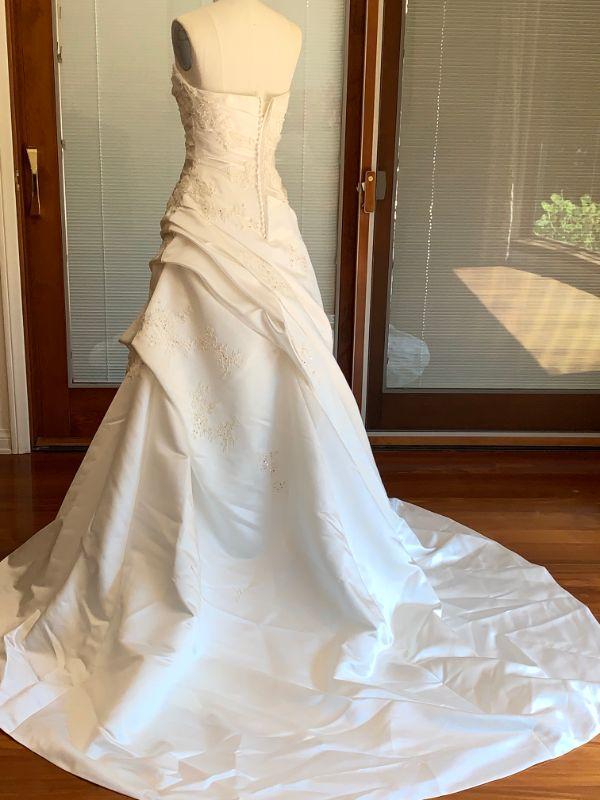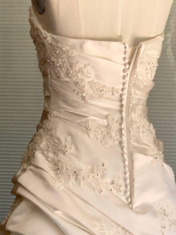 Top international designer of wedding/ Deb ball gowns, Pronovias Barcelona. Strapless white satin swirls around the torso, onto a full skirt and long train. Lace applique embellished with pearls and sequins. Full corset foundation. Tulle underskirt, Back zipper w/hook & eye closure. (thread eye is missing) Covered looped buttons all the way down, hide the zipper. Size 8 FYI: My dress form is a size 6, This dress fits snugly and does not close at the very top. Has been altered, plenty of fabric to be let out again. SAVE HUNDREDS OF $$$ Pictures do not do this stunning gown justice!