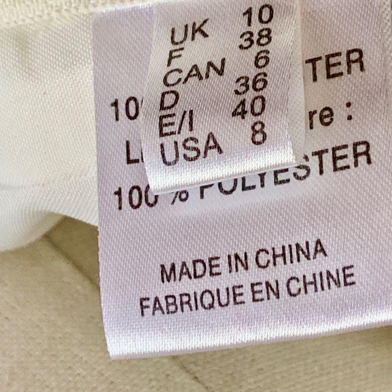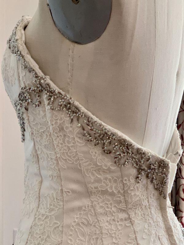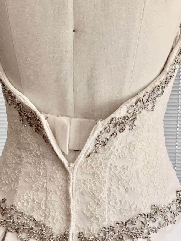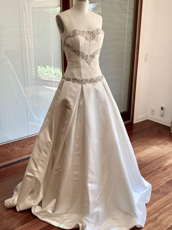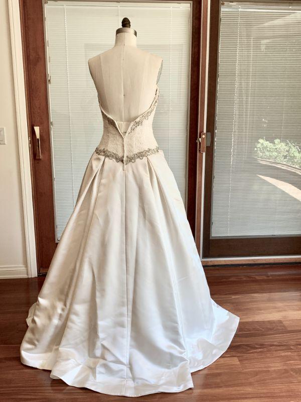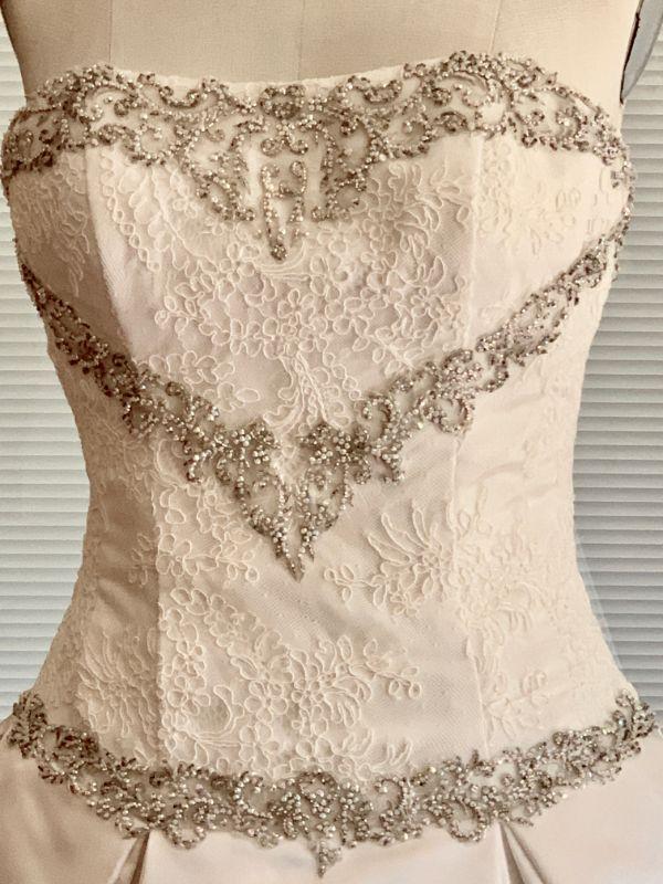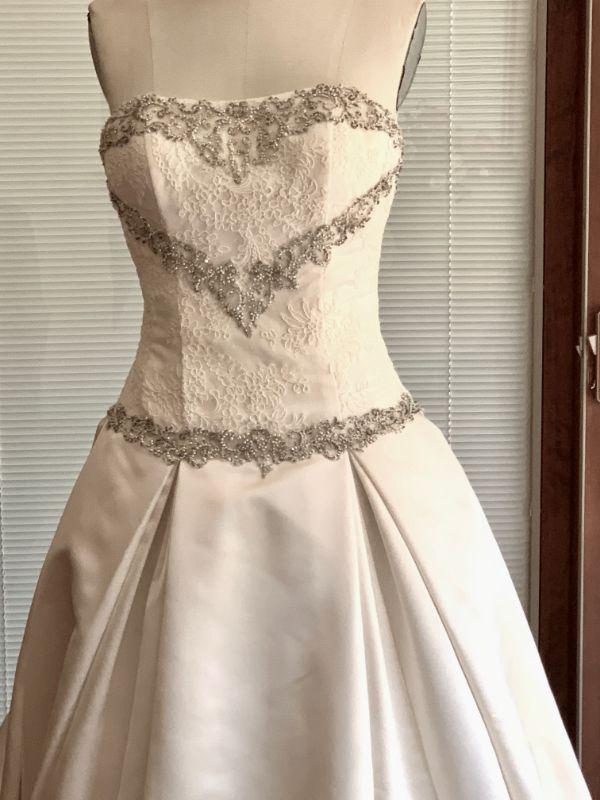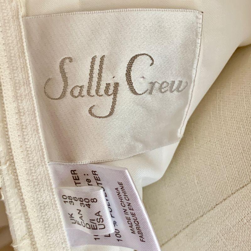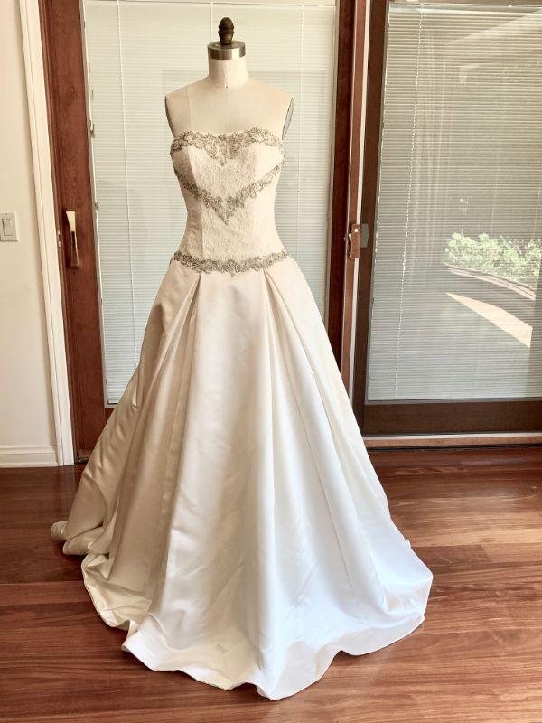 Lovely gown by popular wedding designer Sally Crew. Strapless gown embellished with silver crystal beads. Box pleat full skirt, tulle underskirt. Size 8, FYI my dress form is a size 6 and this dress fits snugly and will not close at the very top. This dress has been taken in and can be let out again.