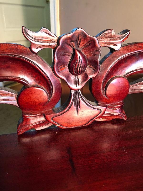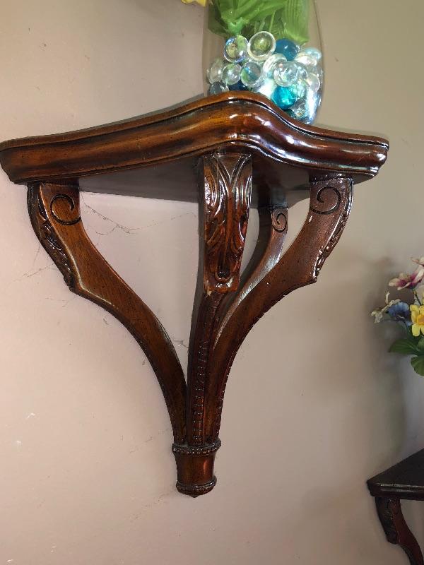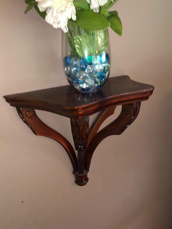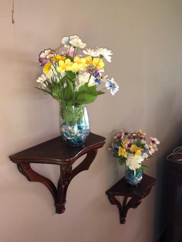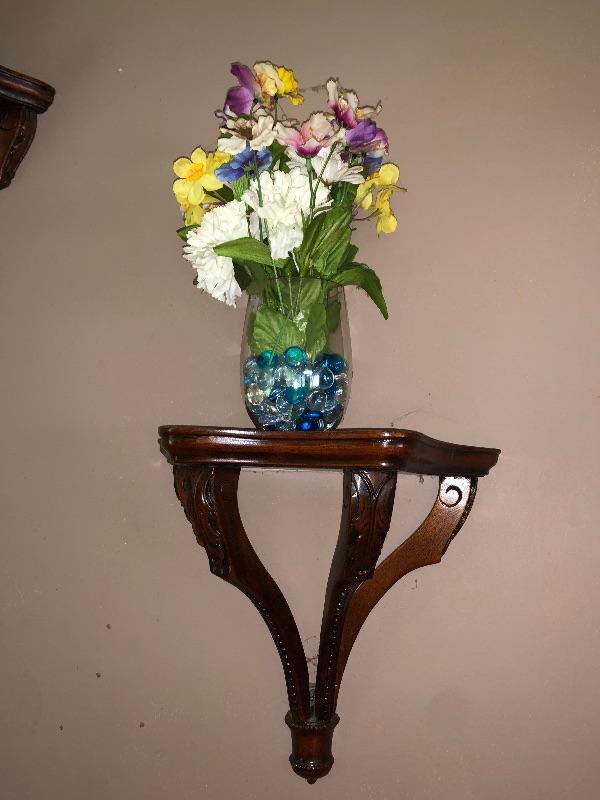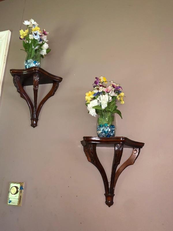 Pair of hand carved Mahogany Hanging Wall Shelves. Glass vase and flowers as shown in pictures are included.