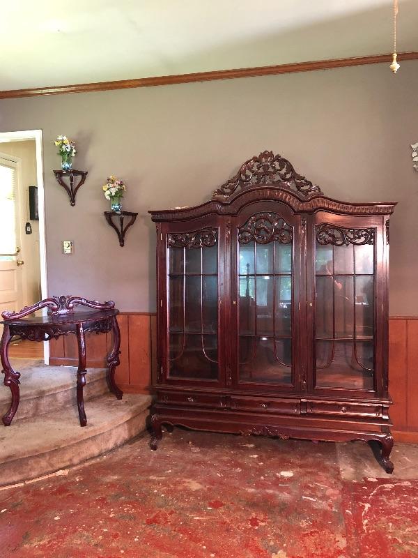 LOT 4 - Antique Mahogany Half Moon Table, Mahogany China Cabinet, & Shelves