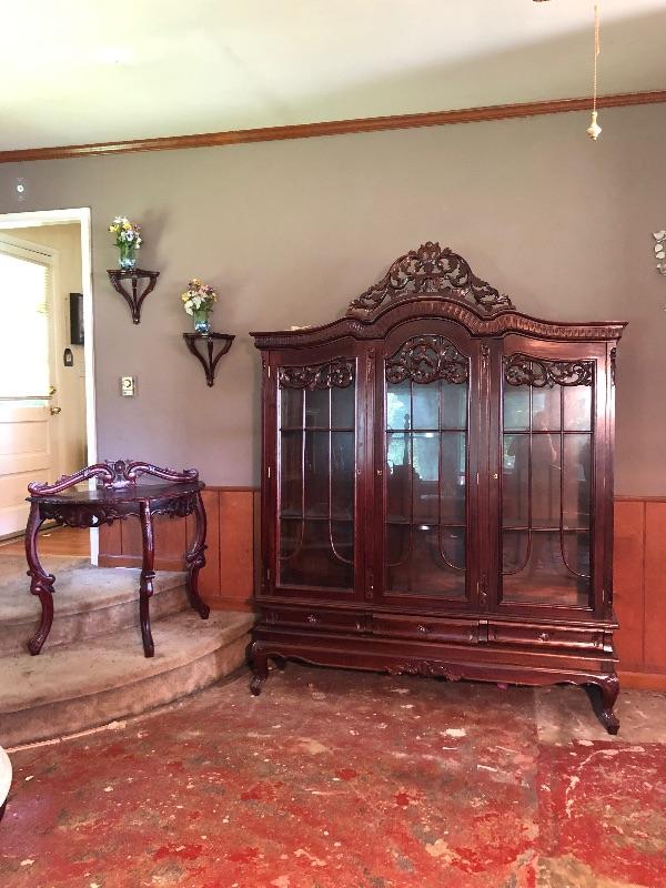LOT 4 -  Antique Mahogany Half Moon Table, Mahogany China Cabinet, & Shelves