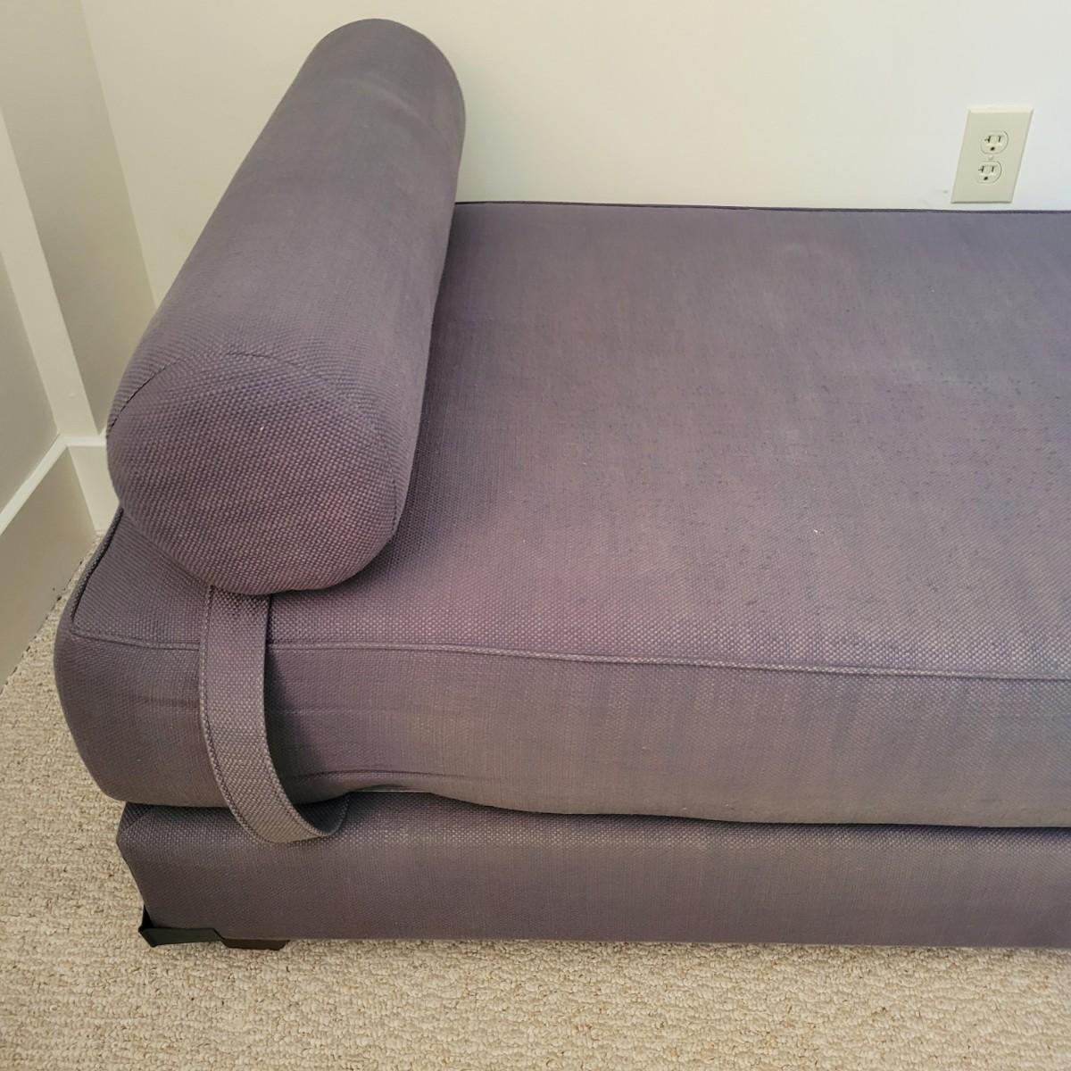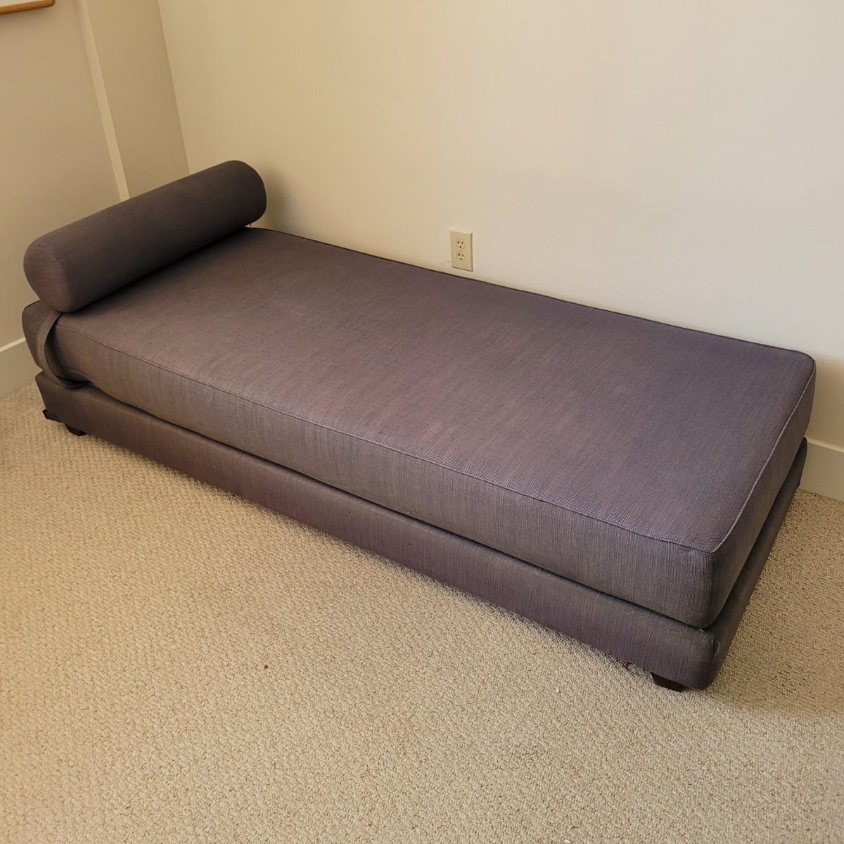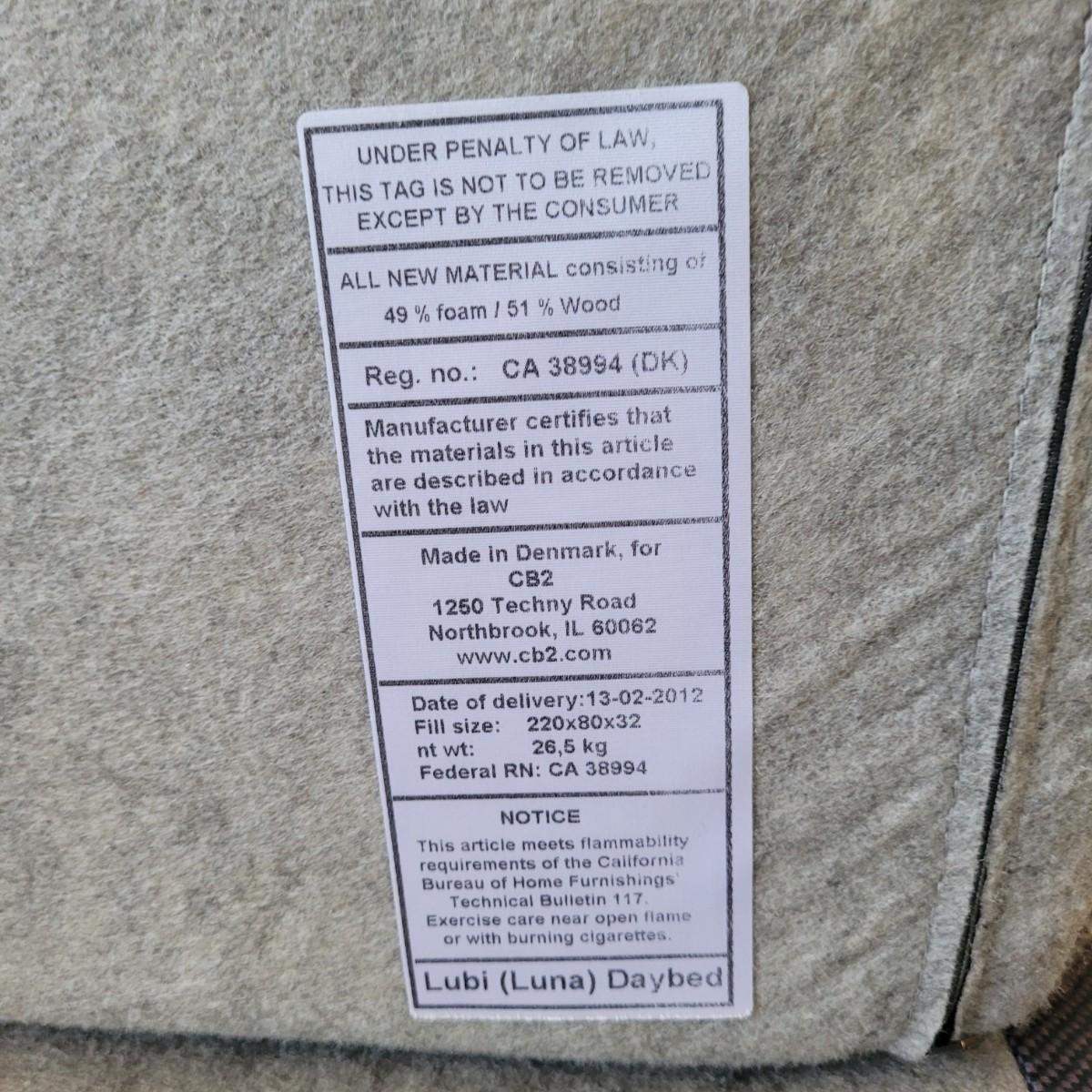 This lot includes one Lubi brand "Luna" style daybed. The bed comes in a graphite color. It is two separate pieces. One top piece with mattress and attached pillow, and a lower portion with support and feet. This bed sold at retail for $1,100 in 2012 and includes original receipt. The bed measures 77" x 32" x 17"H.