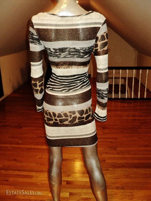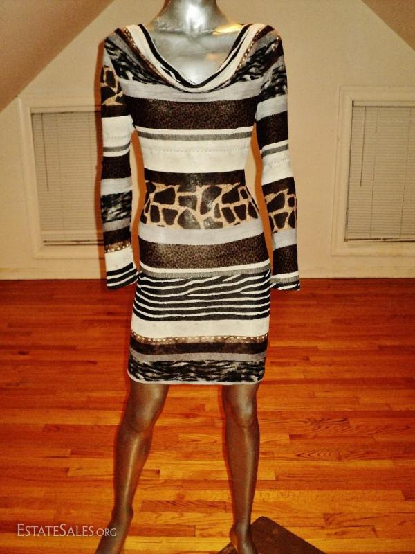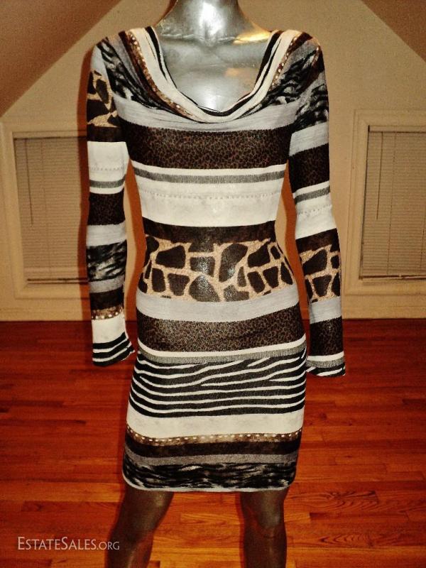 Gorgeous little dress for party, cocktail or work. Animal print on a very soft and fluid fine knit with open draped collar. In very good almost new condition.