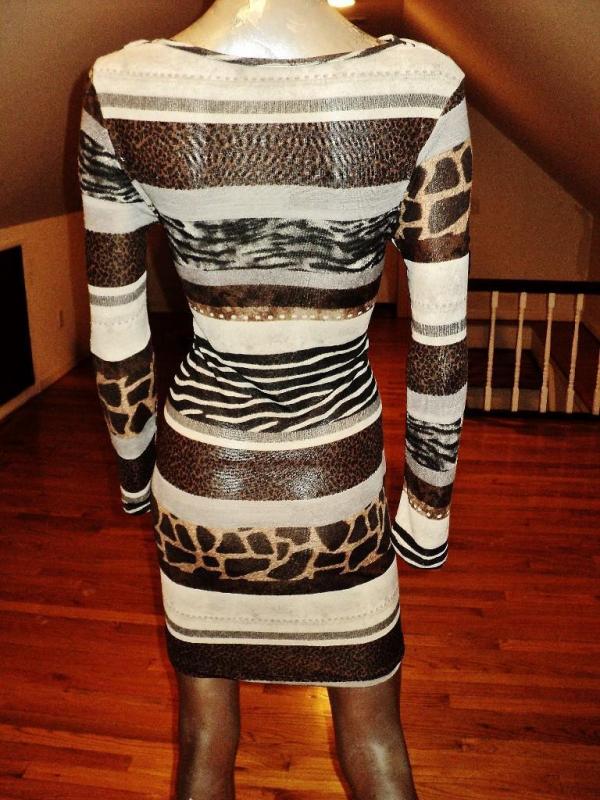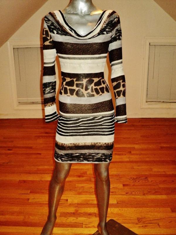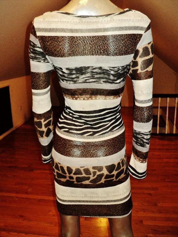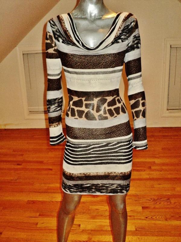 Gorgeous little dress for party, cocktail or work. Animal print on a very soft and fluid fine knit with open draped collar. In very good almost new condition.