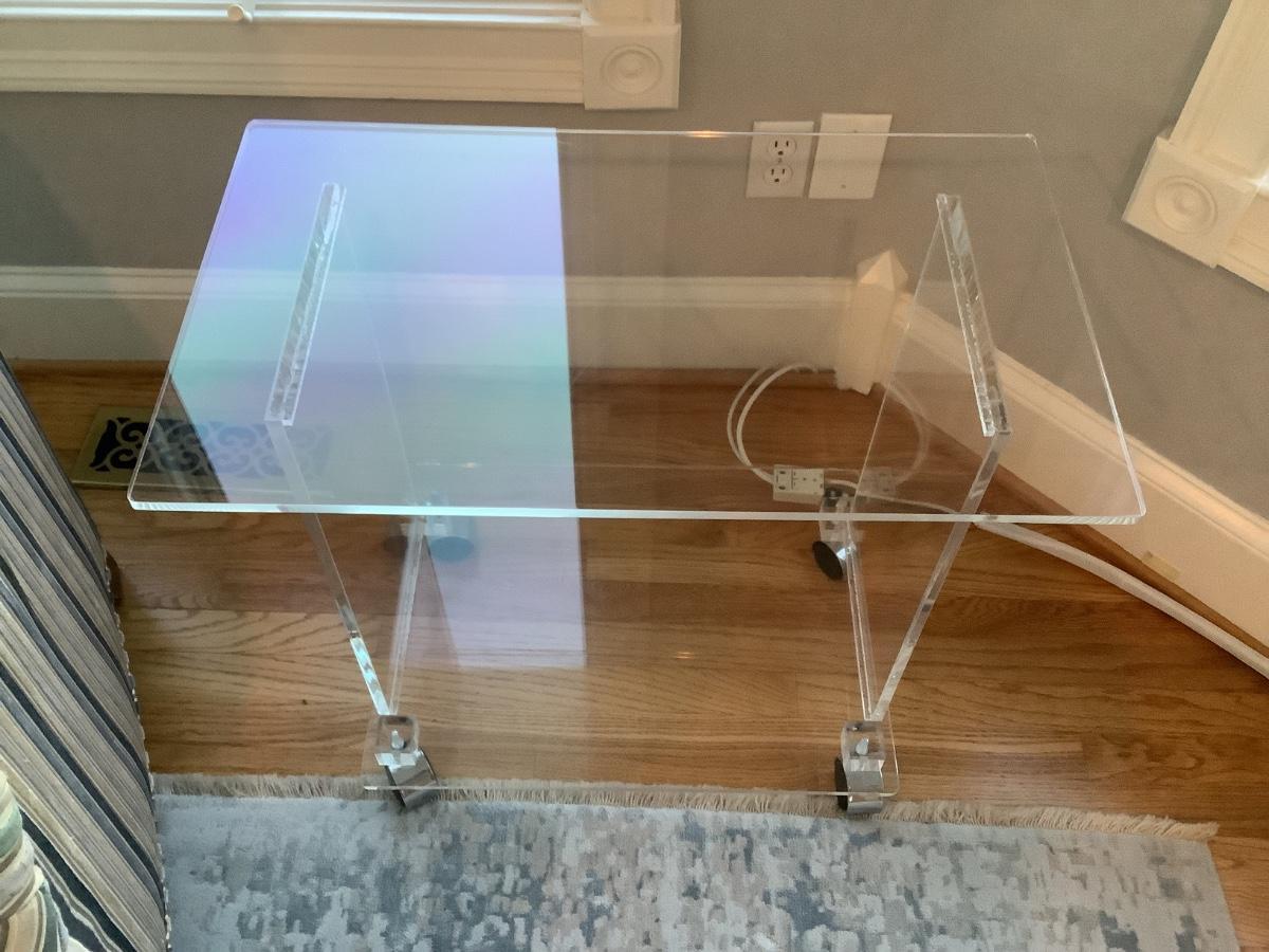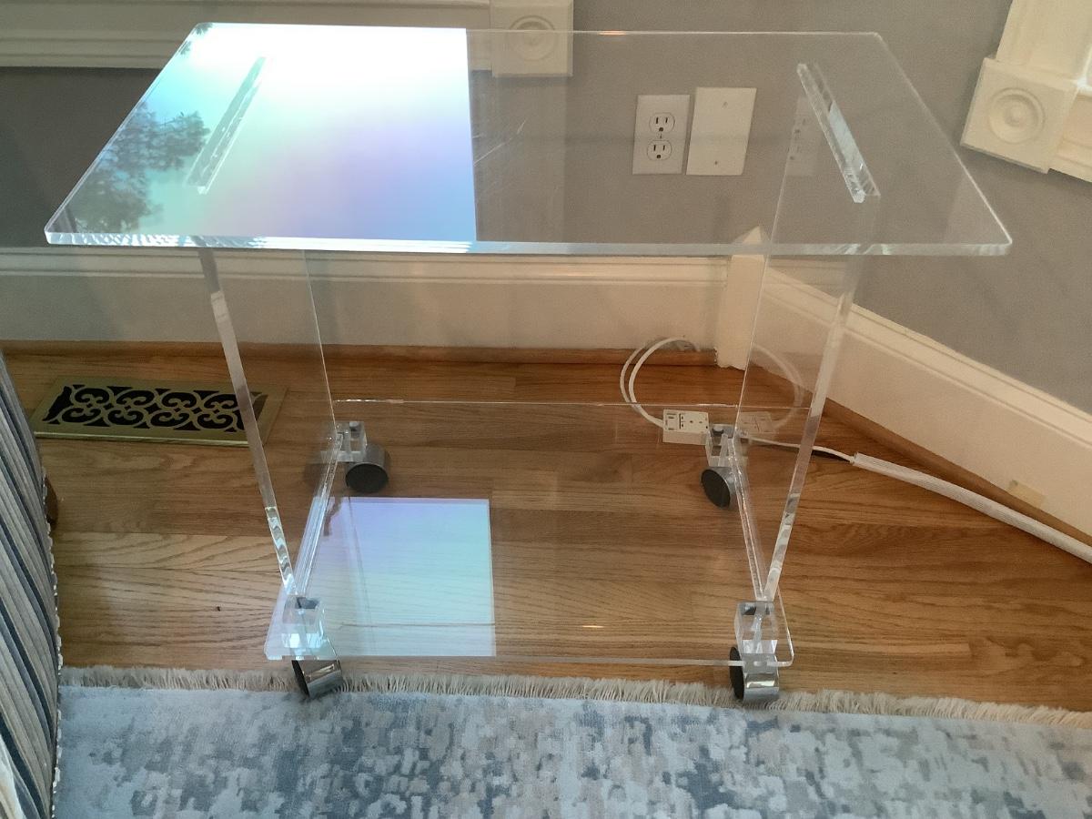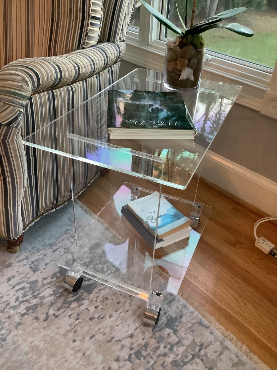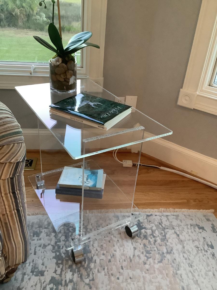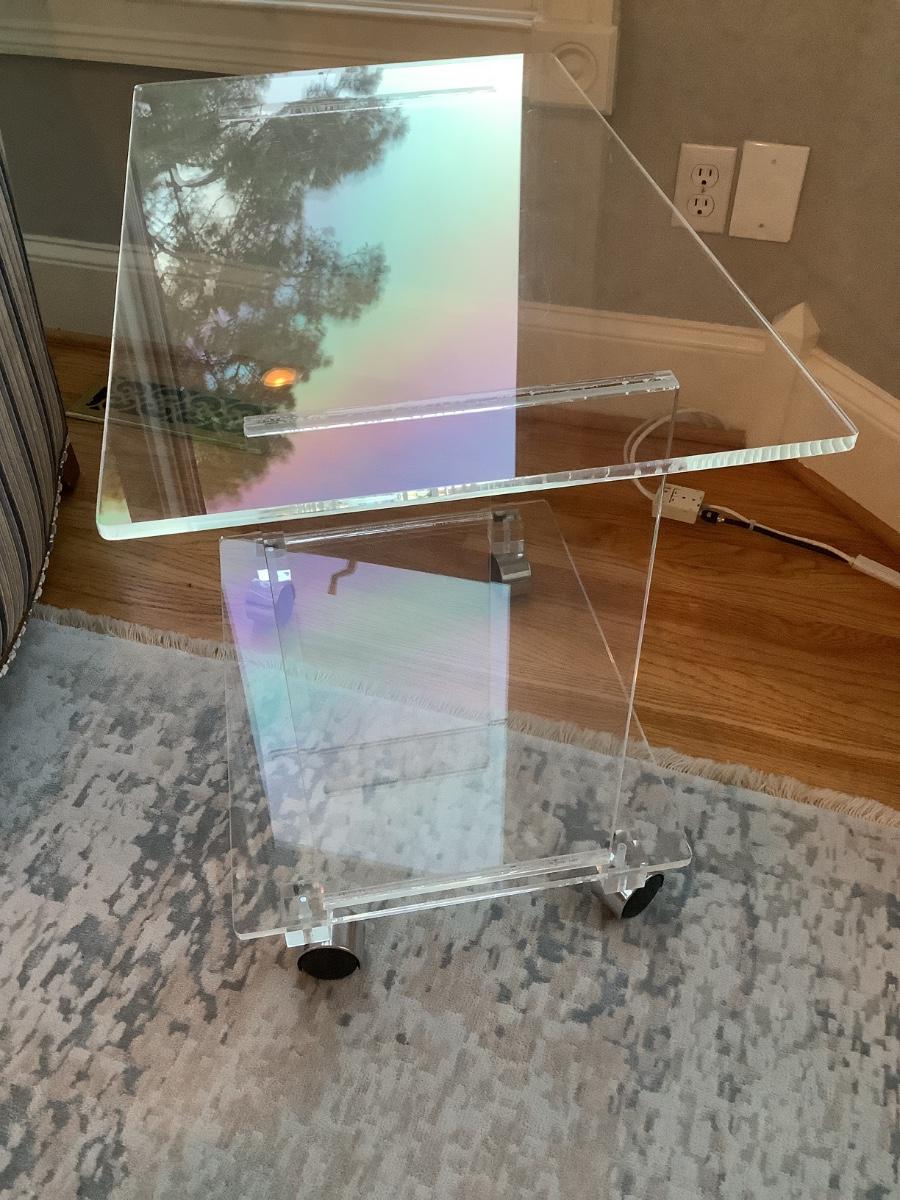 Lucite 2 tier side table on casters 24"H 27"L 16"W