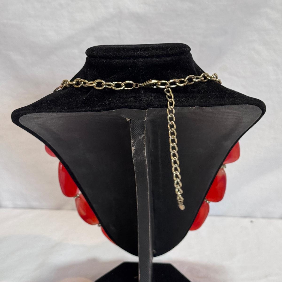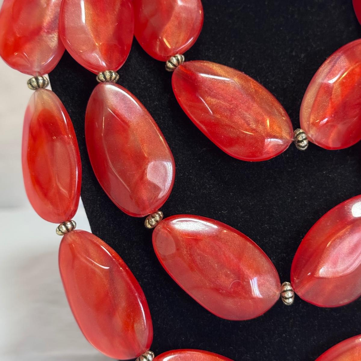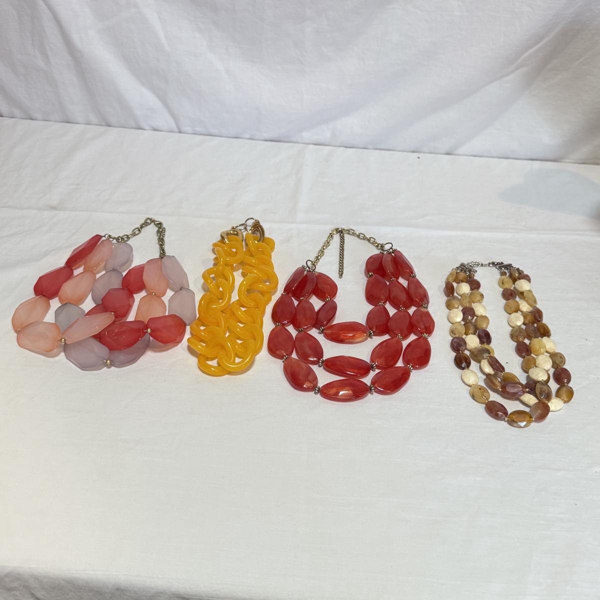 This lot includes four lucite statement necklaces. You’ll find a red triple layered lucite necklace, an earth-toned triple layered beaded necklace, a yellow lucite chain-link necklace, and a purple and pink lucite necklace. The yellow necklace is the longest that measures 18” long. Shipping available. All sales are final. No returns or refunds. Please bid accordingly.