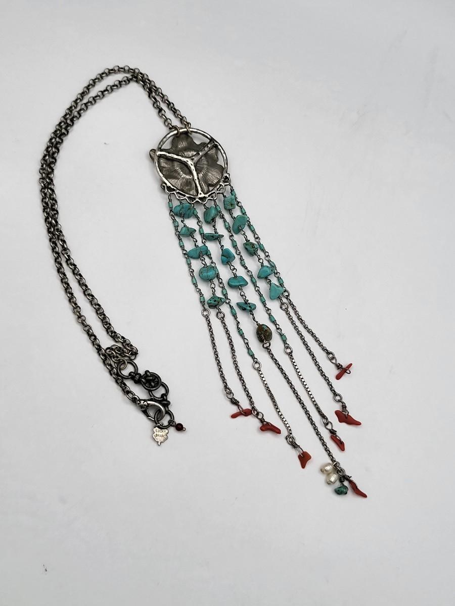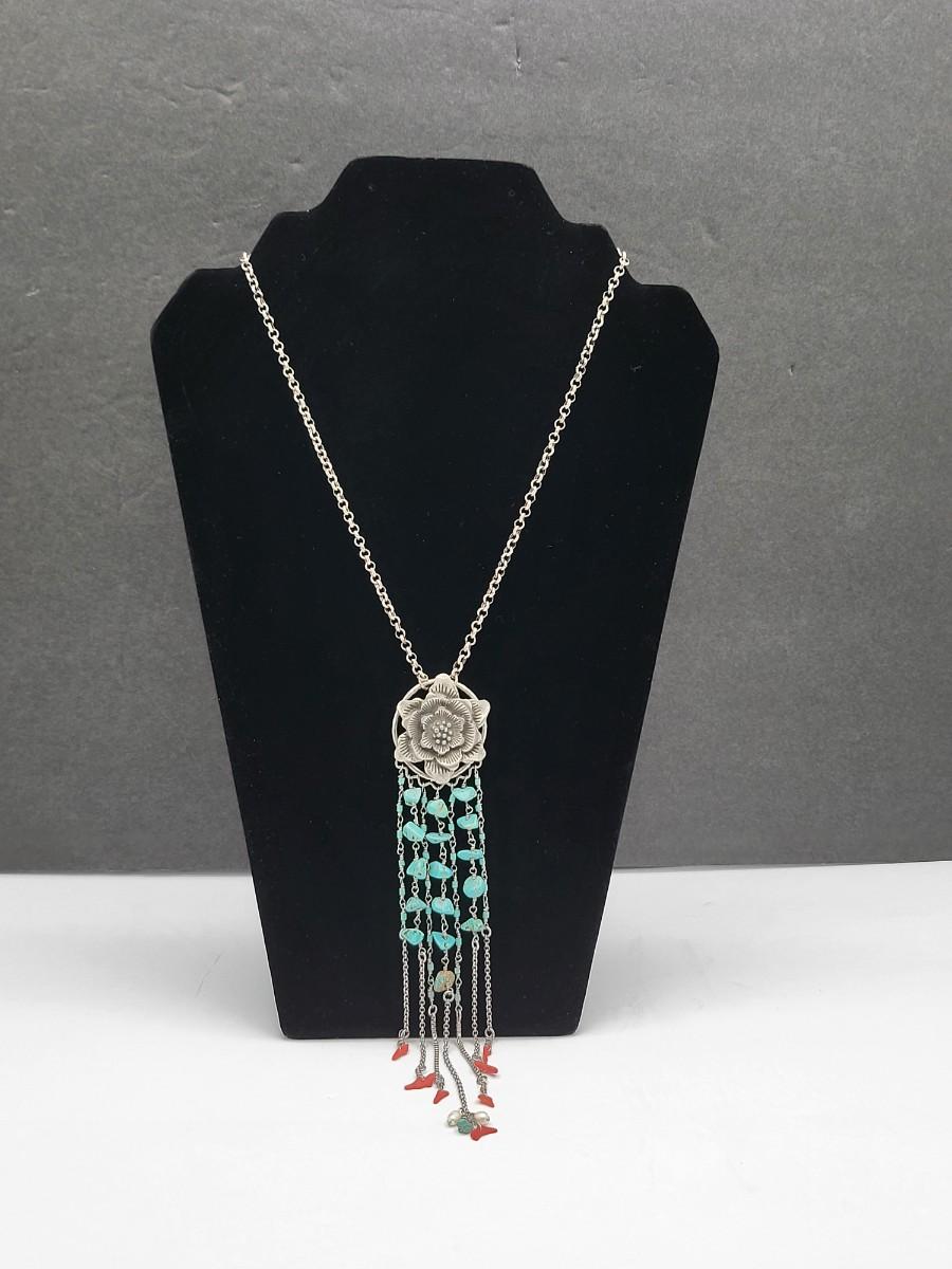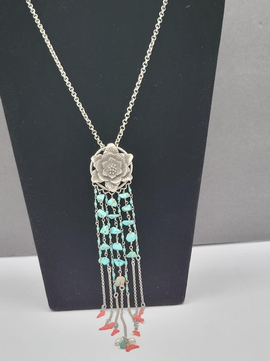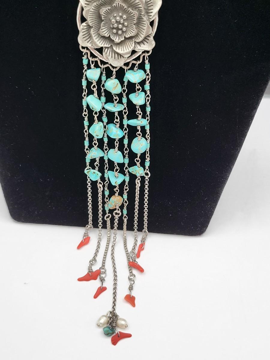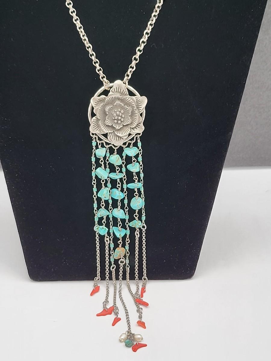 Pewter tone floral medallion pendant with seven turquoise & coral cascading tassels. Wearable length measures 19" with the tassel pendant 6" long. Very end of the tassel is two small genuine pearls.