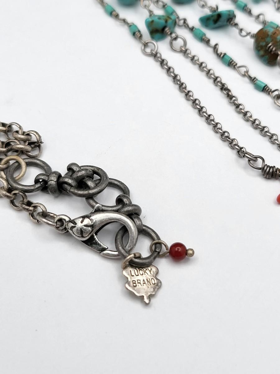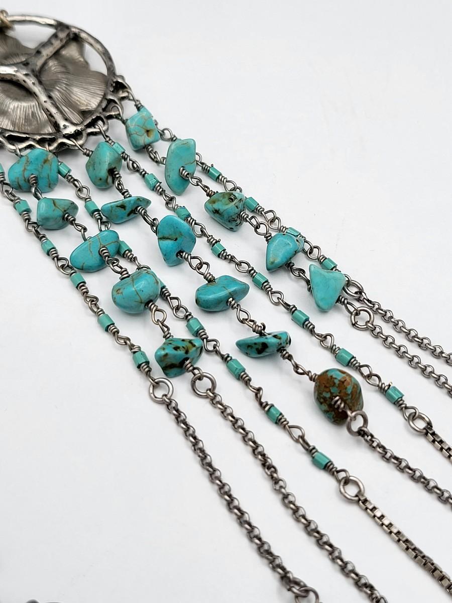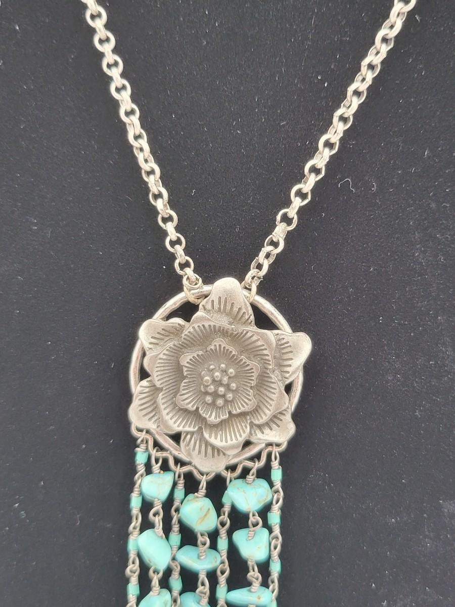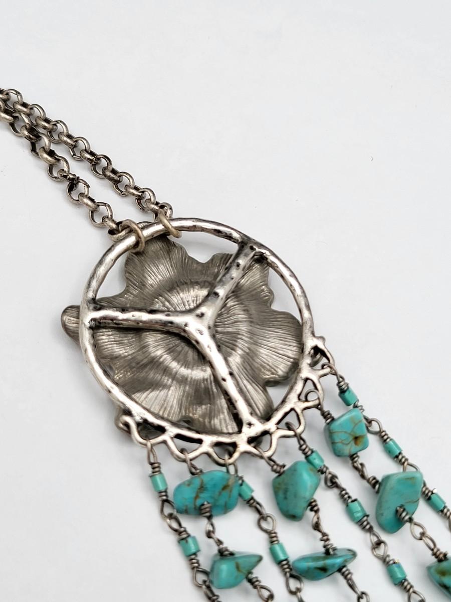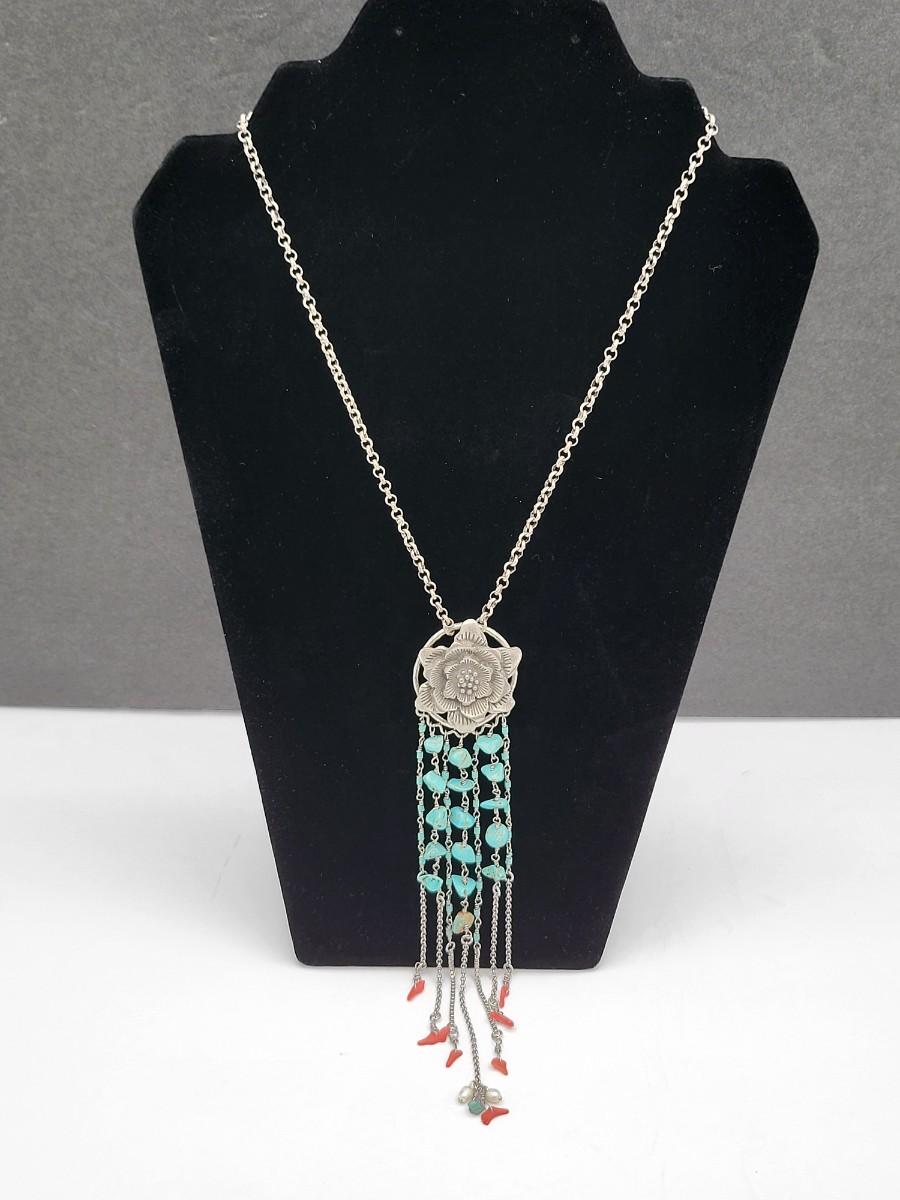 Pewter tone floral medallion pendant with seven turquoise & coral cascading tassels. Wearable length measures 19" with the tassel pendant 6" long. Very end of the tassel is two small genuine pearls.