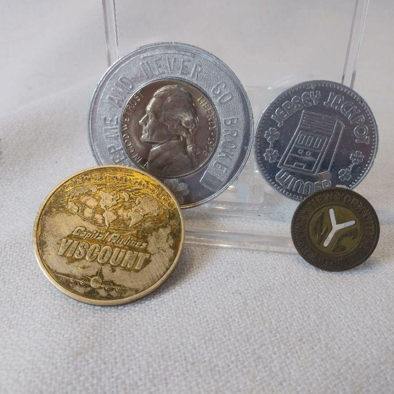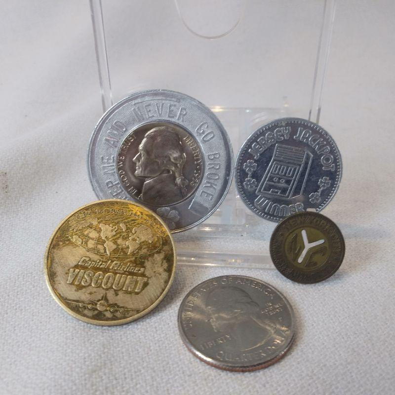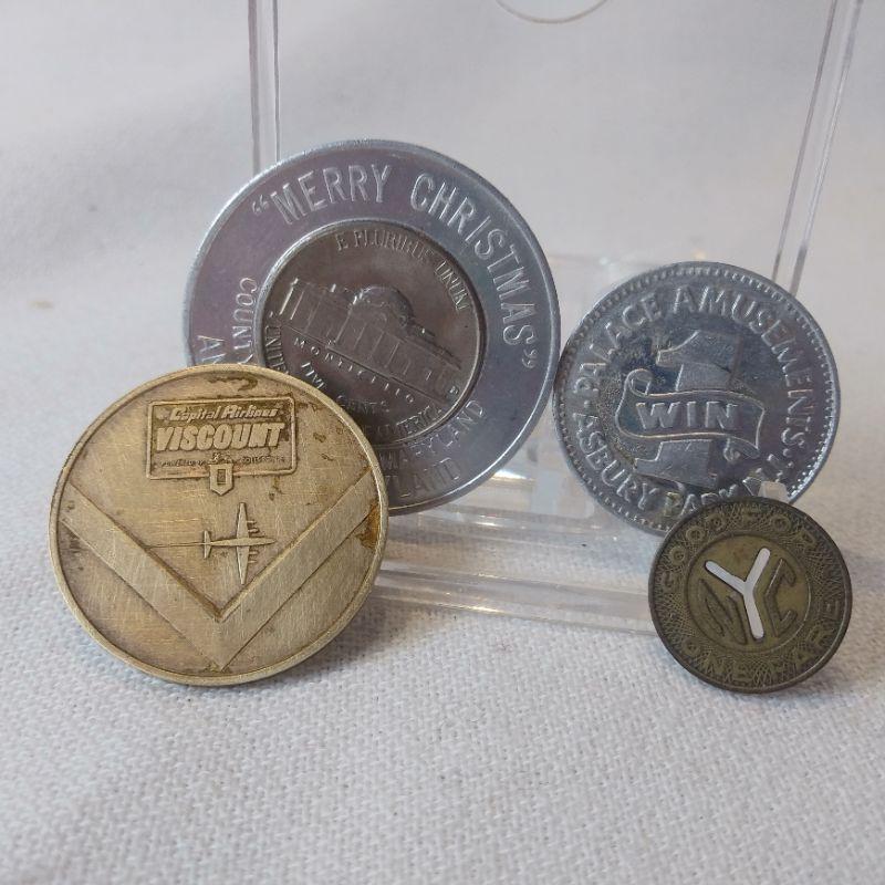 This is a fun grouping of a "Lucky Nickel" dated 1956, a NYC Subway token, Asbury Park, NJ Amusement coin and a Capital Airlines "Viscount" Coin. First time we have seen a Lucky Nickel, must not be quite as common as the Lucky Penny. All in fair condition, they were evidently carried and used.