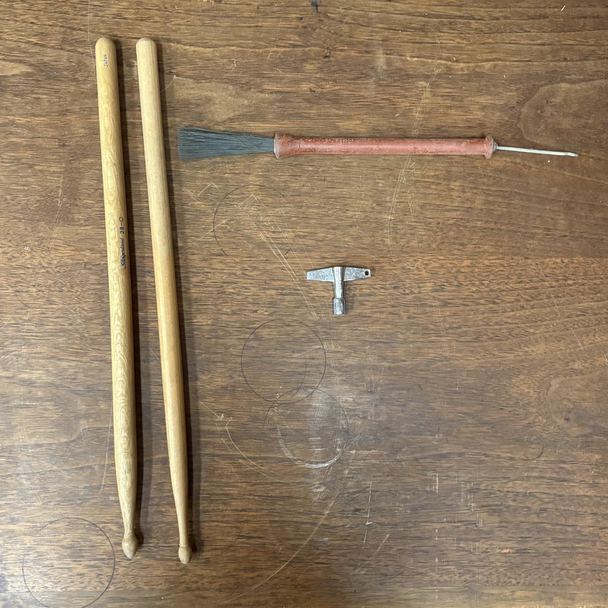 This kit includes a Ludwig Acrolite Snare Drum, a case, a collapsible snare drum stand, a vacuum drum pad, a set of drum sticks, a drum brush, and a drum tuner. The measurements of the drum are approximately 14"D x 6"H. The case and drum both show signs of blemishes, see pictures.