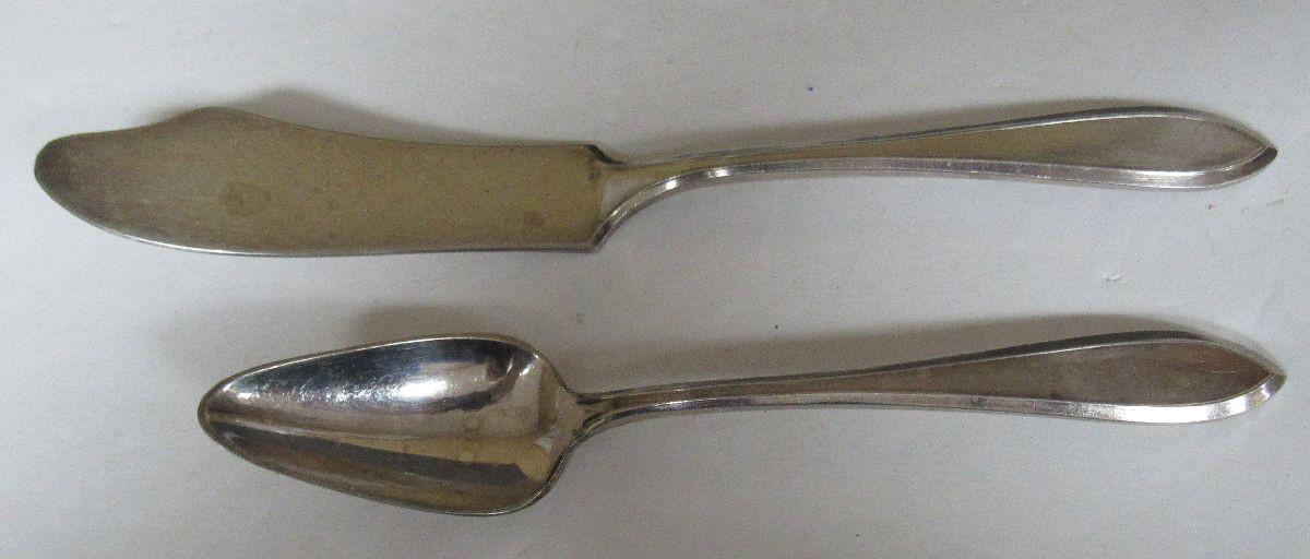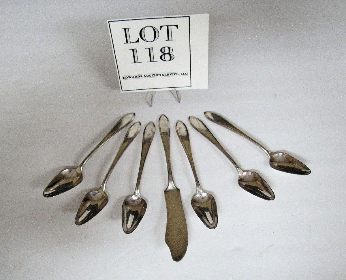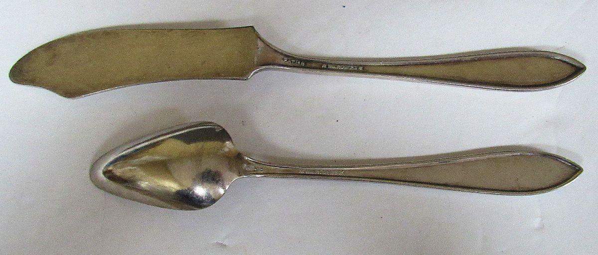 The spoons look like fruit spoons but they do not have serrated edges, so not sure what they are. Good but needs cleaning and polishing. Shipping is available at shipping cost plus $5.00 handling fee on one box, $10.00 handling fee on two boxes, $15.00 handling fee on 3 boxes. Helps cover shipping materials and labor cost.