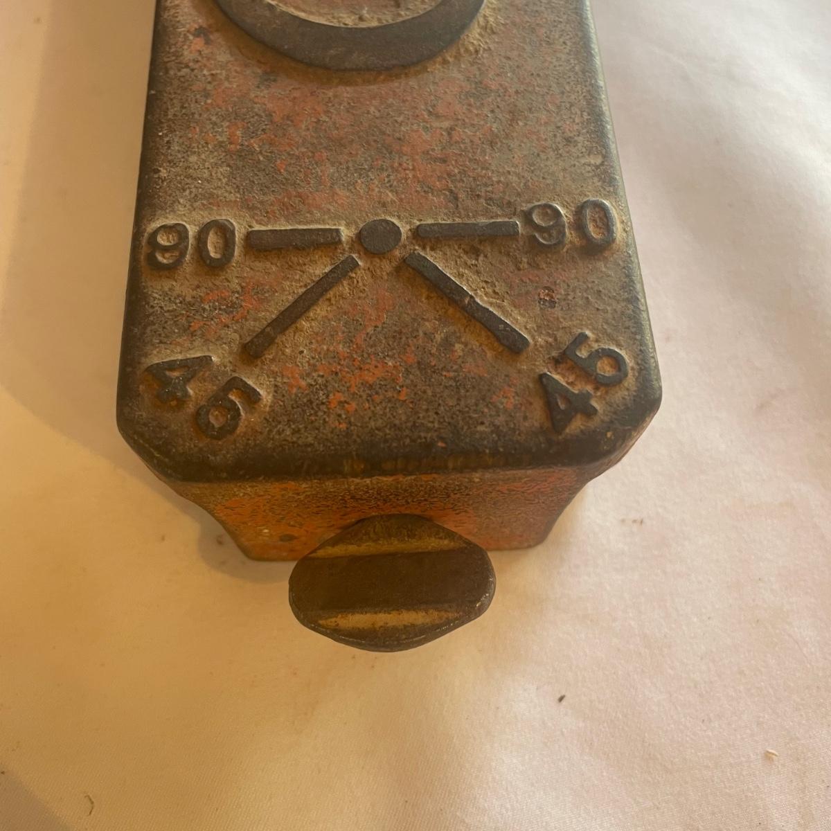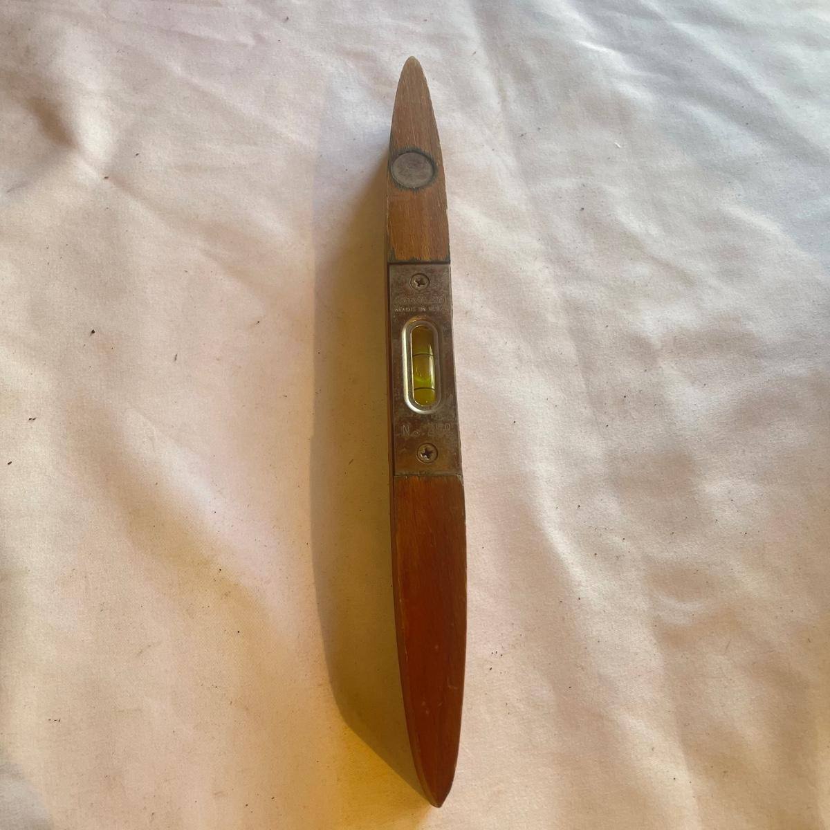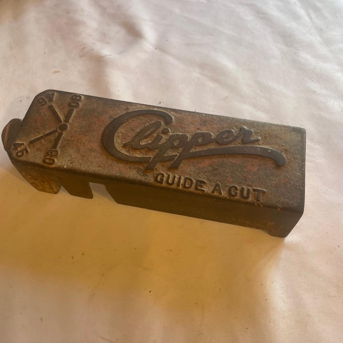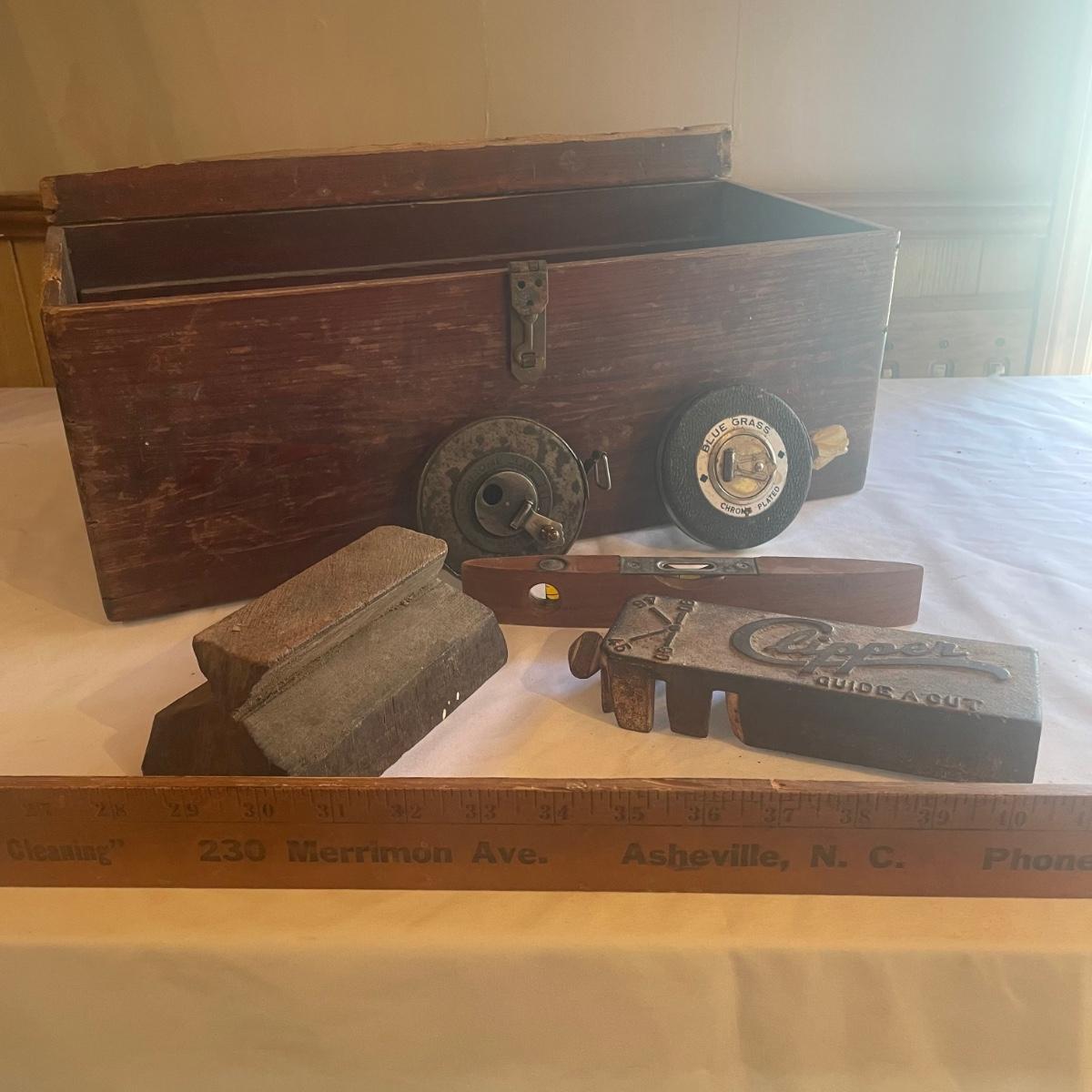 Vintage Clipper "Guide a Cut" Miter Box made of heavy metal. Lot also has two antique tape measures that both work but one does have some tape on the end as the first couple of inches are broken off. Also included is a wooden ruler from an Asheville Co,. a wooden level and more. Note the toolbox is missing it’s top but as it’s a great antique box we threw it in with these other antique tools.