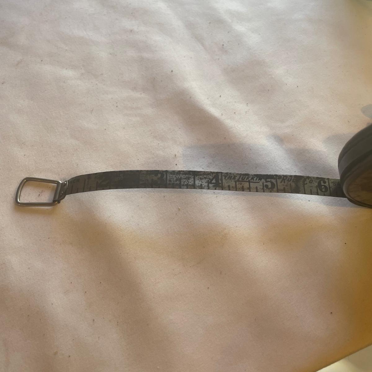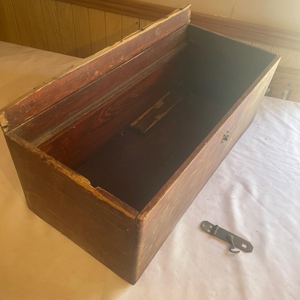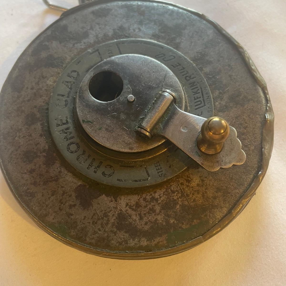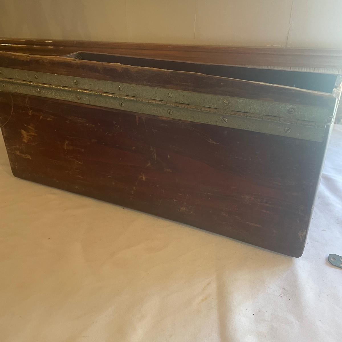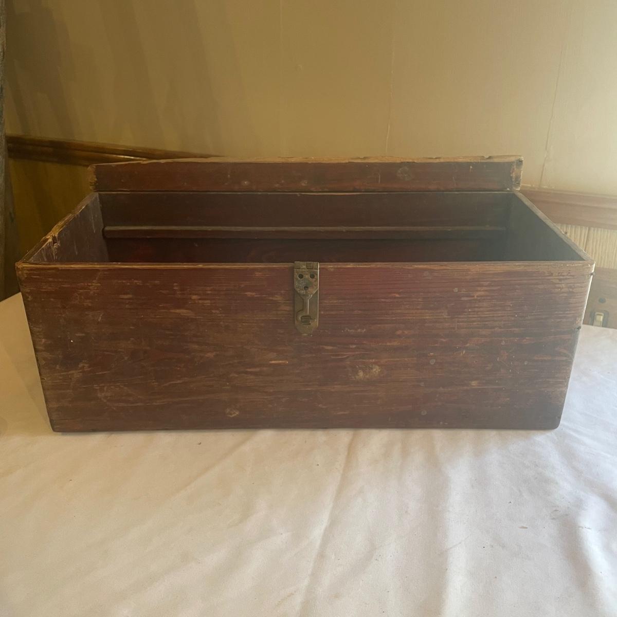 Vintage Clipper "Guide a Cut" Miter Box made of heavy metal. Lot also has two antique tape measures that both work but one does have some tape on the end as the first couple of inches are broken off. Also included is a wooden ruler from an Asheville Co,. a wooden level and more. Note the toolbox is missing it’s top but as it’s a great antique box we threw it in with these other antique tools.