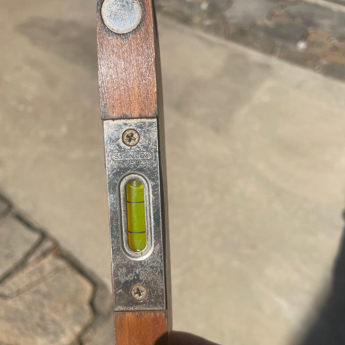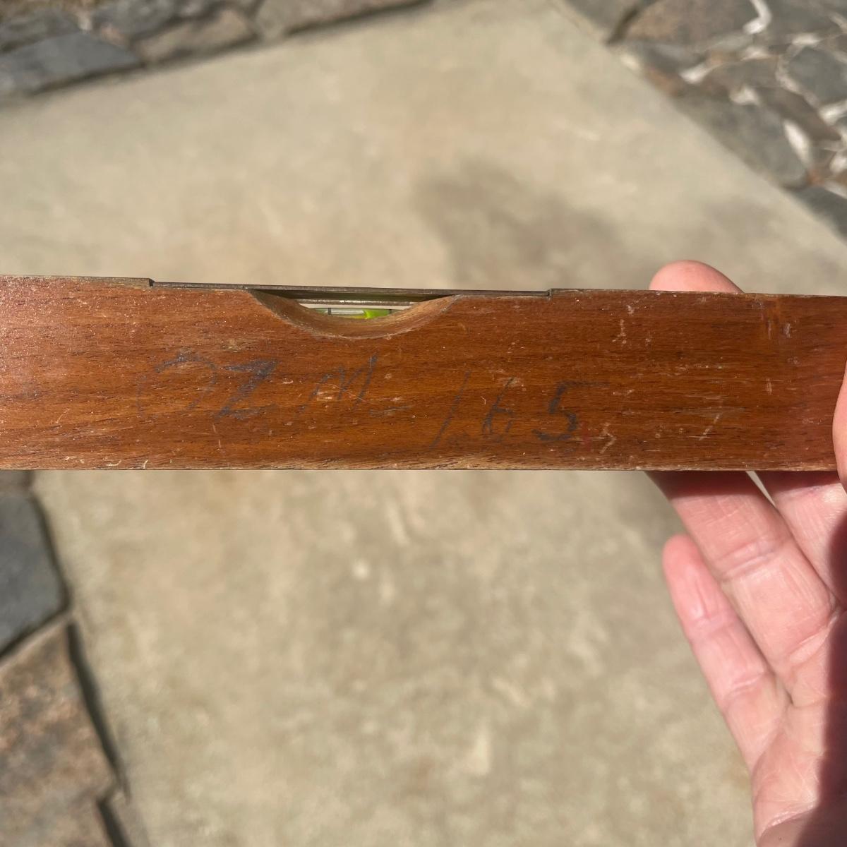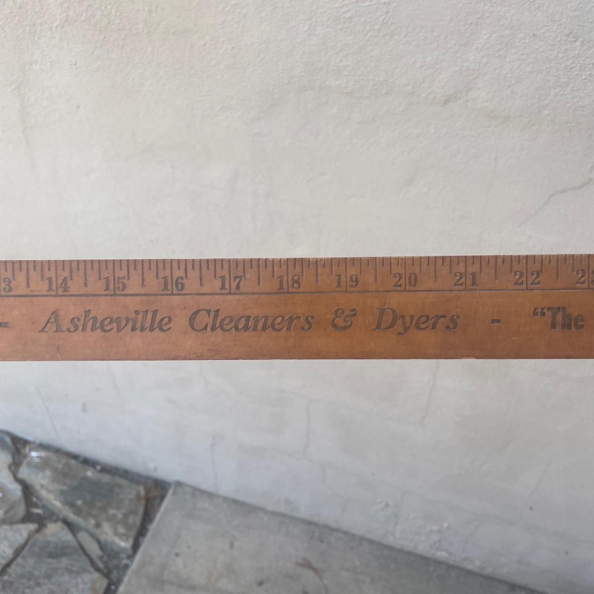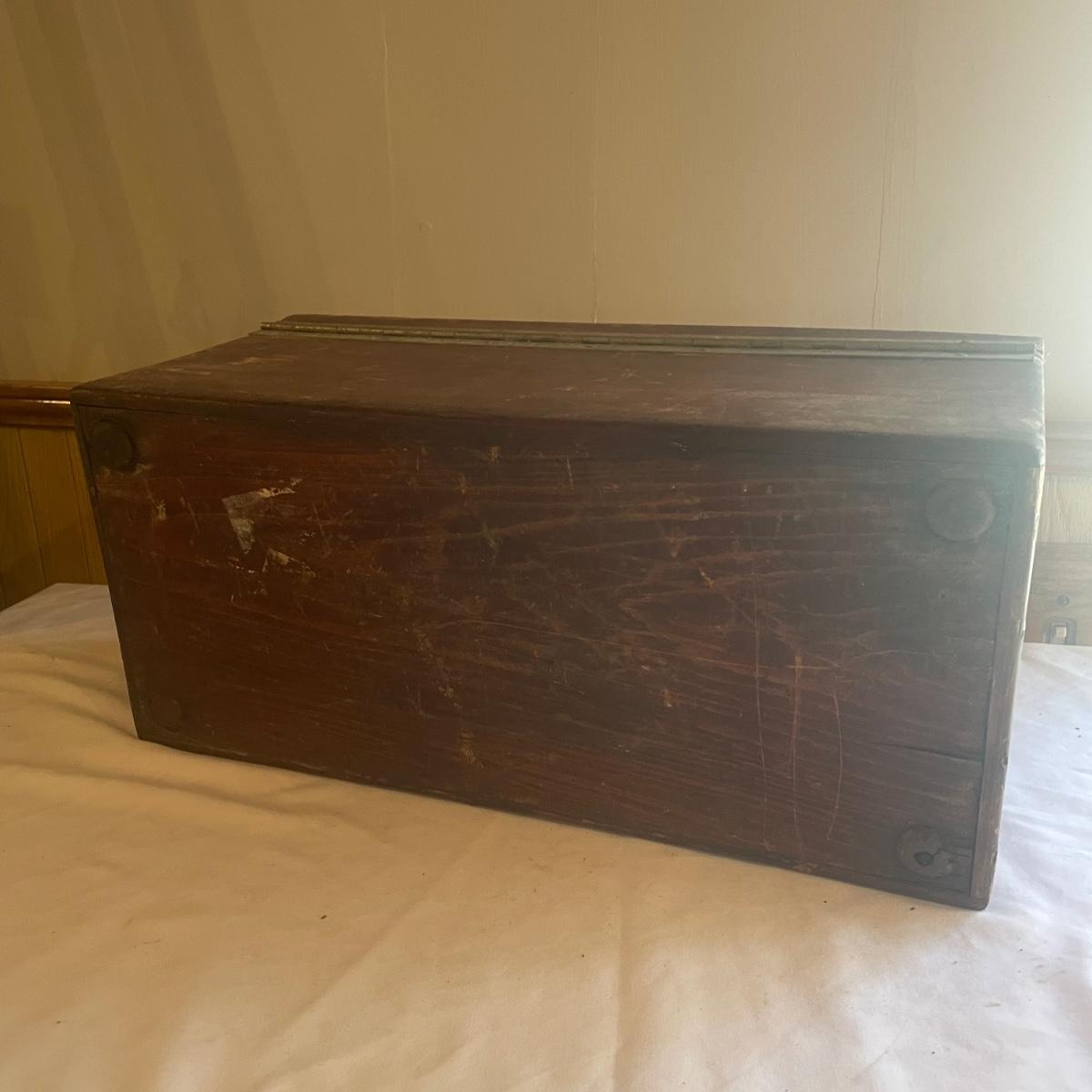 Vintage Clipper "Guide a Cut" Miter Box made of heavy metal. Lot also has two antique tape measures that both work but one does have some tape on the end as the first couple of inches are broken off. Also included is a wooden ruler from an Asheville Co,. a wooden level and more. Note the toolbox is missing it’s top but as it’s a great antique box we threw it in with these other antique tools.