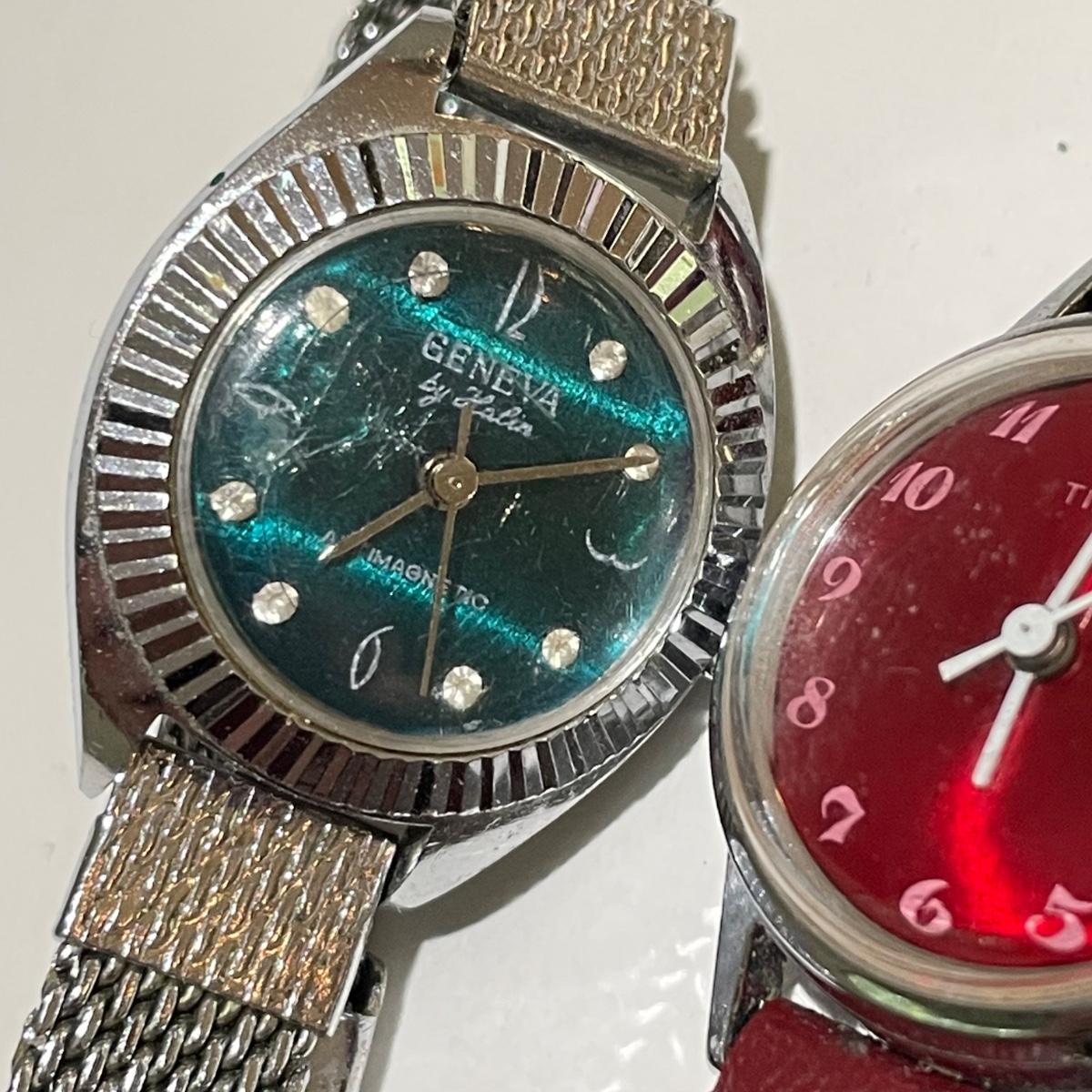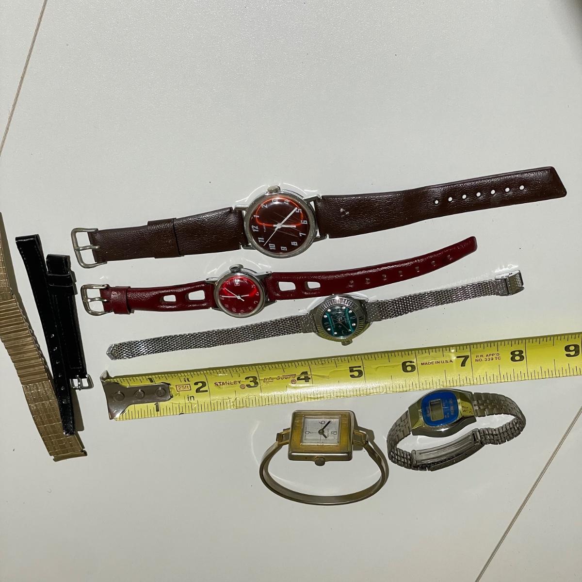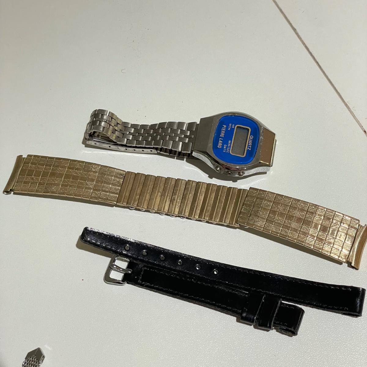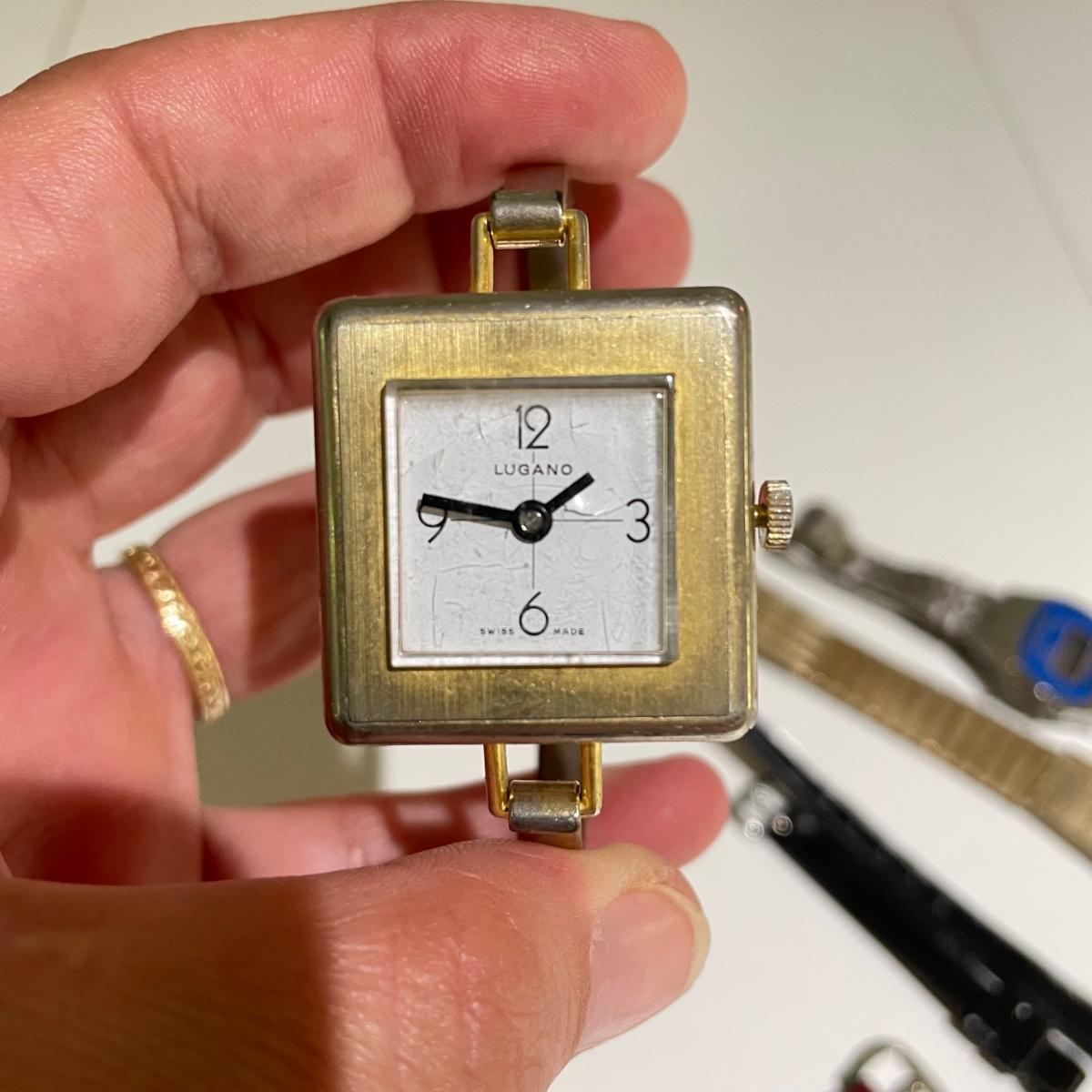 Metal Lugano wrist watch with a unique metal band, a Geneva and two Timex wrist watches. Lot includes an extra black leather band and a metal adjustable band with a digital Pierro Laro watch. No watches were tested, it’s possible just a battery is all the is necessary for use. See images. Shipping available.