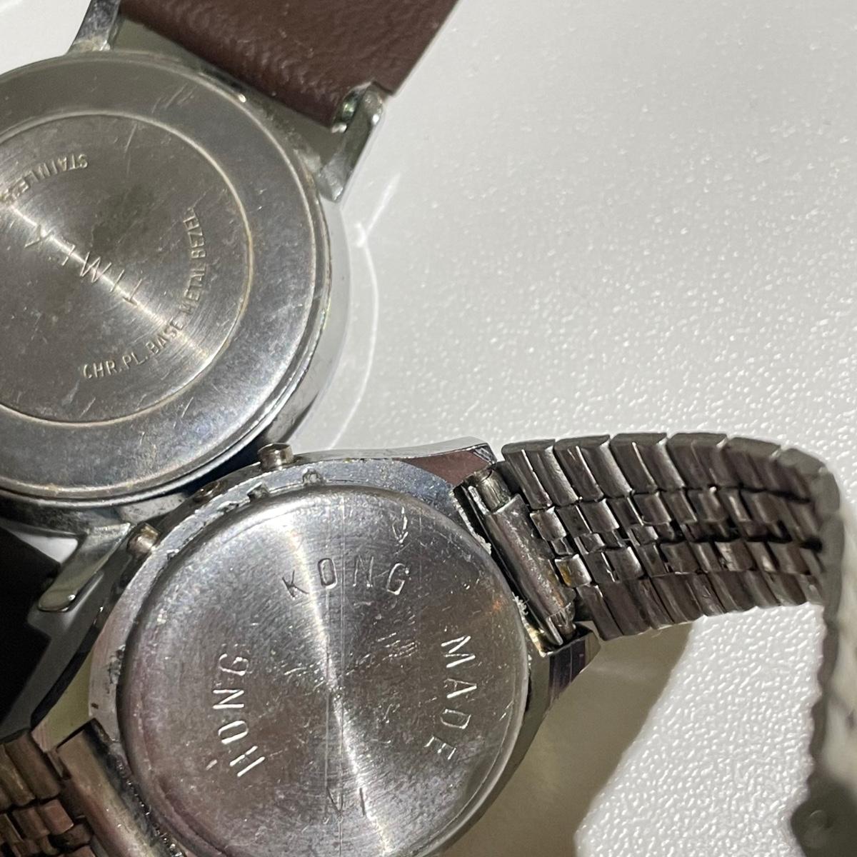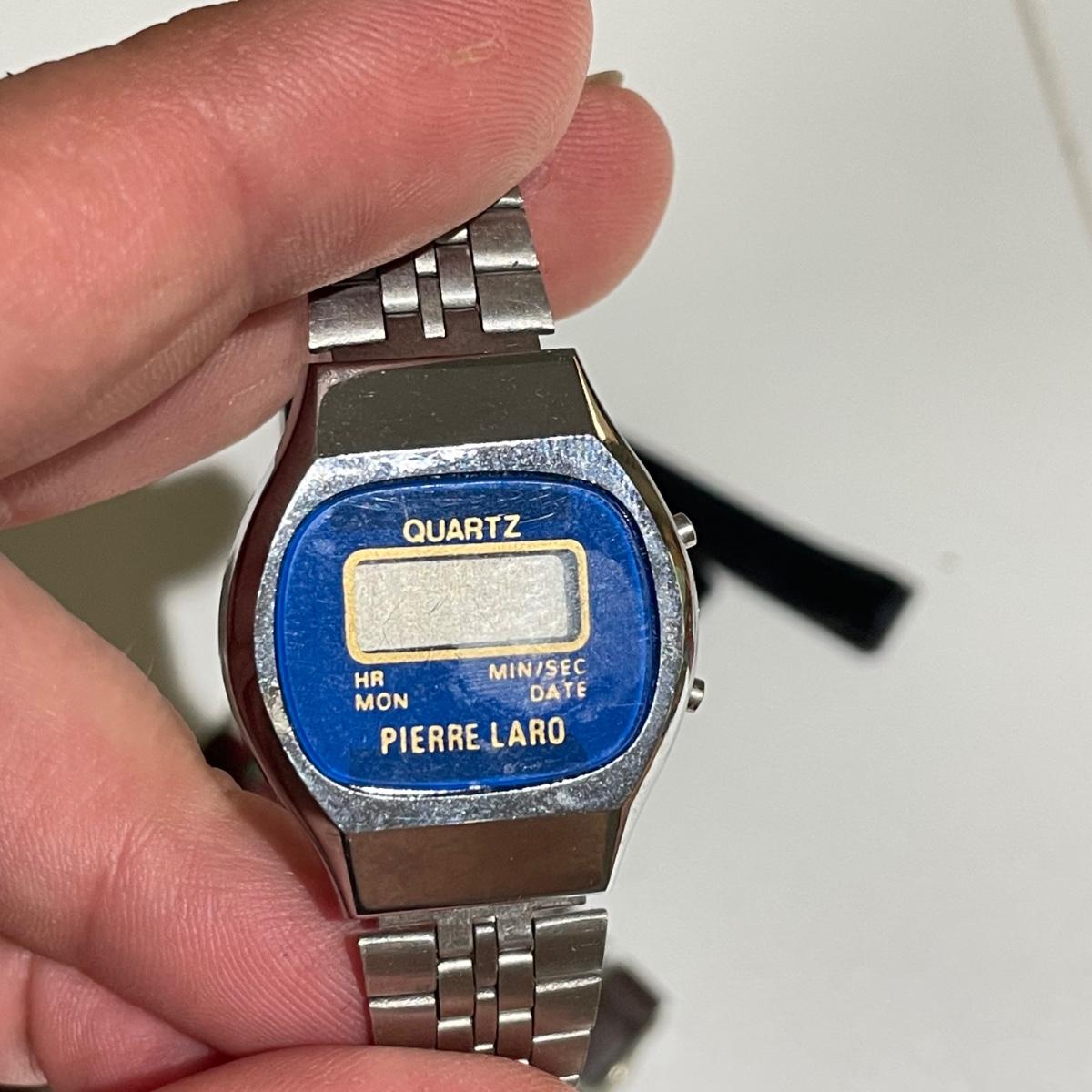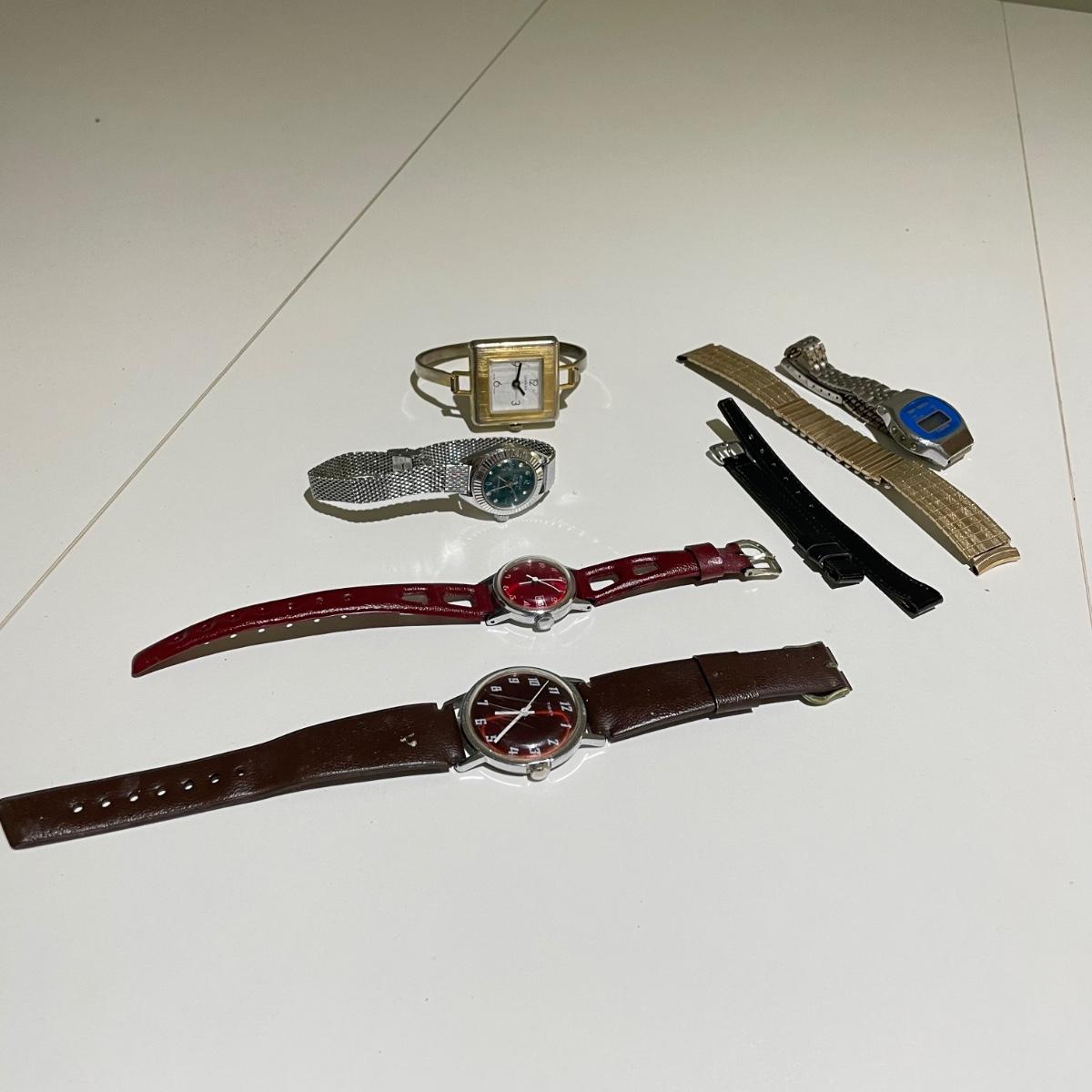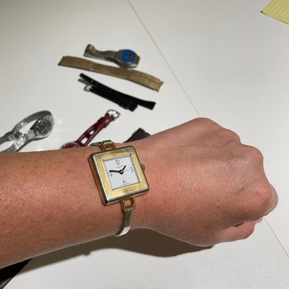 Metal Lugano wrist watch with a unique metal band, a Geneva and two Timex wrist watches. Lot includes an extra black leather band and a metal adjustable band with a digital Pierro Laro watch. No watches were tested, it’s possible just a battery is all the is necessary for use. See images. Shipping available.