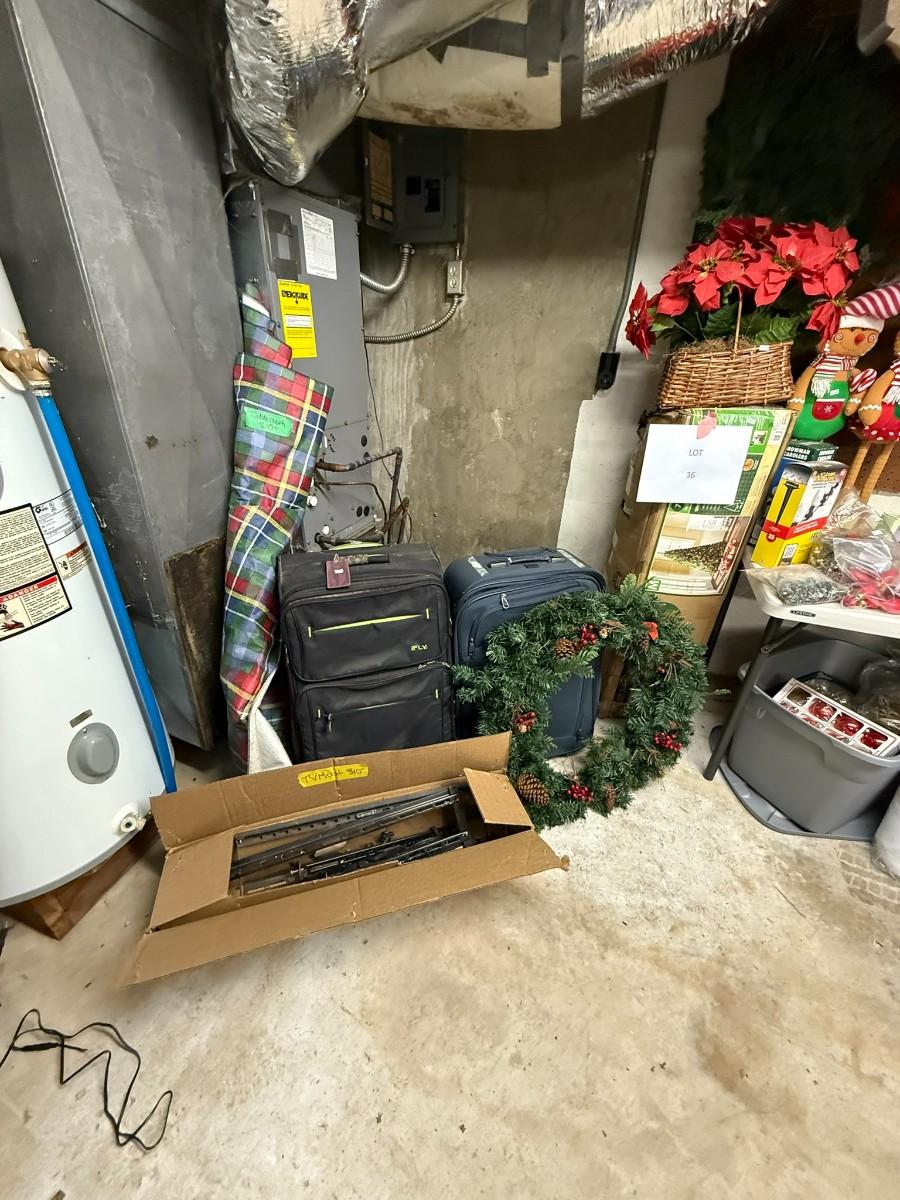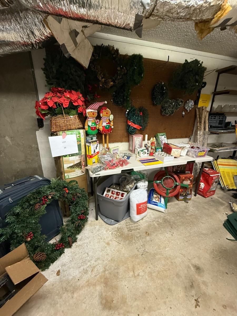 All items with Christmas area, luggage, wreath, table cloth, and TV Mount